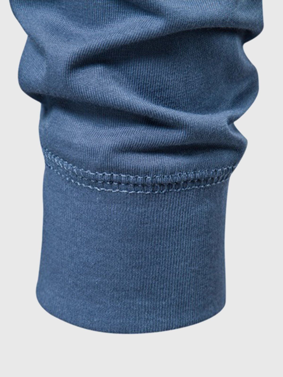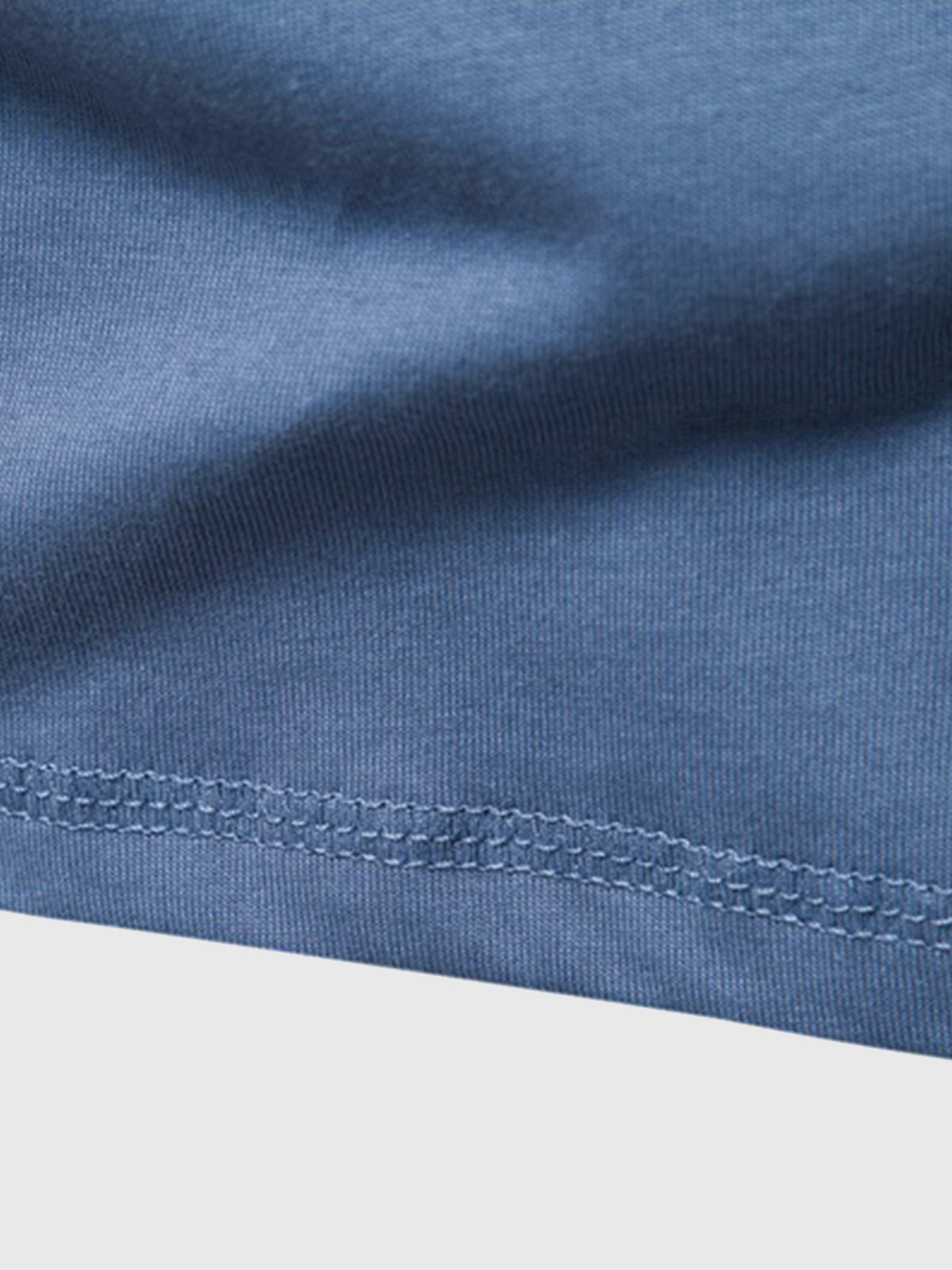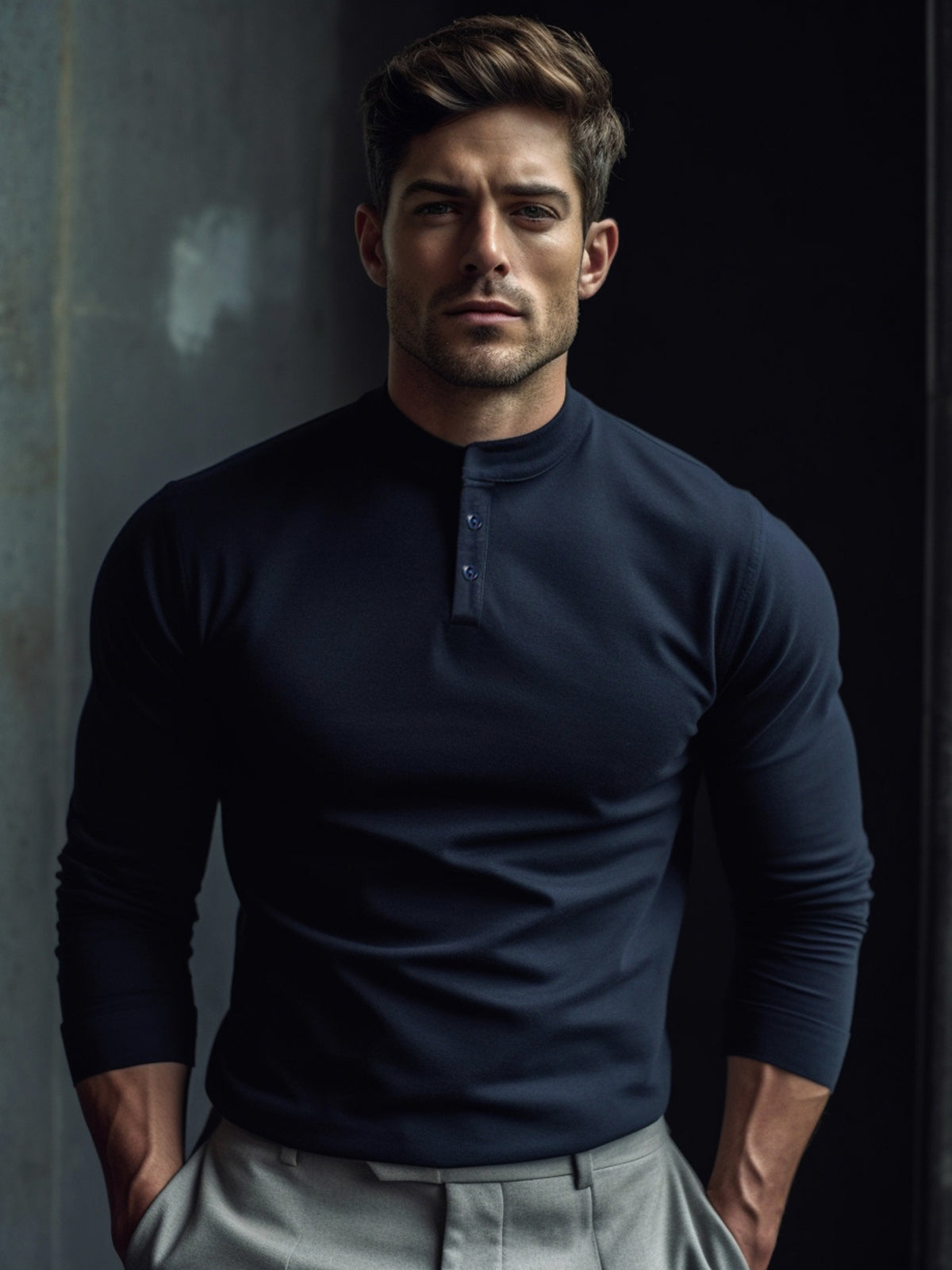 This is a cotton henley pullover long sleeve T-shirt in stretch breathable fabric with a stylish curved hem for versatile everyday style.