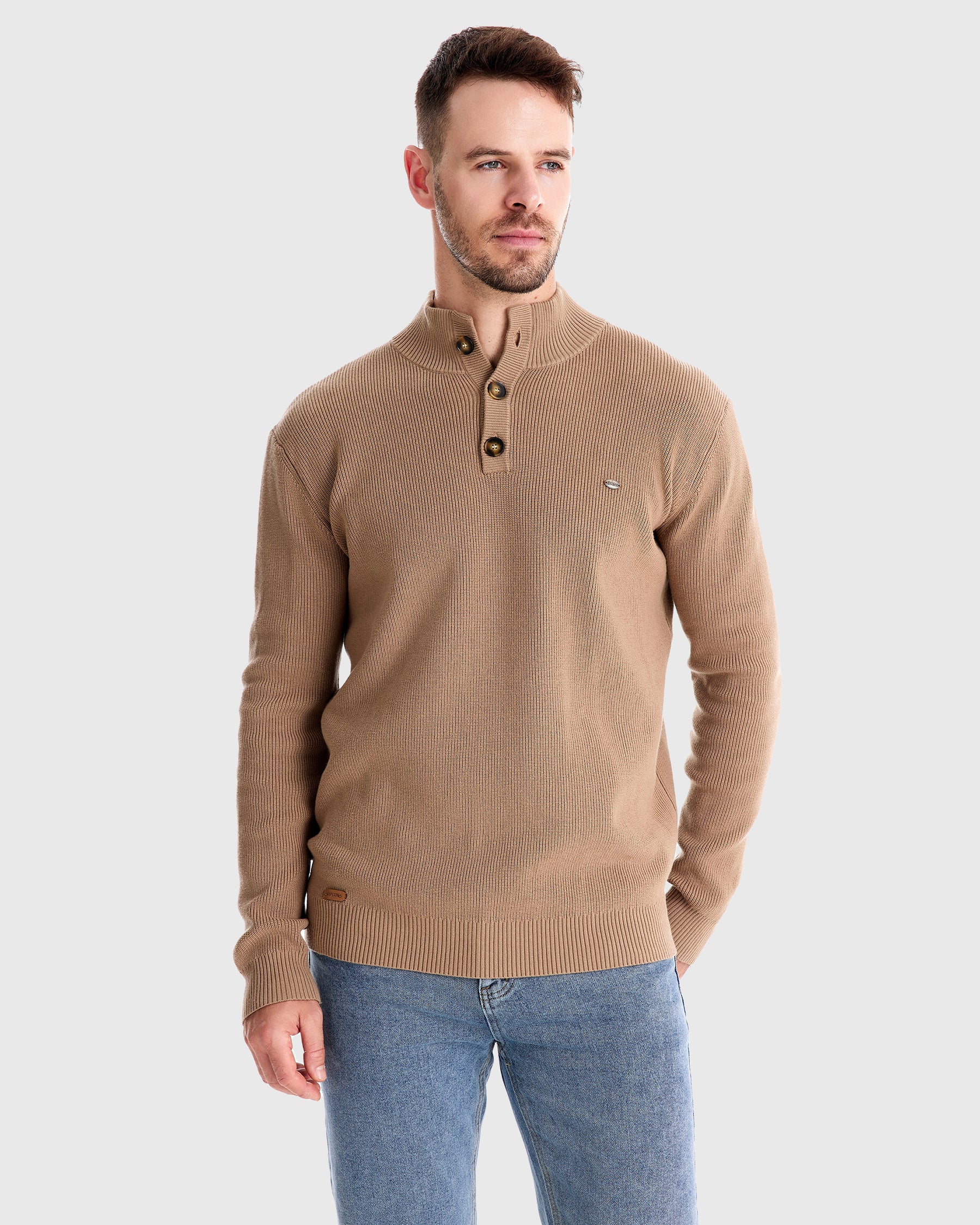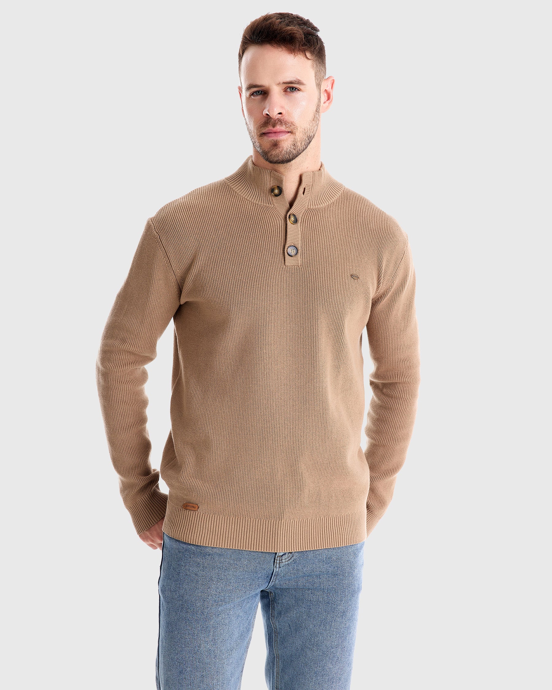 Dieser stilvolle Herrenpullover hat ein modernes Design mit einer glatten, beigen Strickstruktur. Der Stehkragen wird durch ein Knopfdetail betont, das sowohl Wärme als auch einen einzigartigen, modernen Look bietet. Er ist aus weichem, atmungsaktivem Stoff gefertigt und bietet den ganzen Tag über Tragekomfort, während die gerippten Bündchen und der Saum für eine bequeme Passform sorgen. Der vielseitige Farbton lässt sich leicht mit einer Vielzahl von Outfits kombinieren und eignet sich perfekt für legere und halbformelle Anlässe. Das dezente Markenlogo auf der Brust verleiht einen Hauch von Raffinesse und macht ihn zu einem Must-have für jede Garderobe.