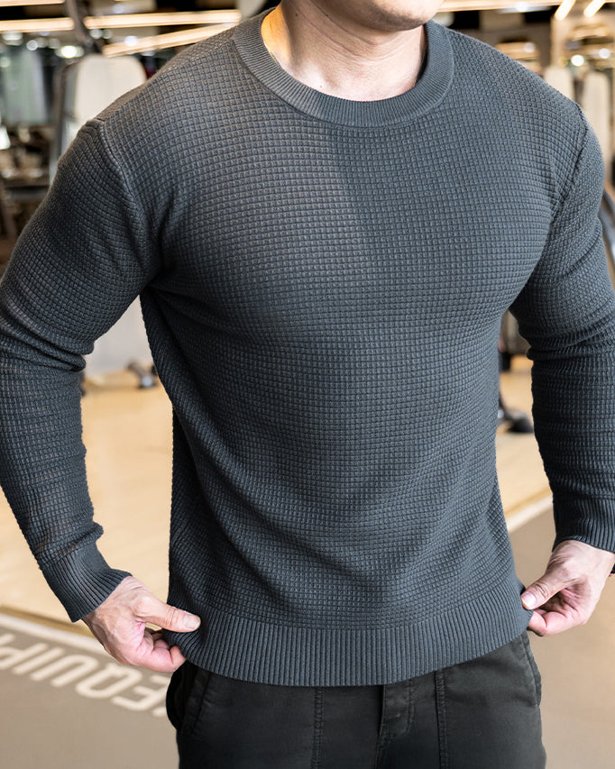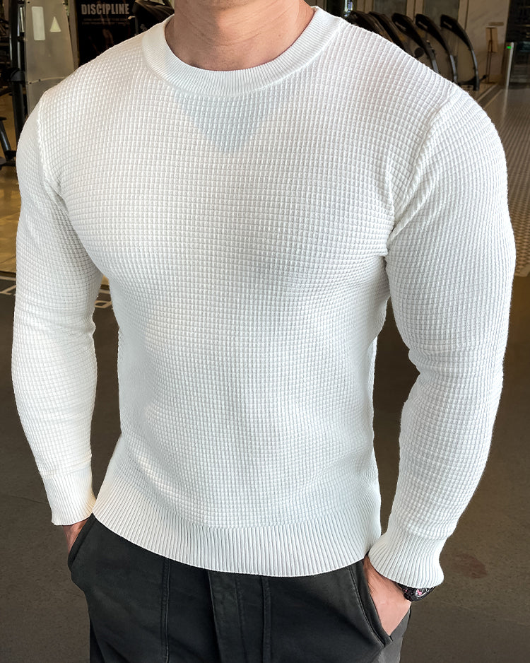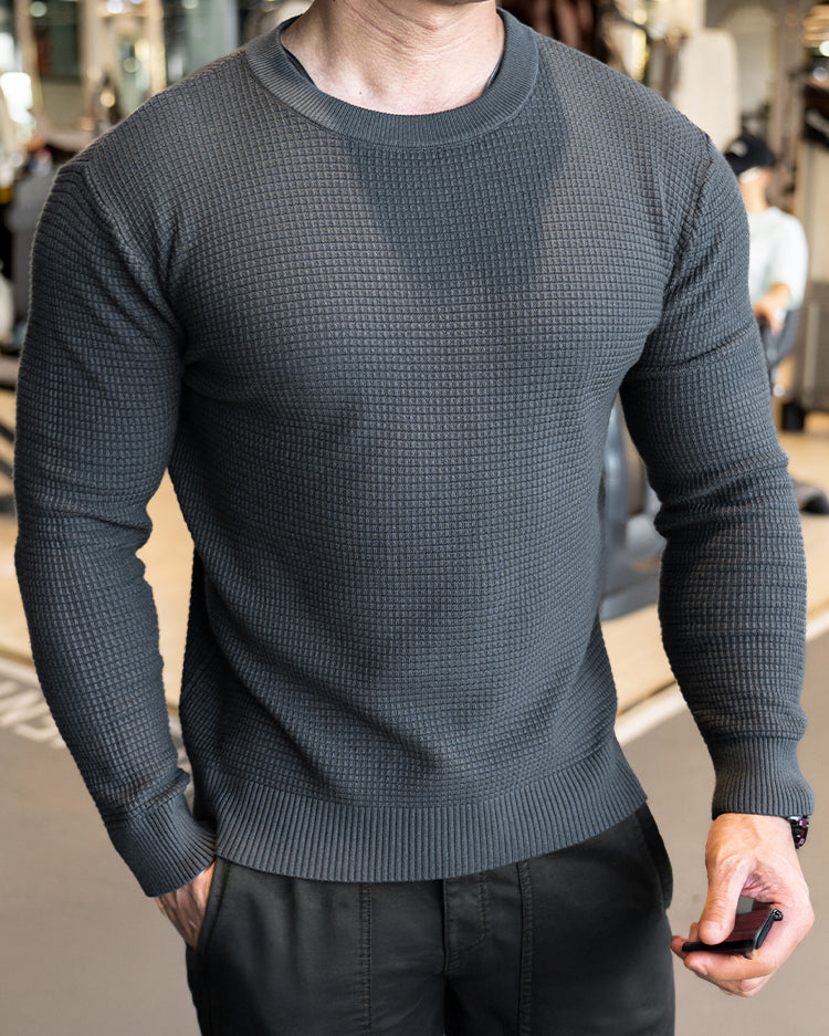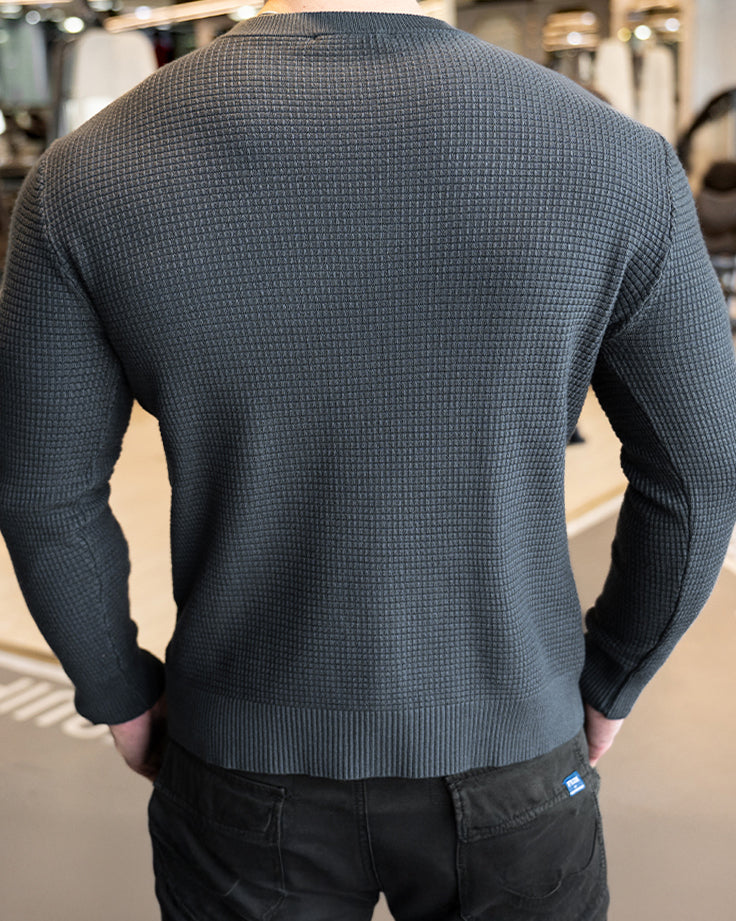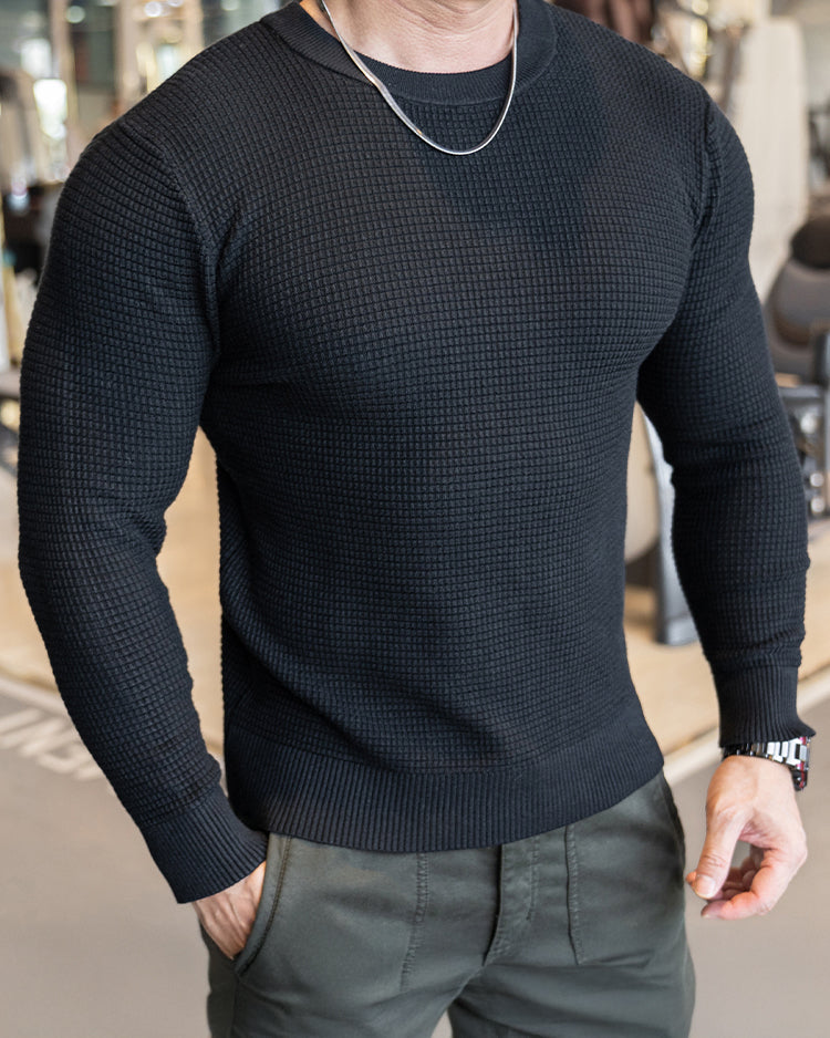 Raffinesse, Stil und Komfort in einem. Durch die Anwendung eines einzigartigen Strickmusters heben Sie sich mit subtilem und hochwertigem Modegeschmack von der Masse ab. Das minimalistische Design lässt jedoch Raum für Styling und Schichten mit anderen Artikeln. Eine komplizierte und einzigartige Mischung aus 3 Stoffen sorgt für Atmungsaktivität, Elastizität und ganztägigen Komfort. Der Pullover verfügt über das klassische Rundhalsdesign mit geripptem Kragen, Bündchen und Saum für eine raffiniertere Silhouette.