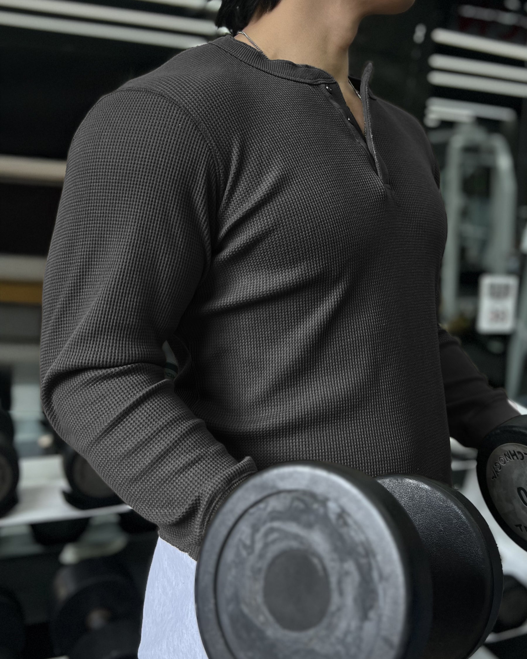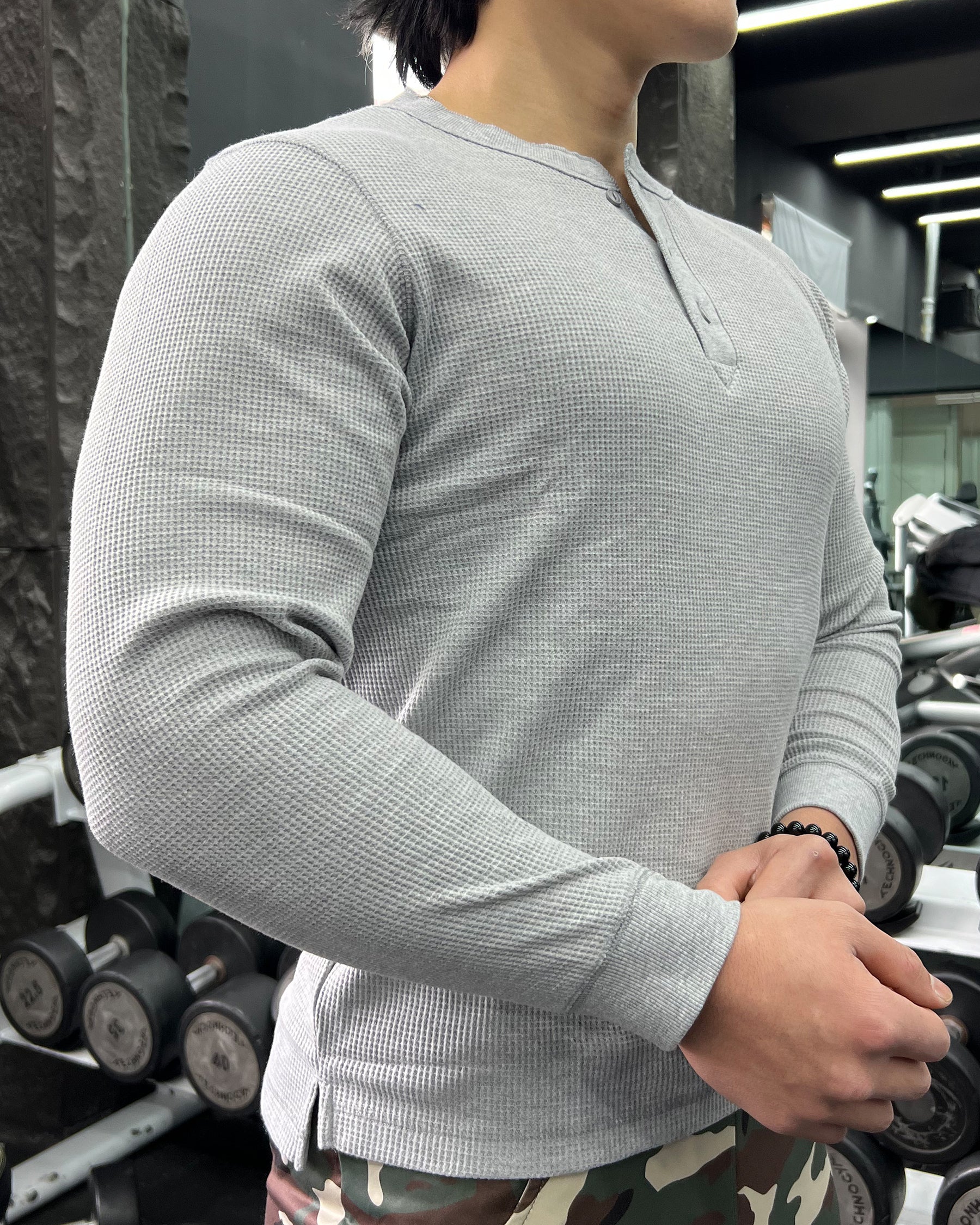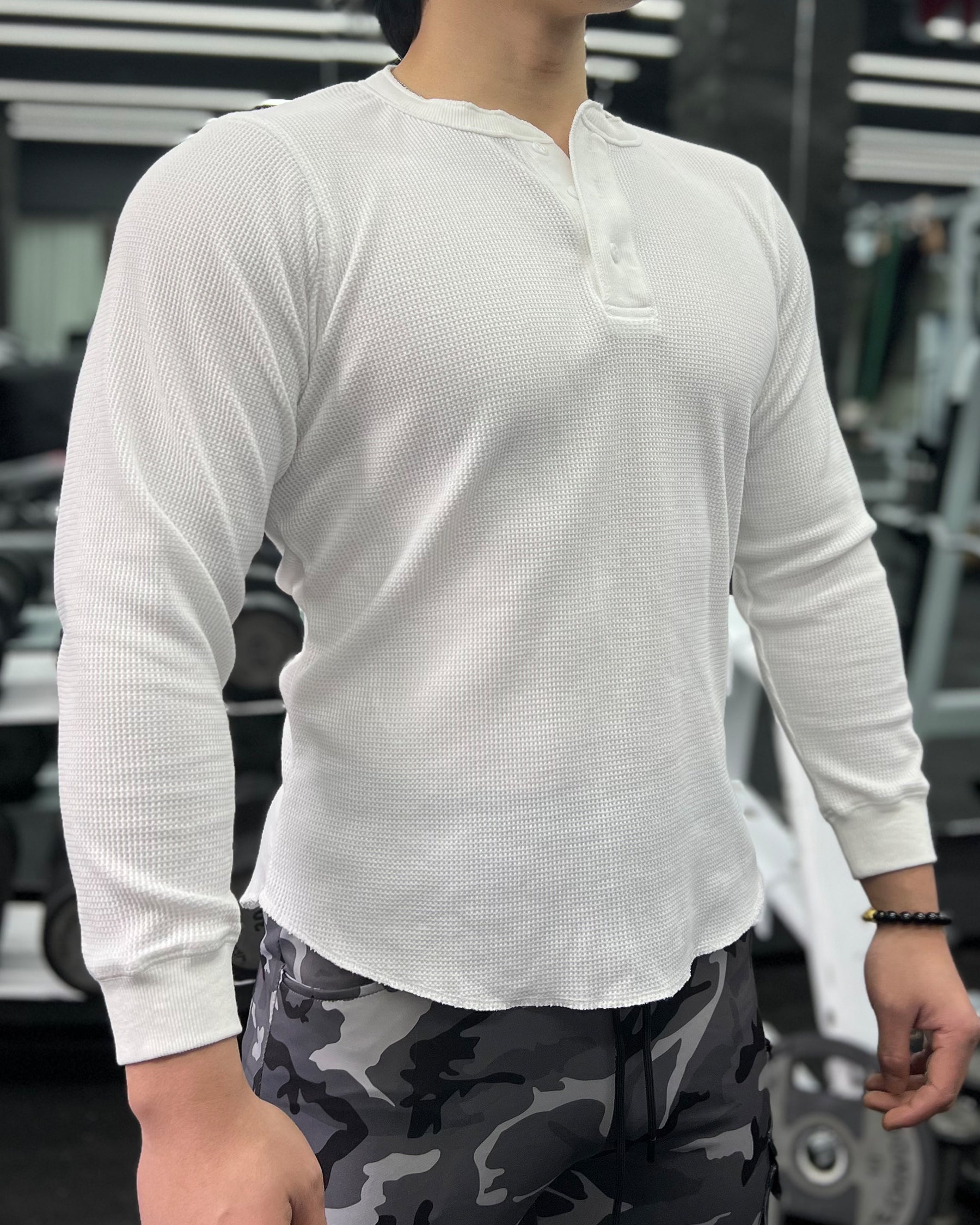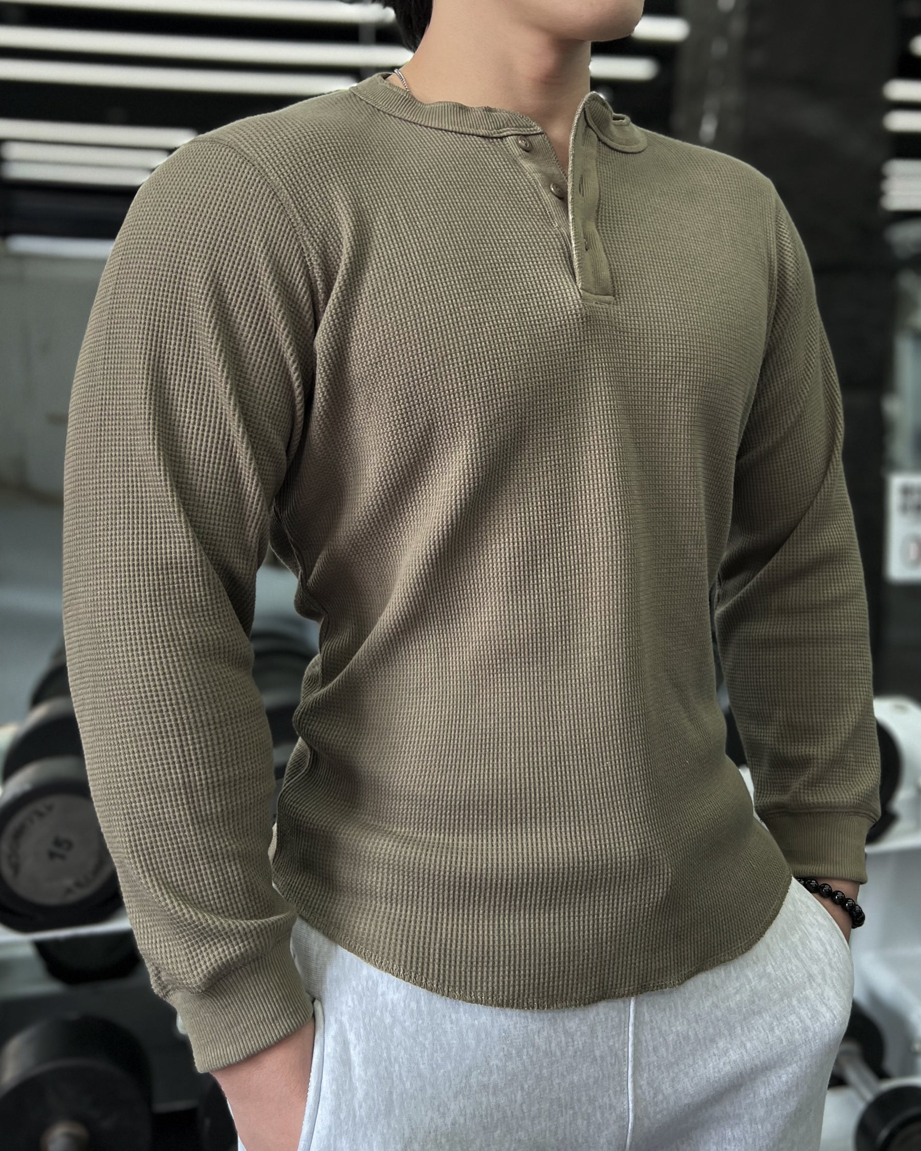 Strukturierter Henley-Kragen mit Waffelstrick und langen Ärmeln