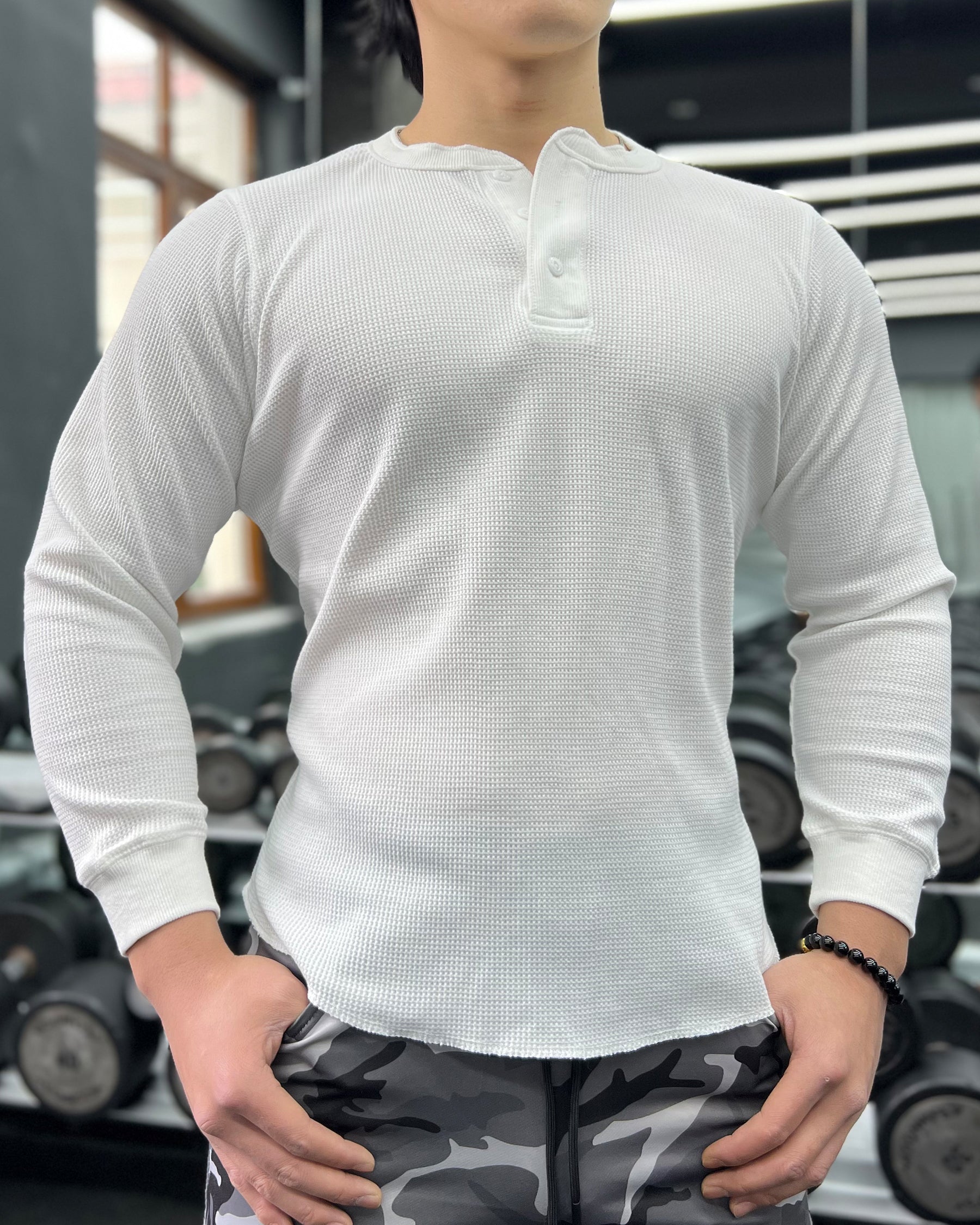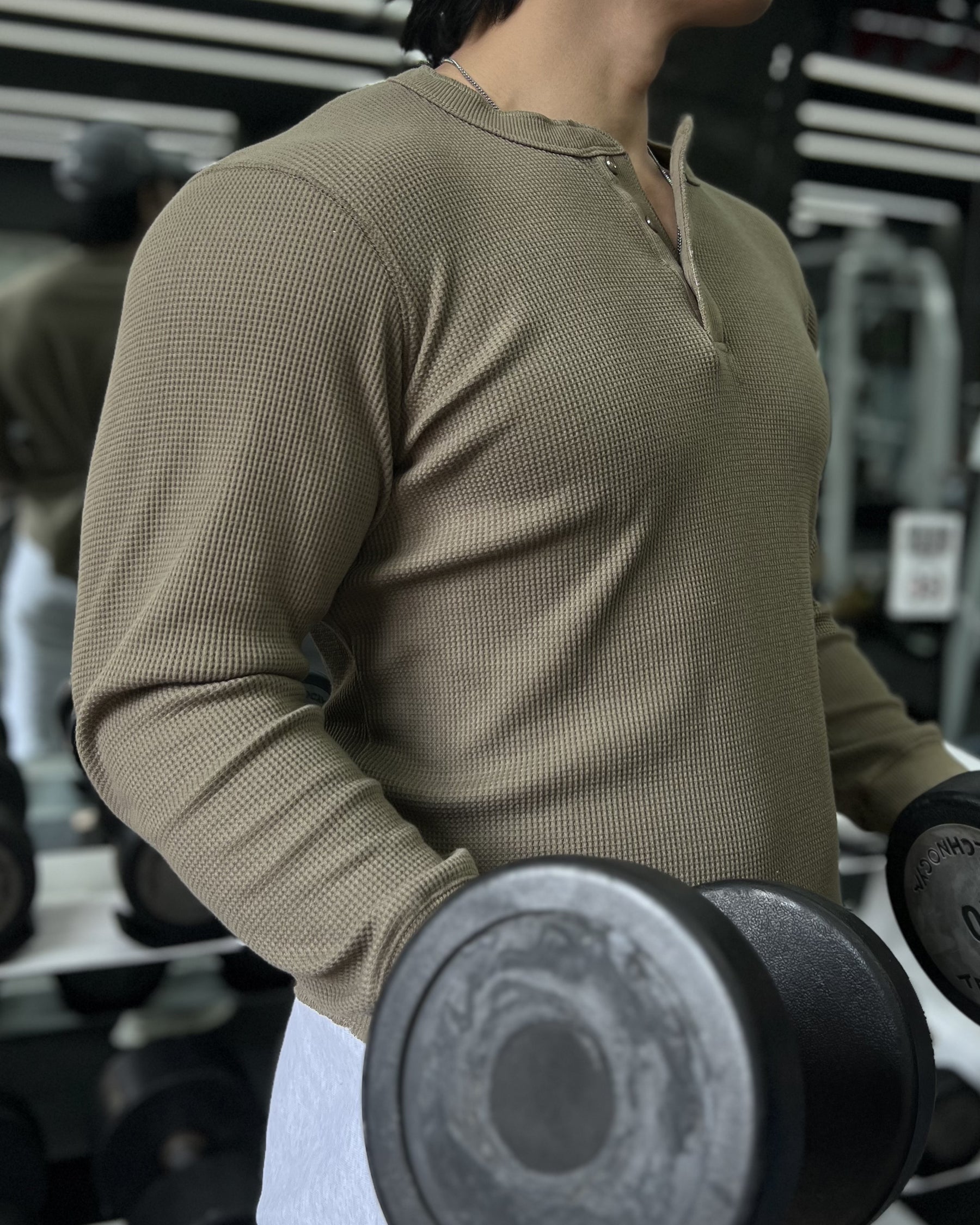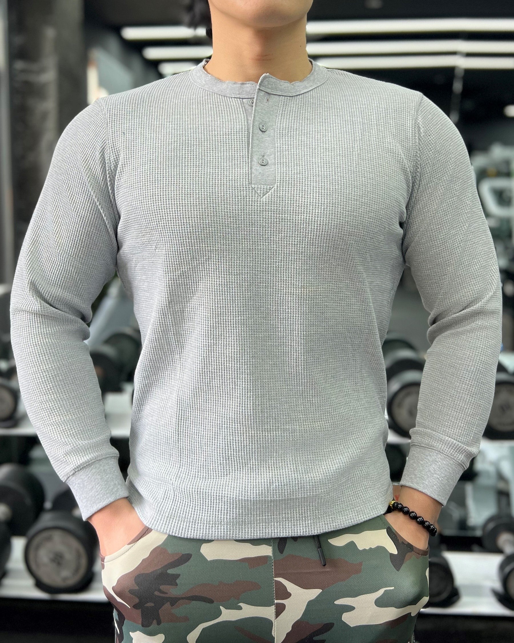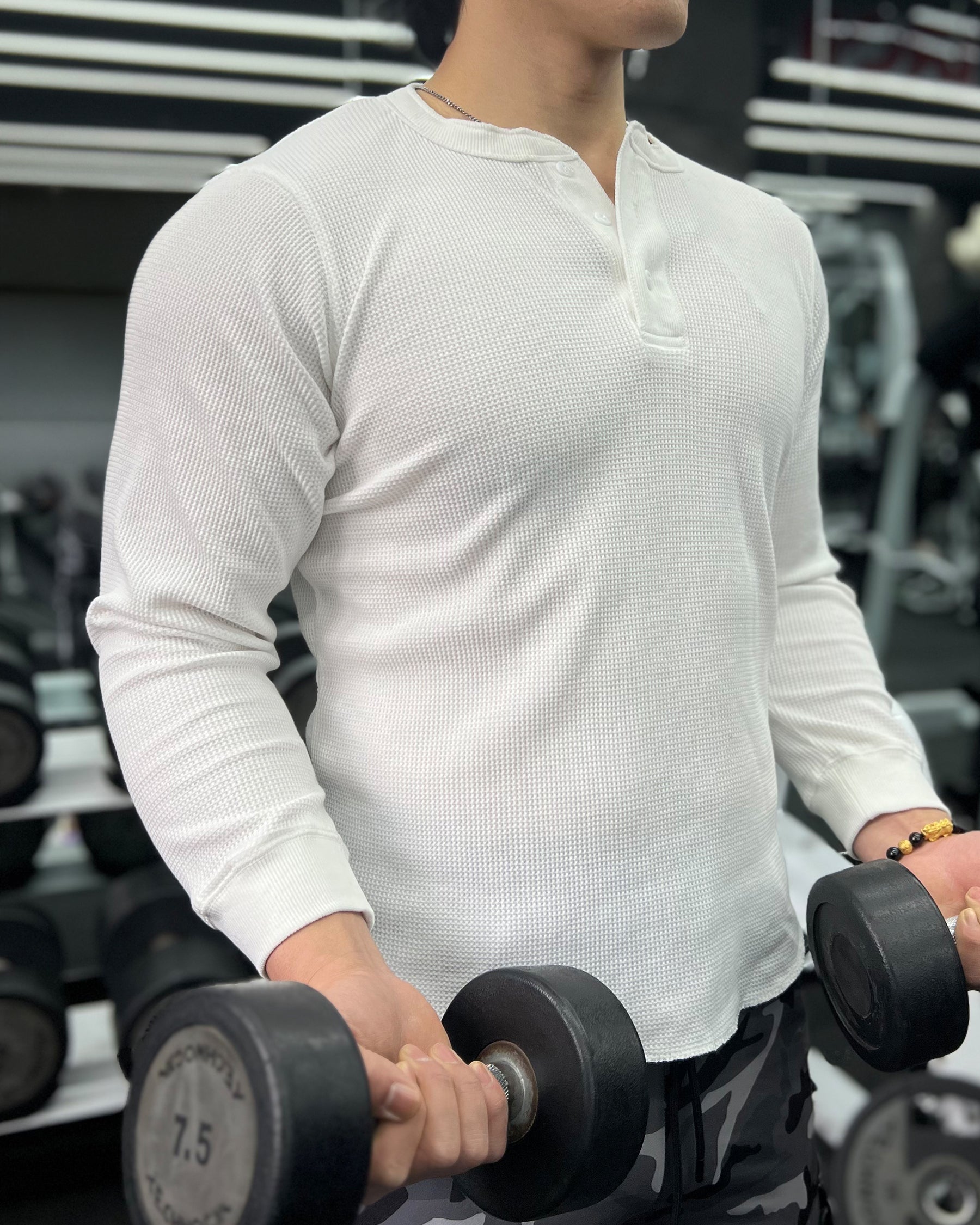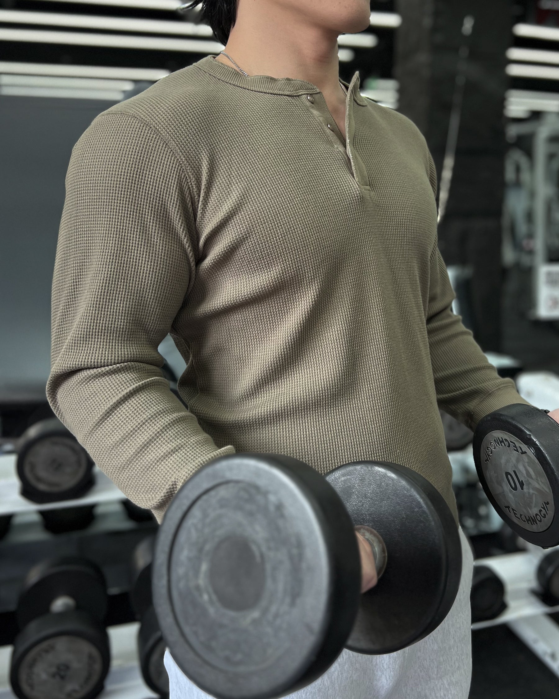 Strukturierter Henley-Kragen mit Waffelstrick und langen Ärmeln