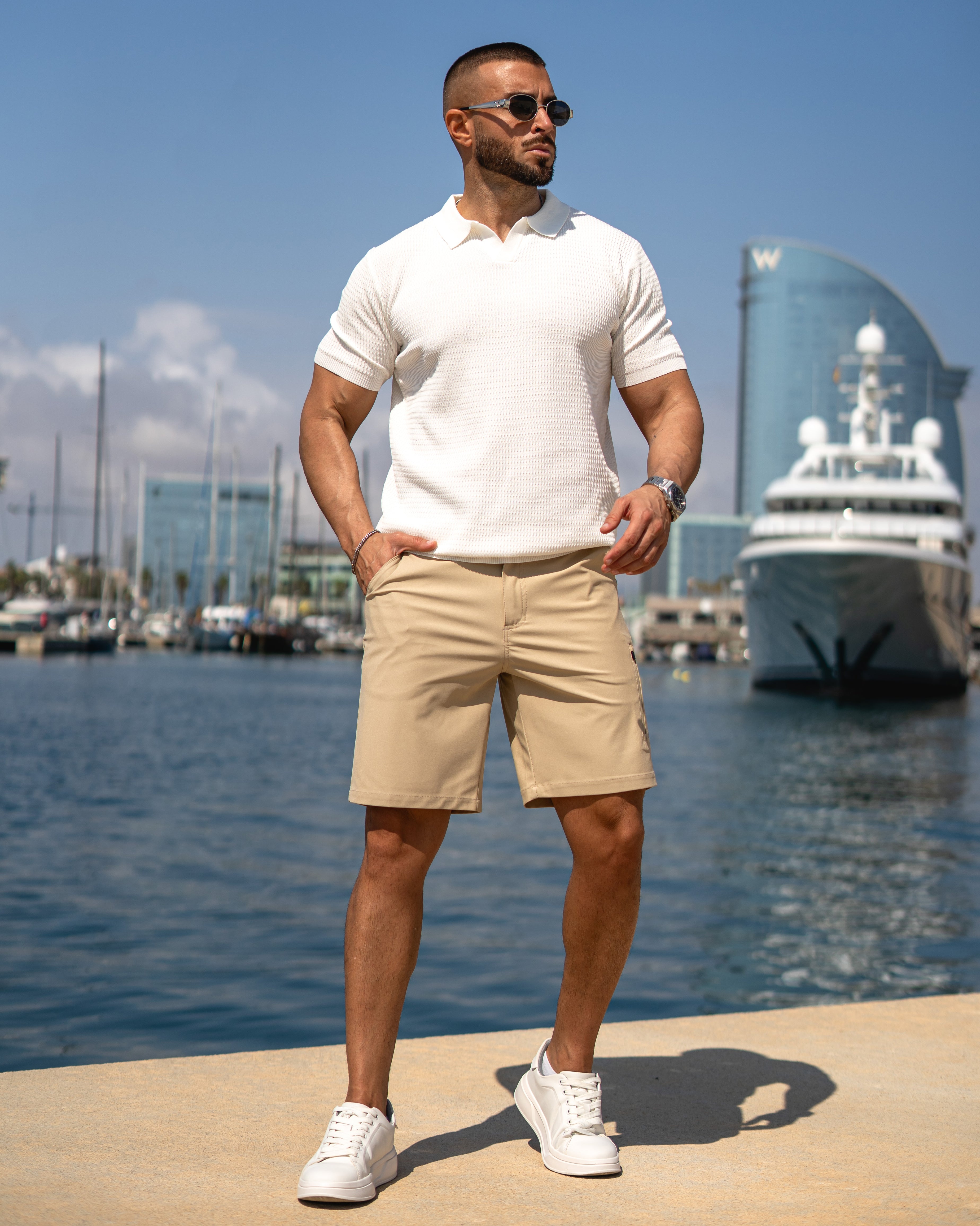 Schlüpfen Sie mit unseren Chino-Shorts in die perfekte Mischung aus entspanntem Komfort und raffiniertem Stil. Diese Shorts mit echter Muskelpassform machen eine größere Größe für Ihre Oberschenkel überflüssig und bieten einen maßgeschneiderten Look, der Ihrer Figur schmeichelt. Verstärkte Nähte verleihen diesem vielseitigen Kleidungsstück einen Hauch von Robustheit und stellen sicher, dass es mit Ihrem aktiven Lebensstil Schritt halten kann.