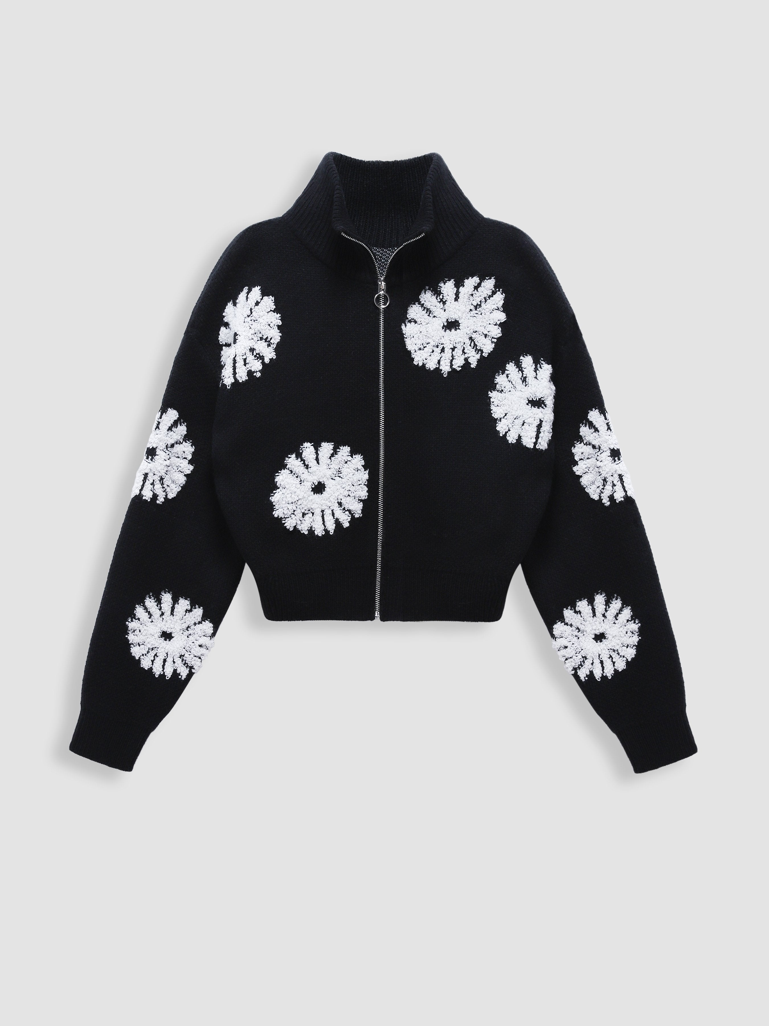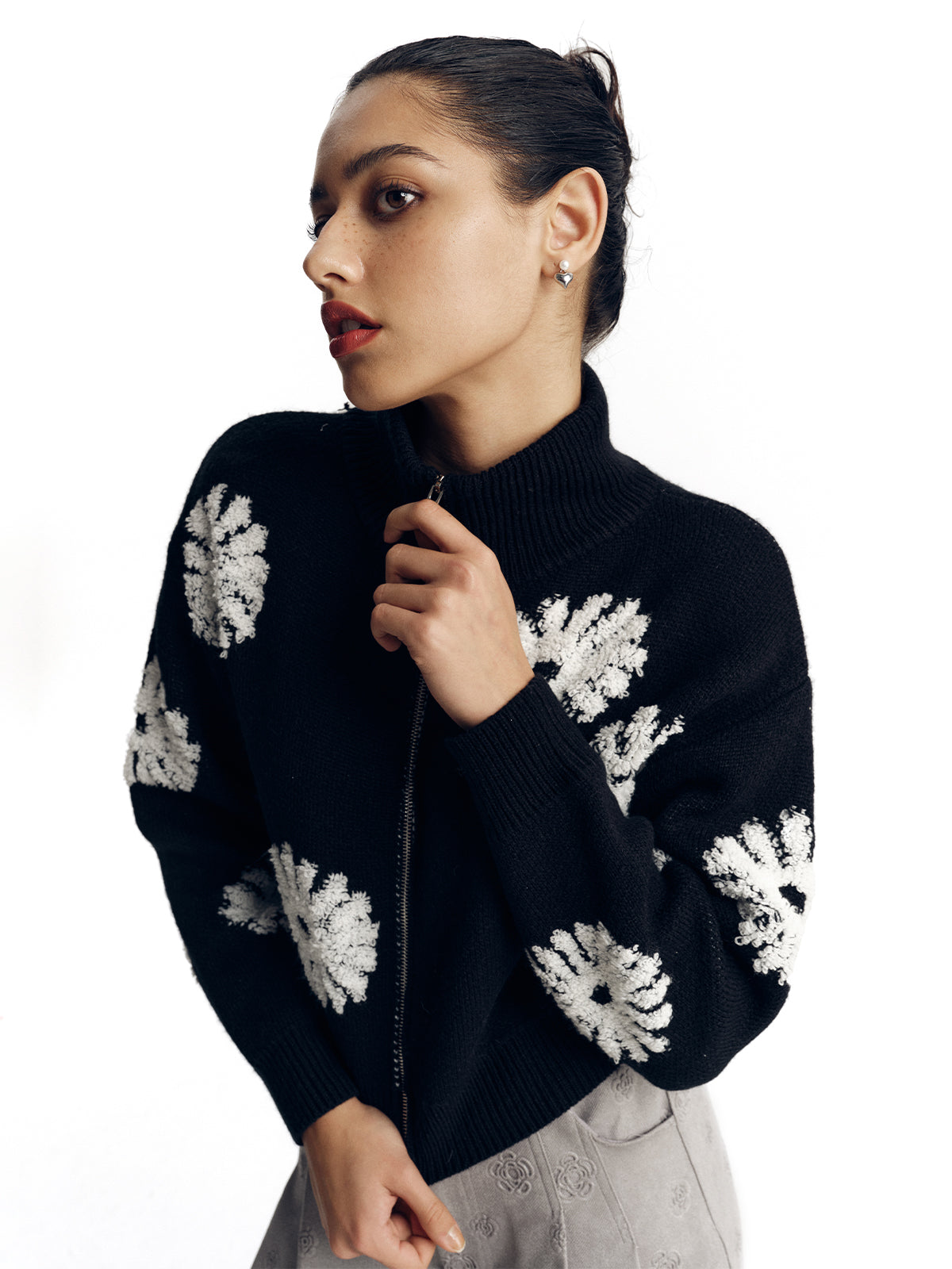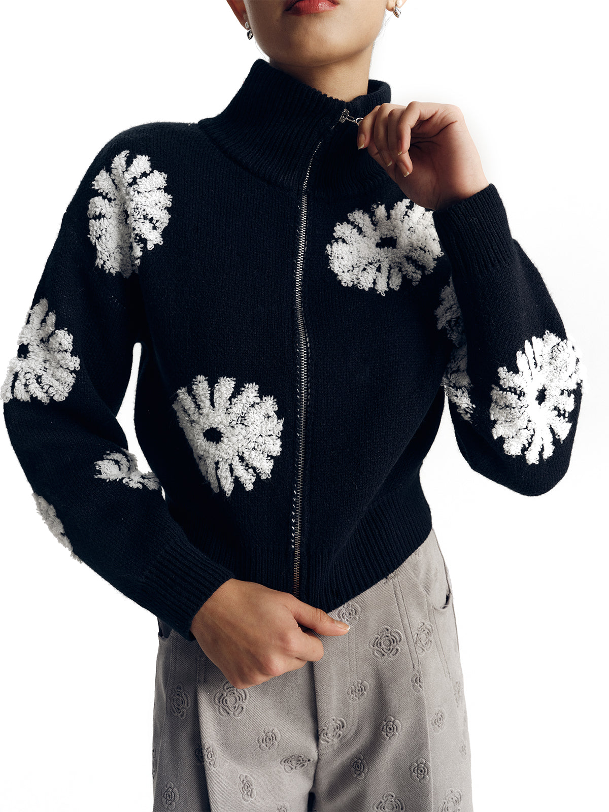 Floral Jacquard Zippered Cardigan - Ahaselected