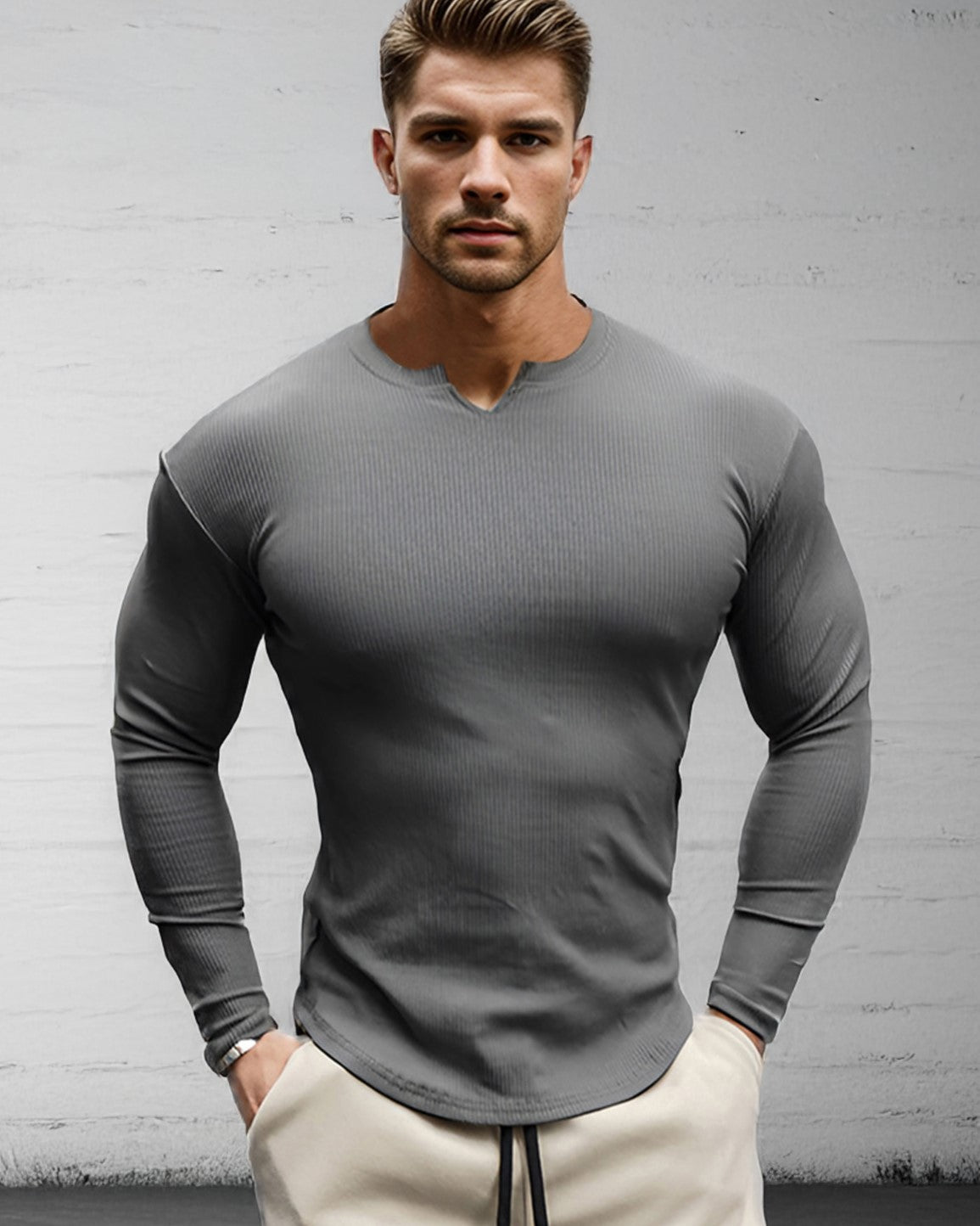 - Der geteilte V-Ausschnitt ermöglicht einfaches An- und Ausziehen und sorgt für einen lässigen, eleganten Stil.