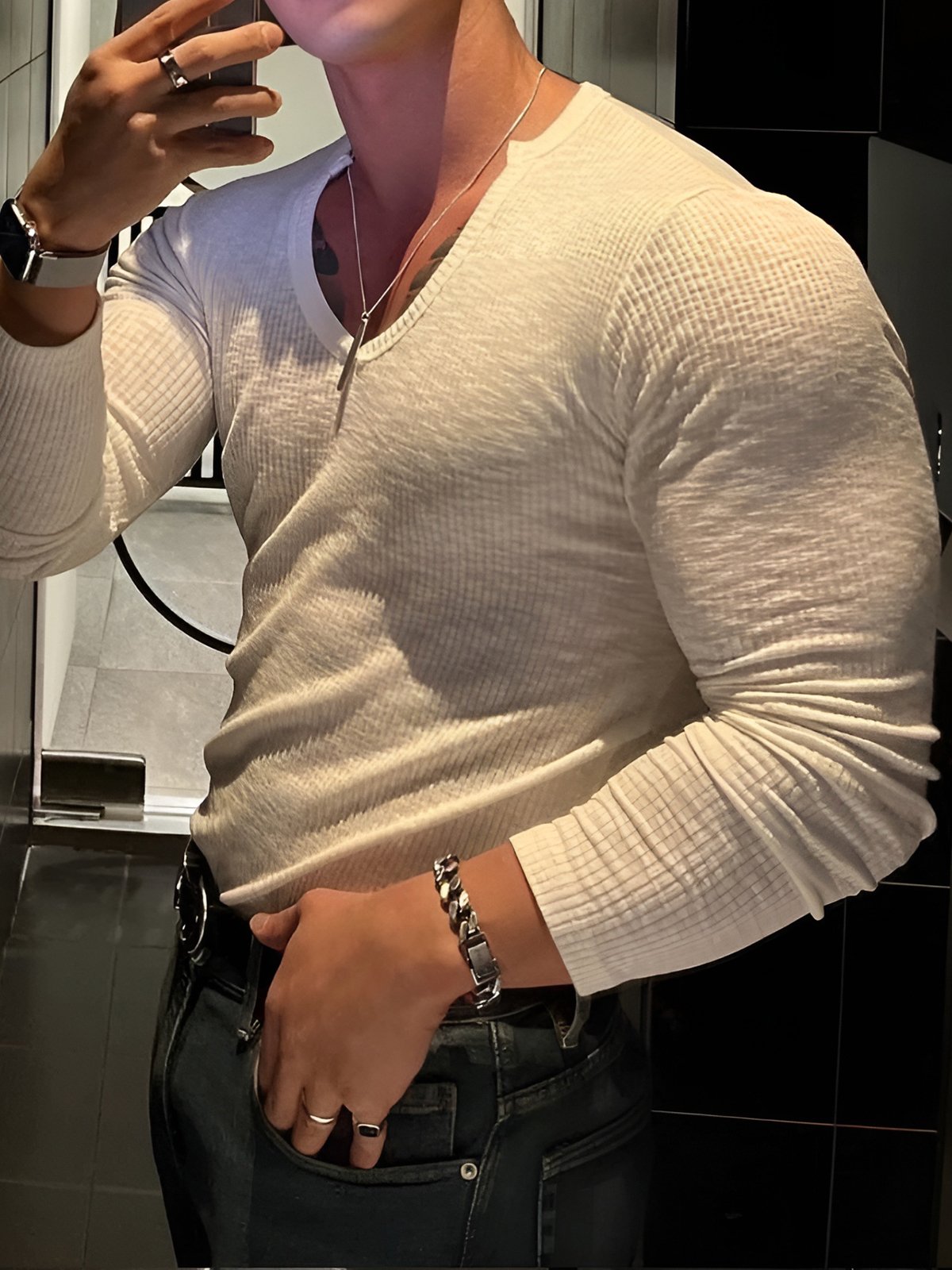 M's Rib Texture Langarm T-Shirt V-Ausschnitt Rundhals