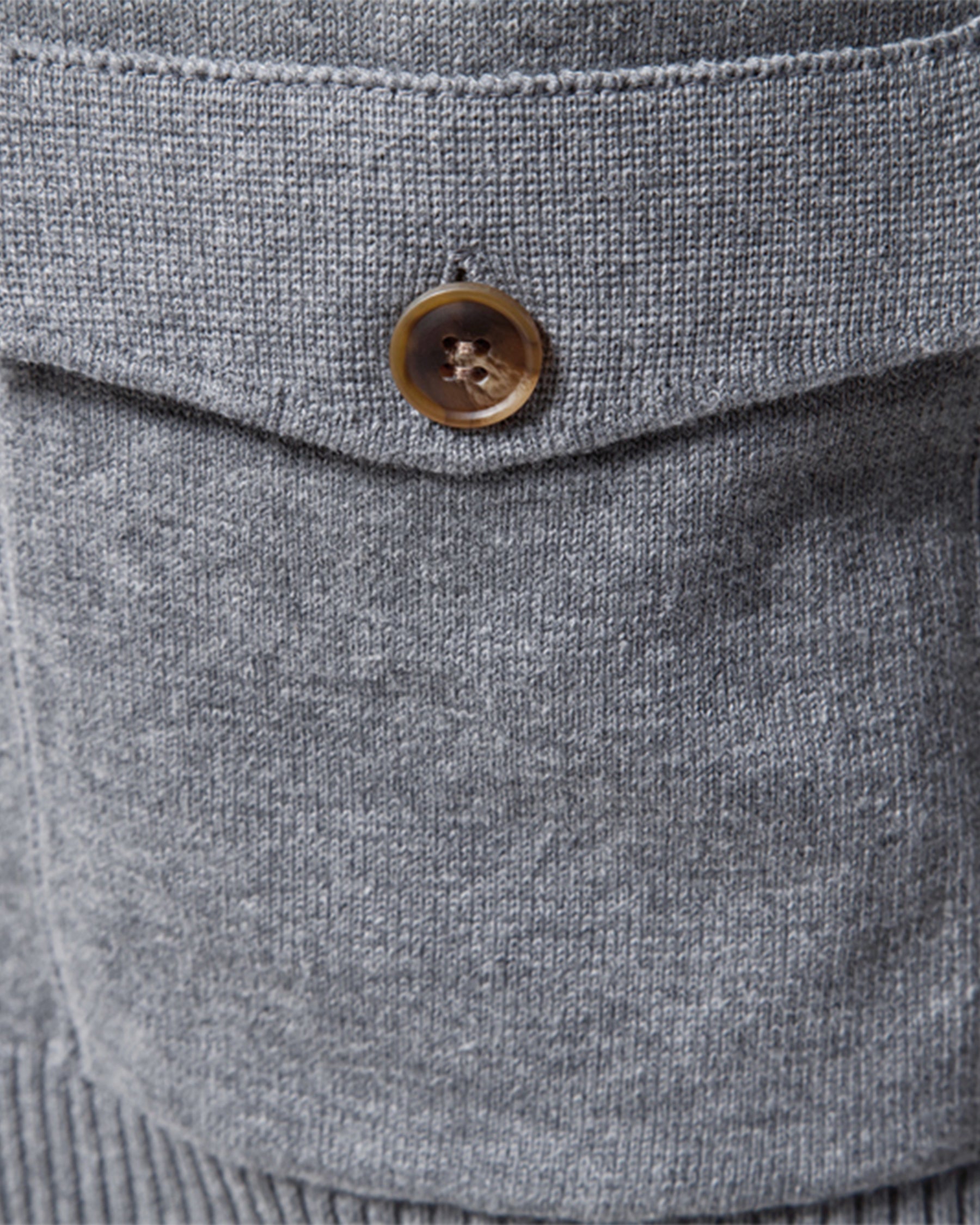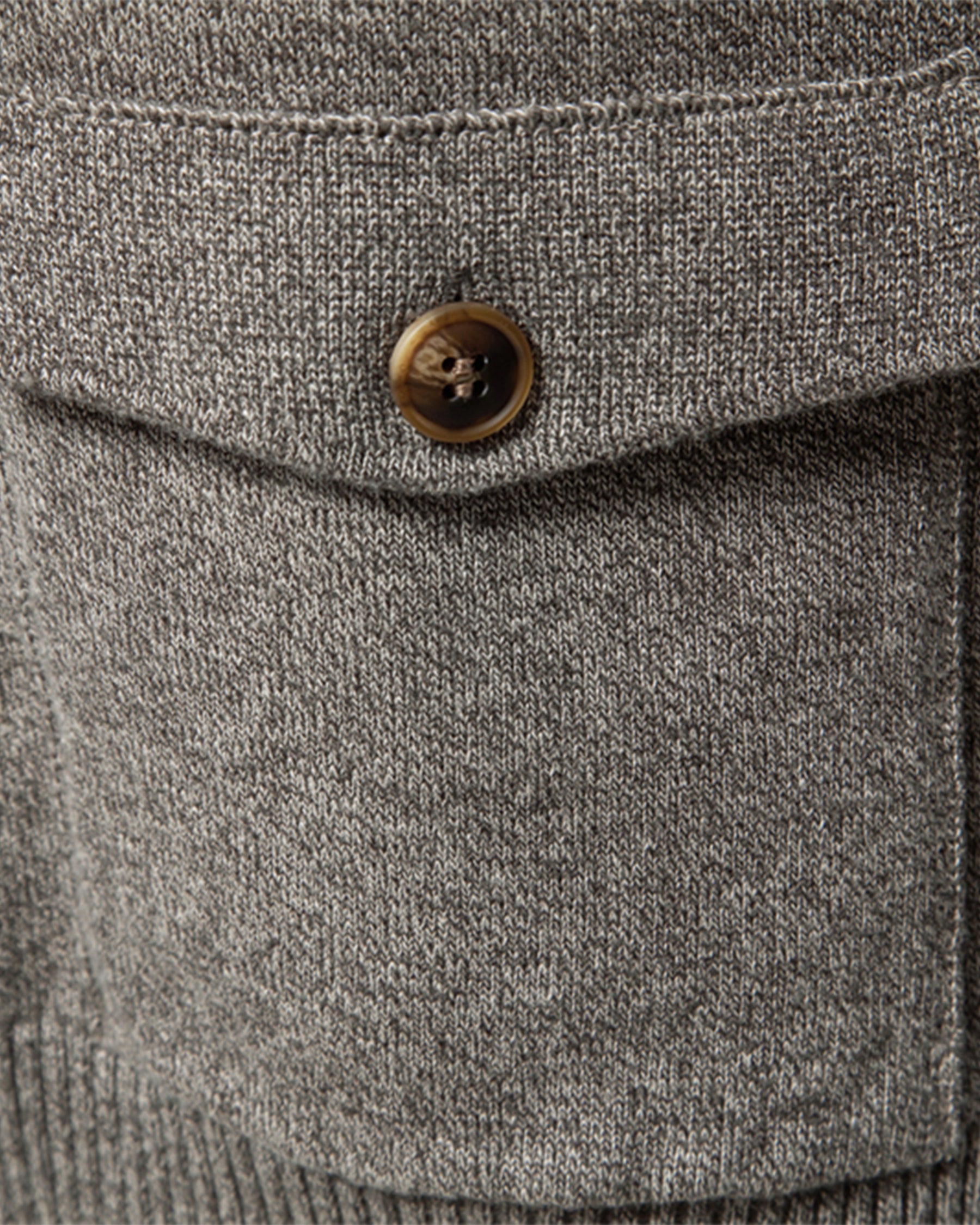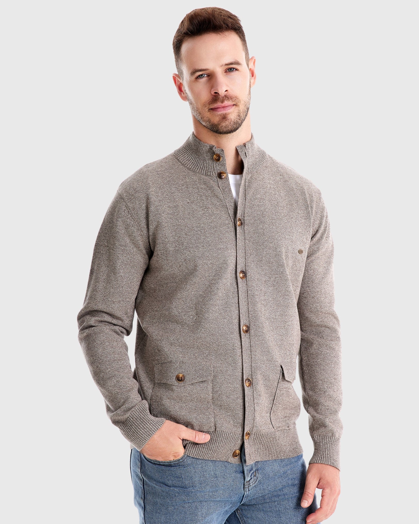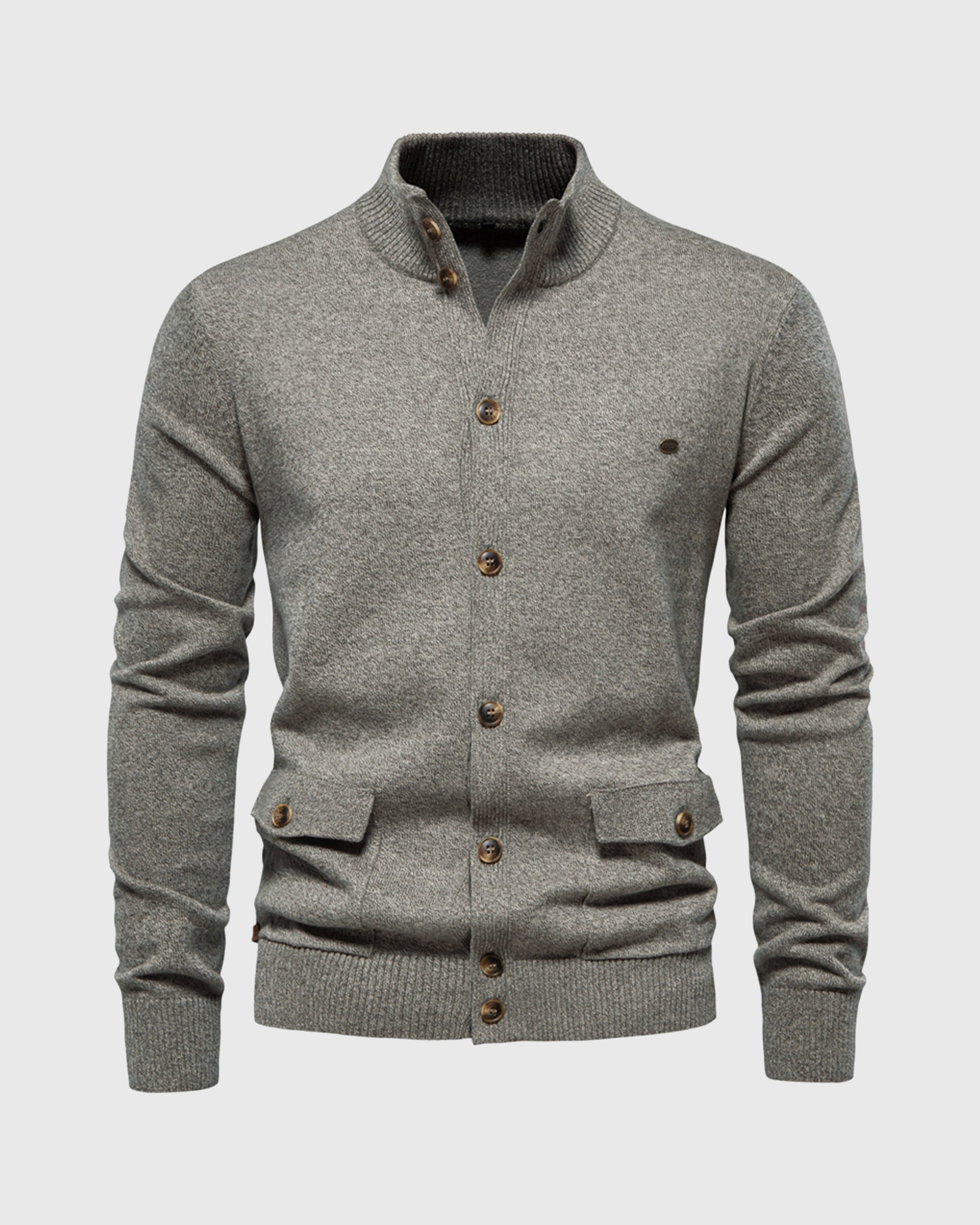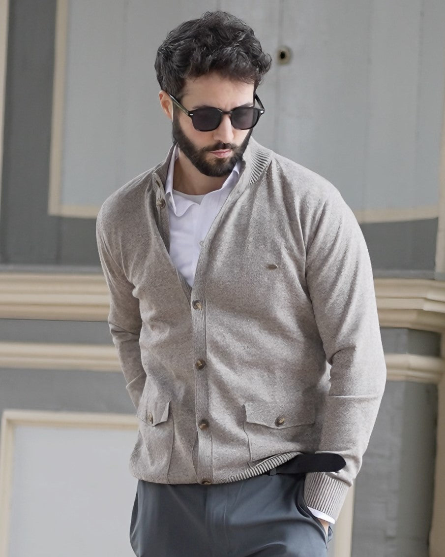 Diese hellgraue Strickjacke für Herren vereint Stil und Funktionalität. Sie verfügt über einen Stehkragen, einen Knopfverschluss vorne und zwei untere Taschen. Mit ihrer schmalen Passform und dem dezenten Markenlogo ist sie vielseitig einsetzbar für legere und halbformelle Anlässe. Der mittelschwere Stoff bietet Komfort und Anpassungsfähigkeit für verschiedene Jahreszeiten und macht sie zu einem unverzichtbaren Kleidungsstück.