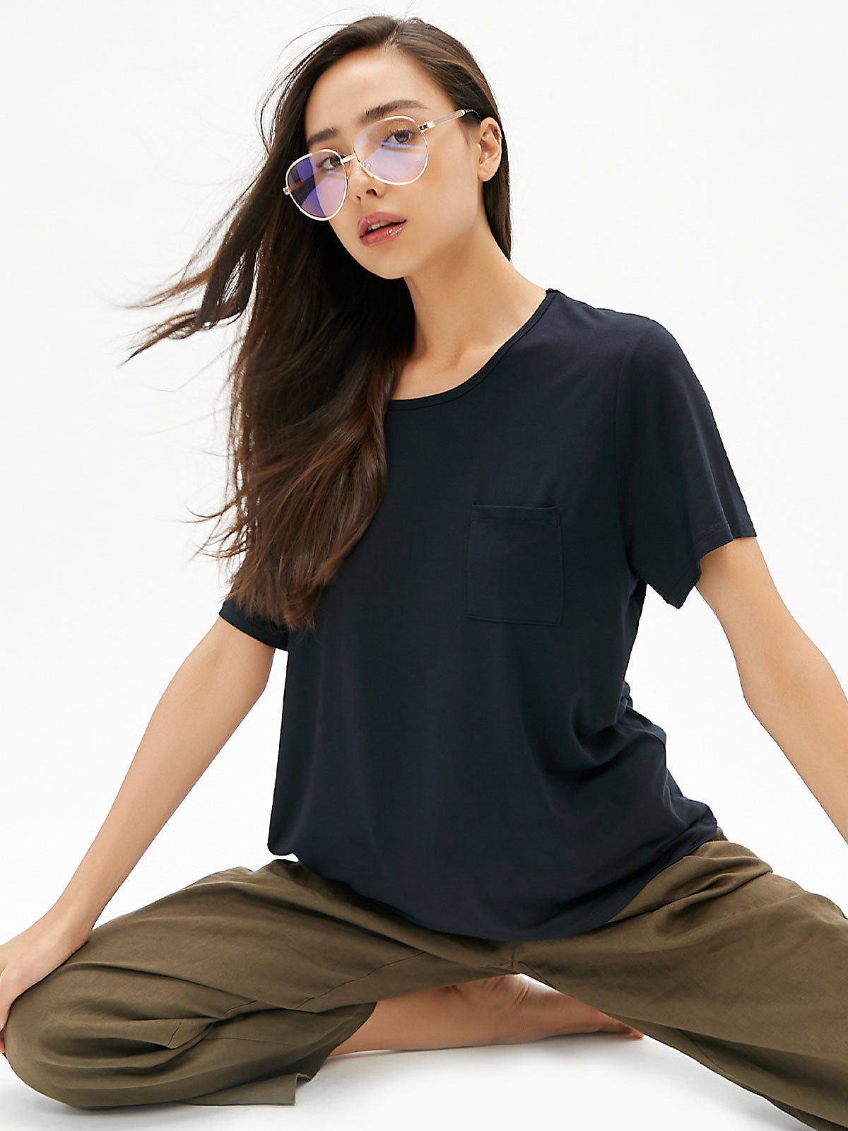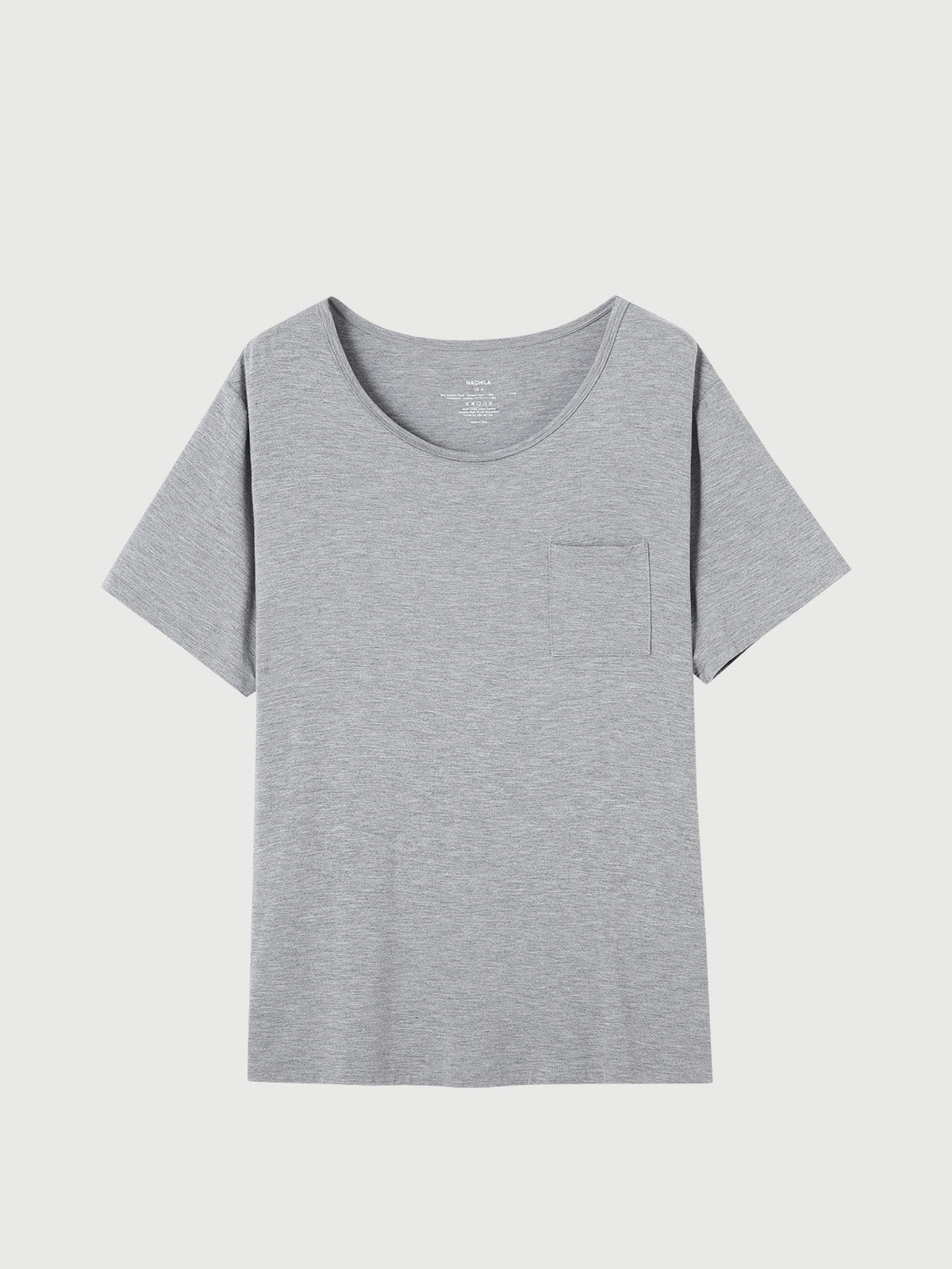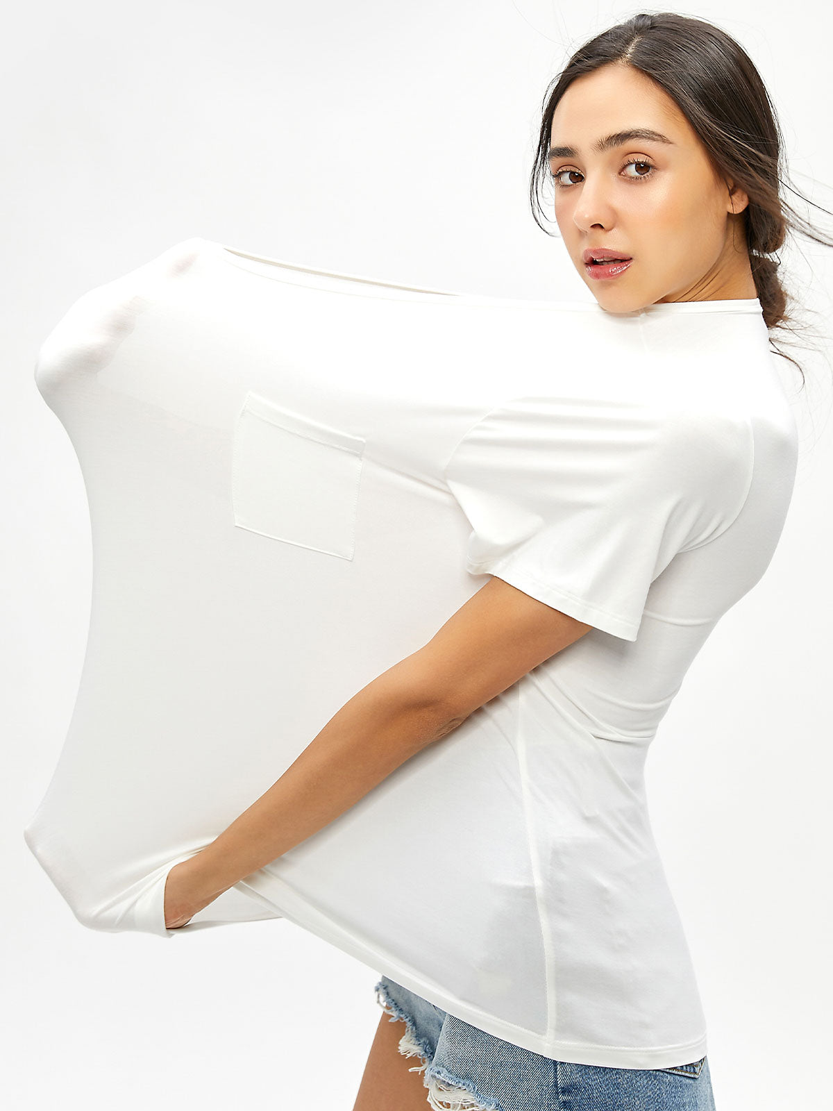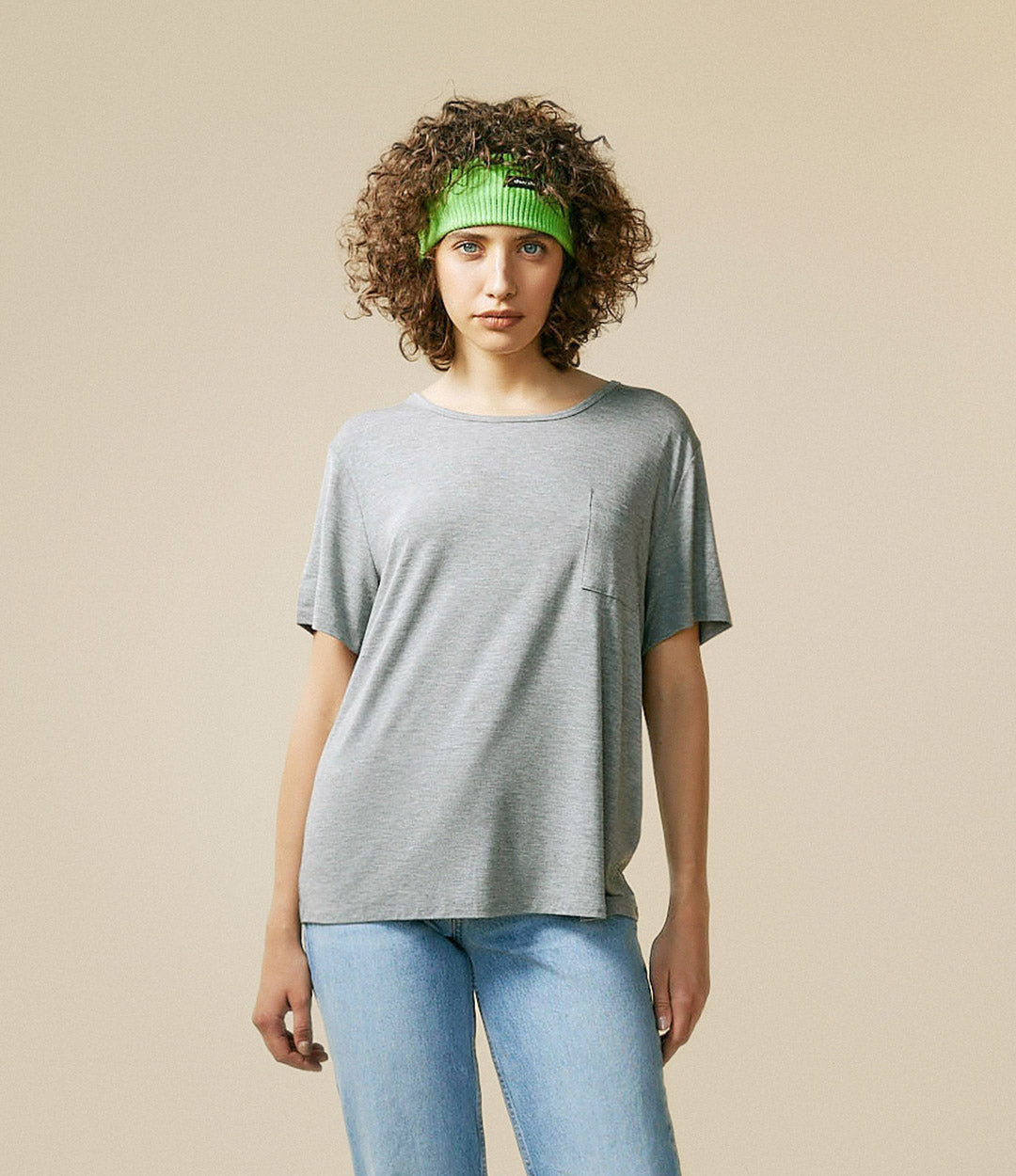 Dies ist ein T-Shirt mit Tasche. Es besteht aus umweltfreundlicher Bambusfaser und Elasthan.