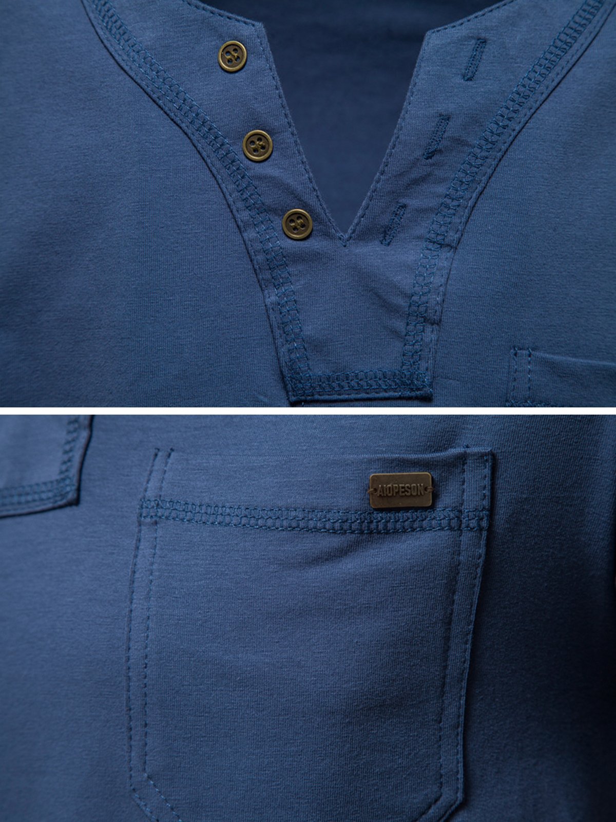 - Henley collar with three-button front placket for unique look