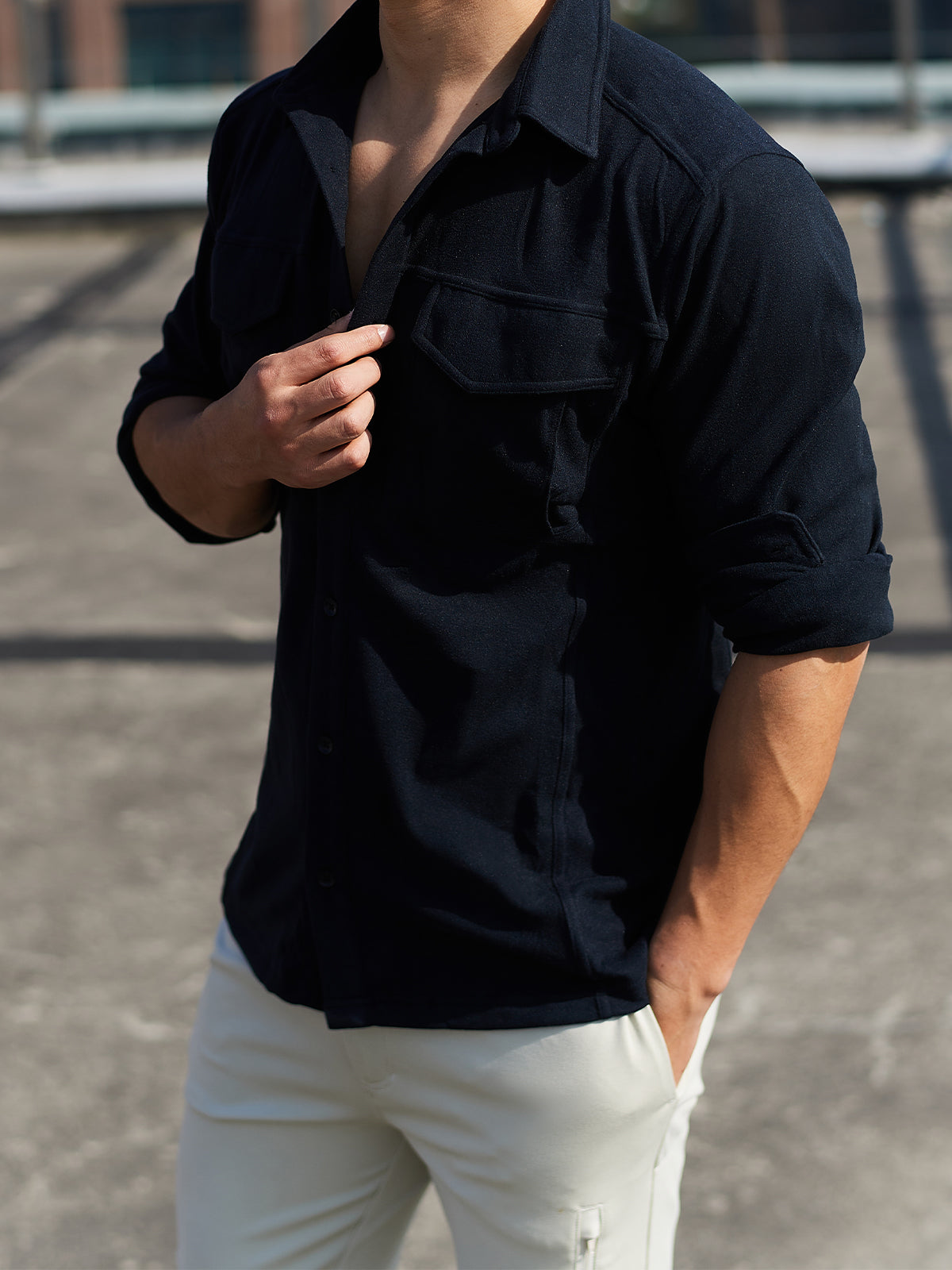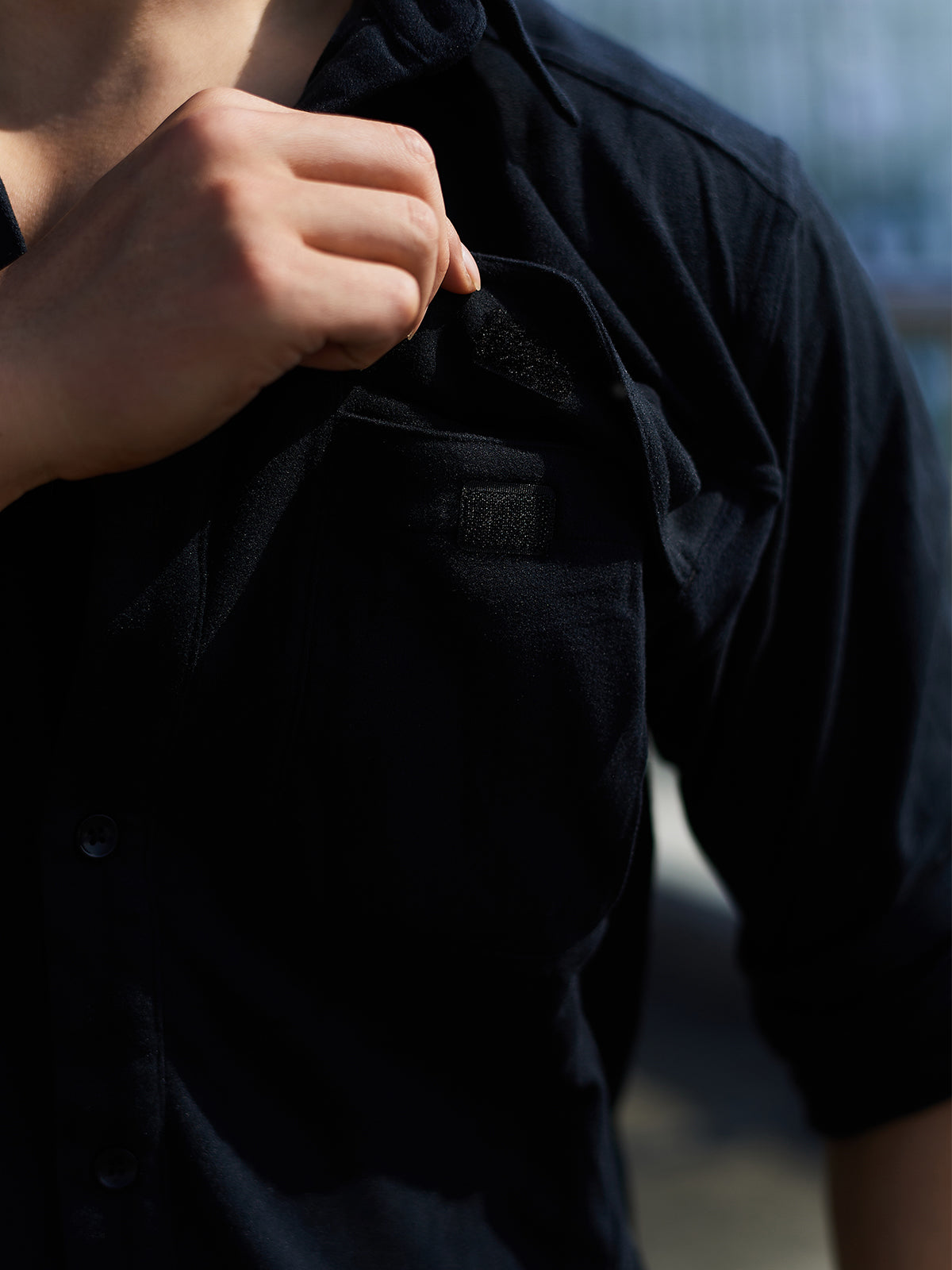 The TacticalWarm Pro Fleece Shirt is designed for outdoor enthusiasts seeking both warmth and functionality. Crafted from fleece and wicking fabric, it ensures comfort in various settings. The practical chest pockets with hook/loops allow one-handed access, adding efficiency to on-the-go activities. With a fold-down collar and collar stand, the shirt offers versatility in style, maintaining a classic button-down look.