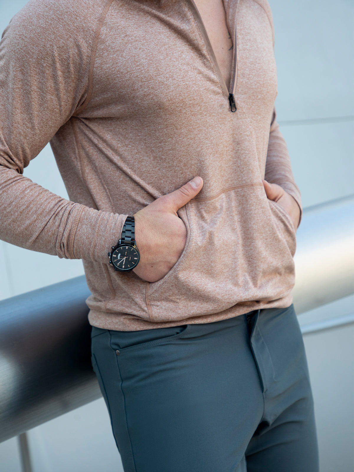This men's hoodie was designed for cozy functionality. The four-way stretch fabric keeps you cool and mobile, while the roomy hood, kangaroo pocket, and half-zip closure add convenience. Durable stitching ensures the hoodie will provide lasting comfort whether lounging or on-the-go. With its soft feel and thoughtful details, this hoodie combines laidback style with practicality.