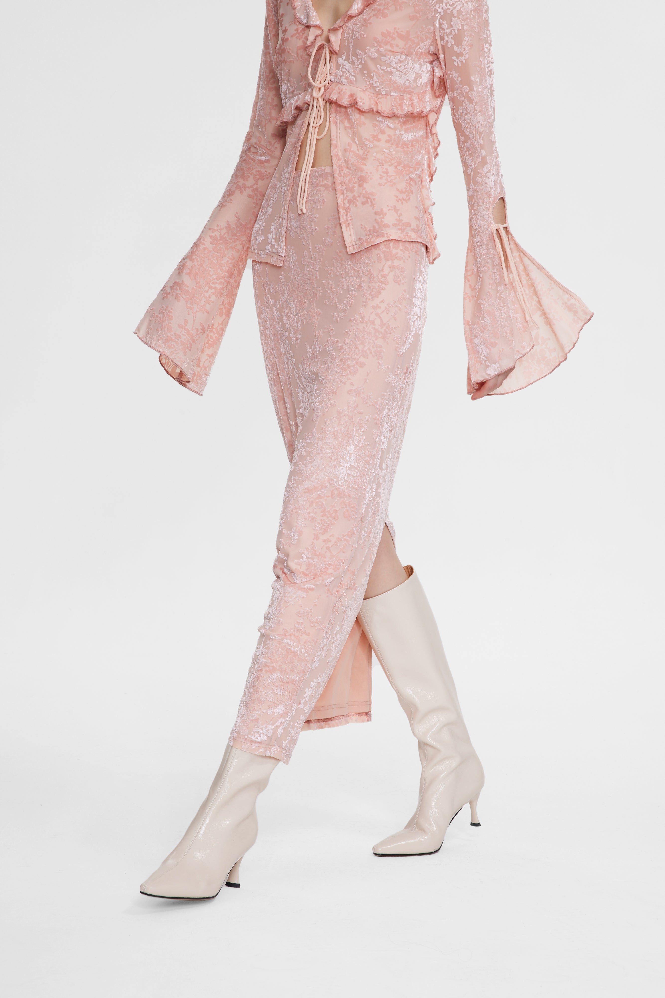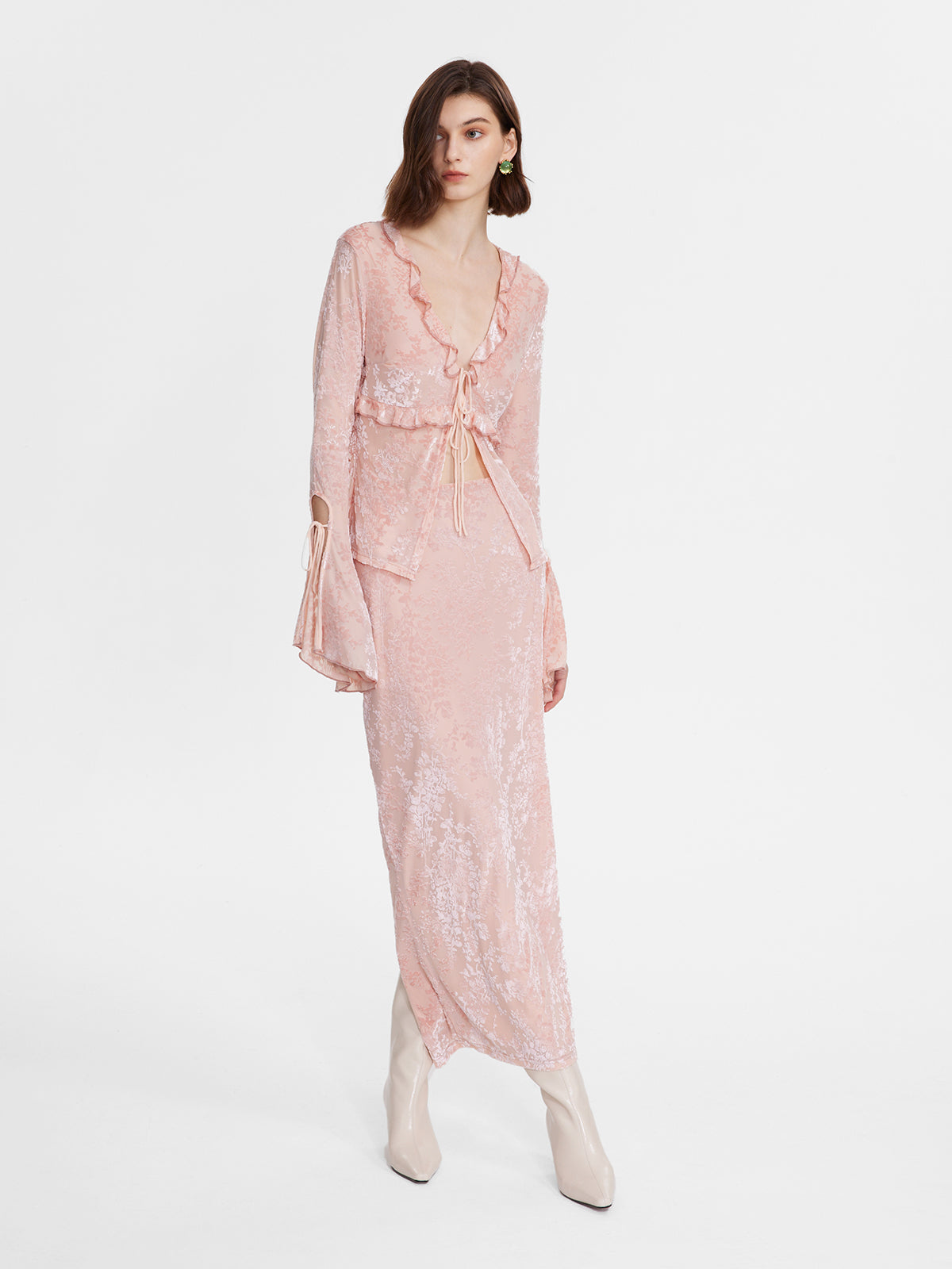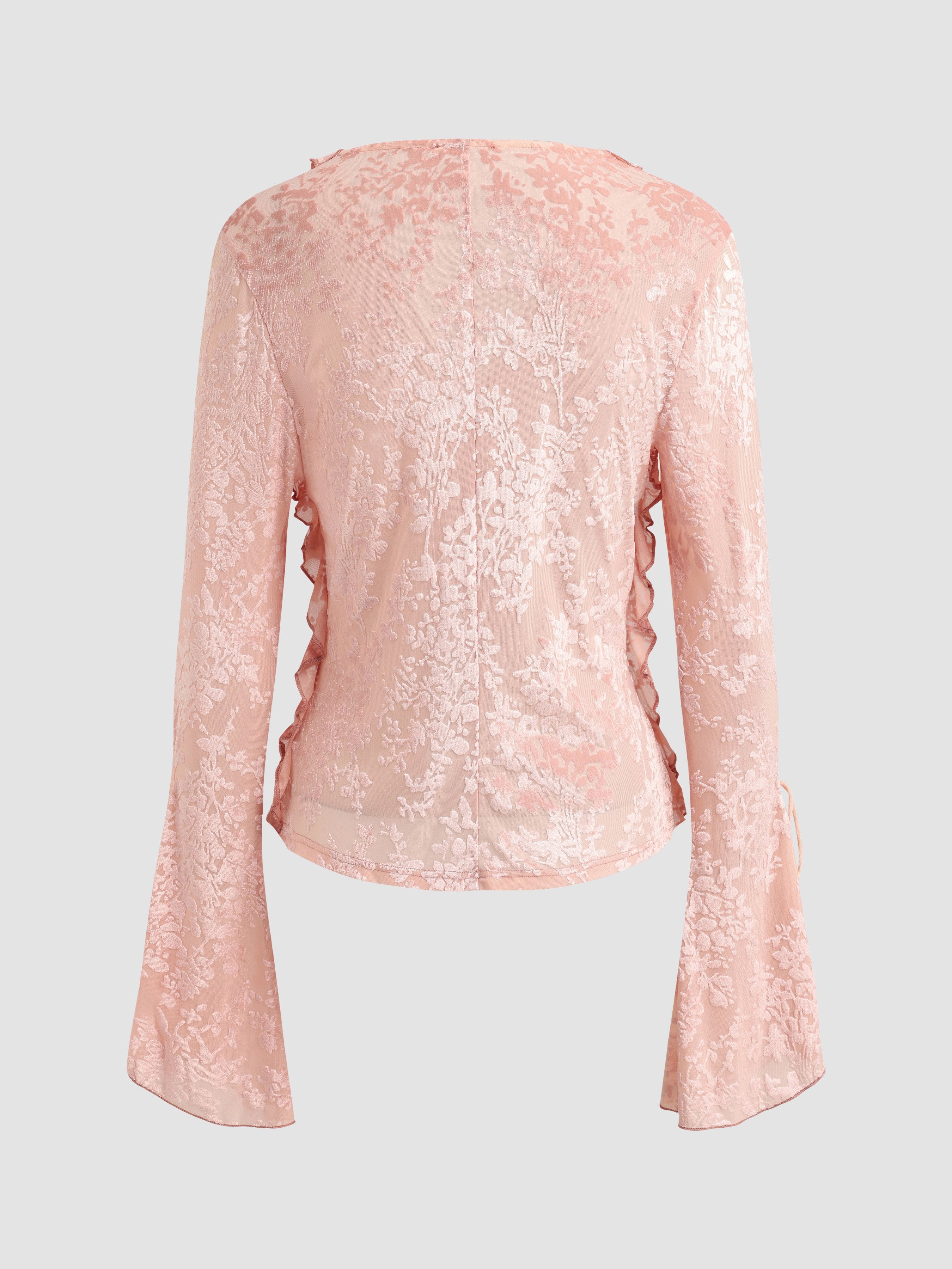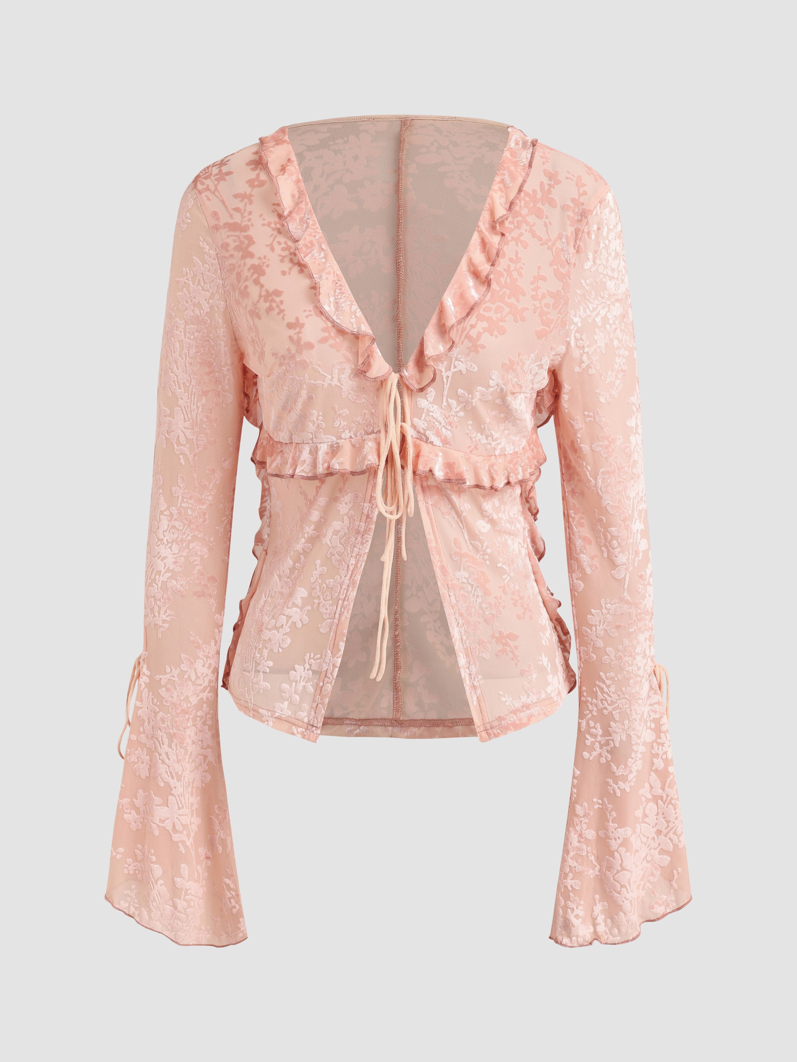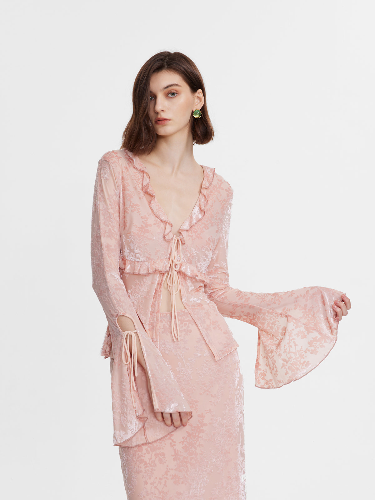 Velvet V-Neck Jacquard Ruffled Bell Sleeve Tie-Up Blouse