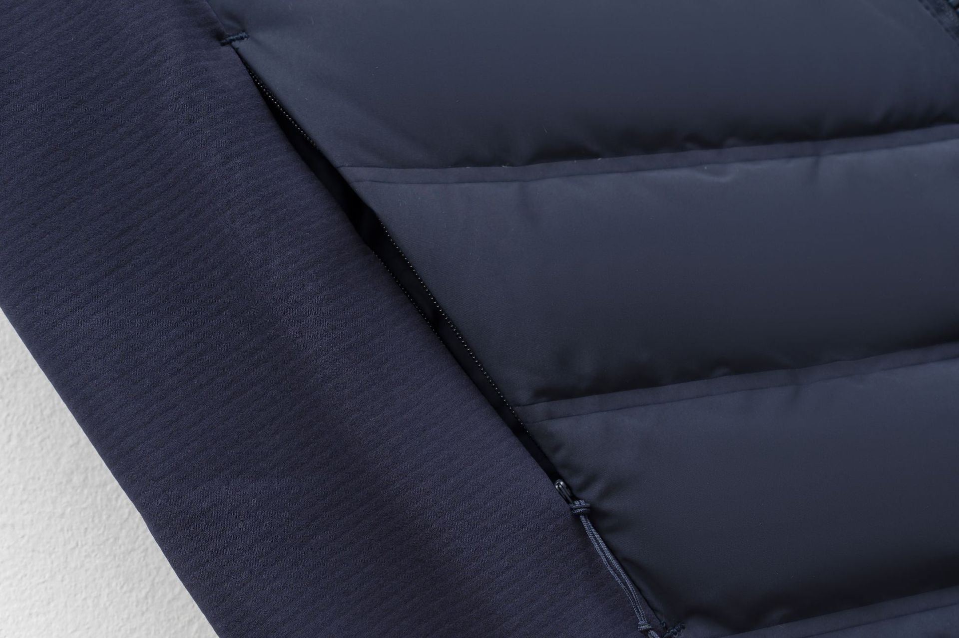 Crafted with two complementary materials—100% polyester puffer shell for warmth and durability, and nylon-spandex stretch panels (88.3% nylon, 11.7% spandex) for improved flexibility and movement.