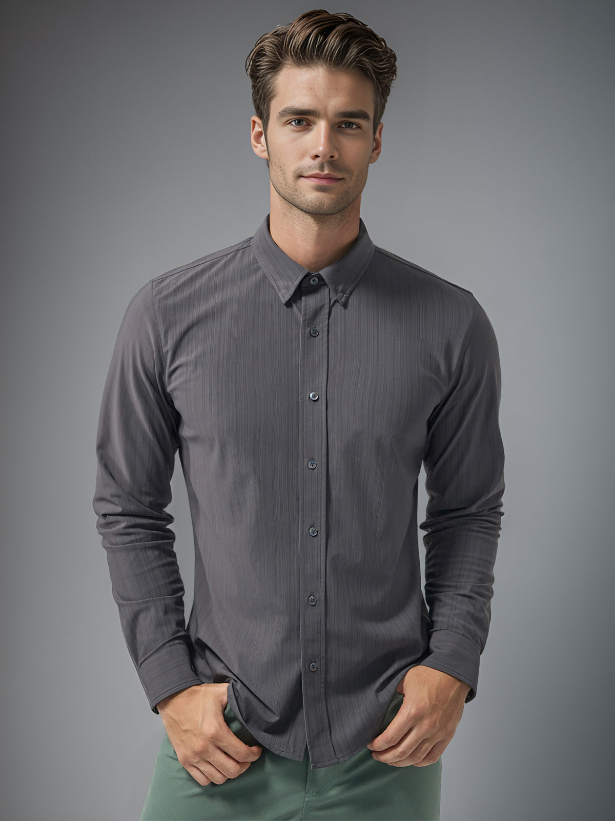 - Cuello con botones ocultos, puños con botones ajustables. Manténgase elegante, cómodo y rápido.