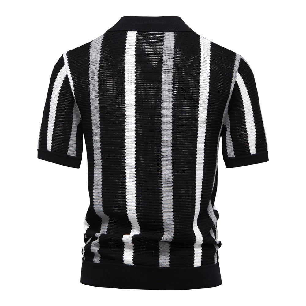 Este polo de punto estilo resort está confeccionado con una mezcla suave y transpirable de 66,7 % viscosa y 33,3 % poliéster, que ofrece una sensación suave y ligera. Con rayas anchas y vibrantes, aporta una estética atrevida y relajada, perfecta para vacaciones y salidas informales. Las mangas cortas y la textura del punto le dan un toque moderno a esta prenda básica de verano.