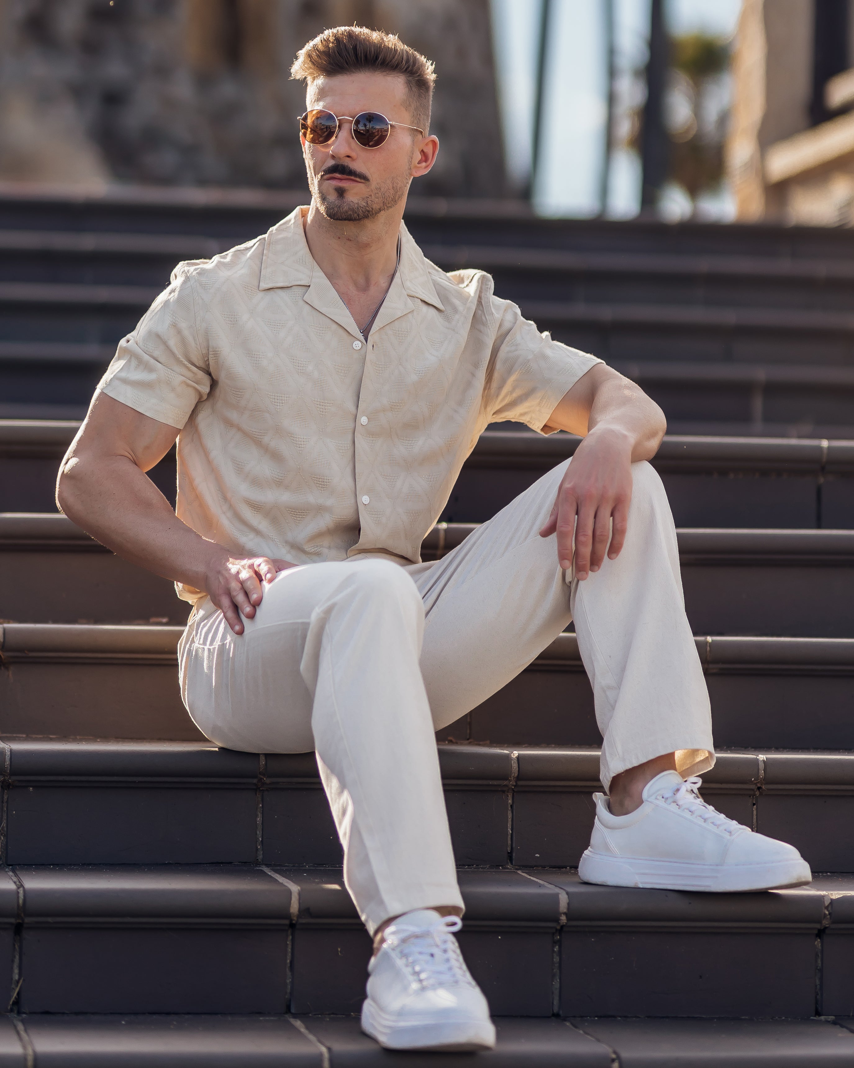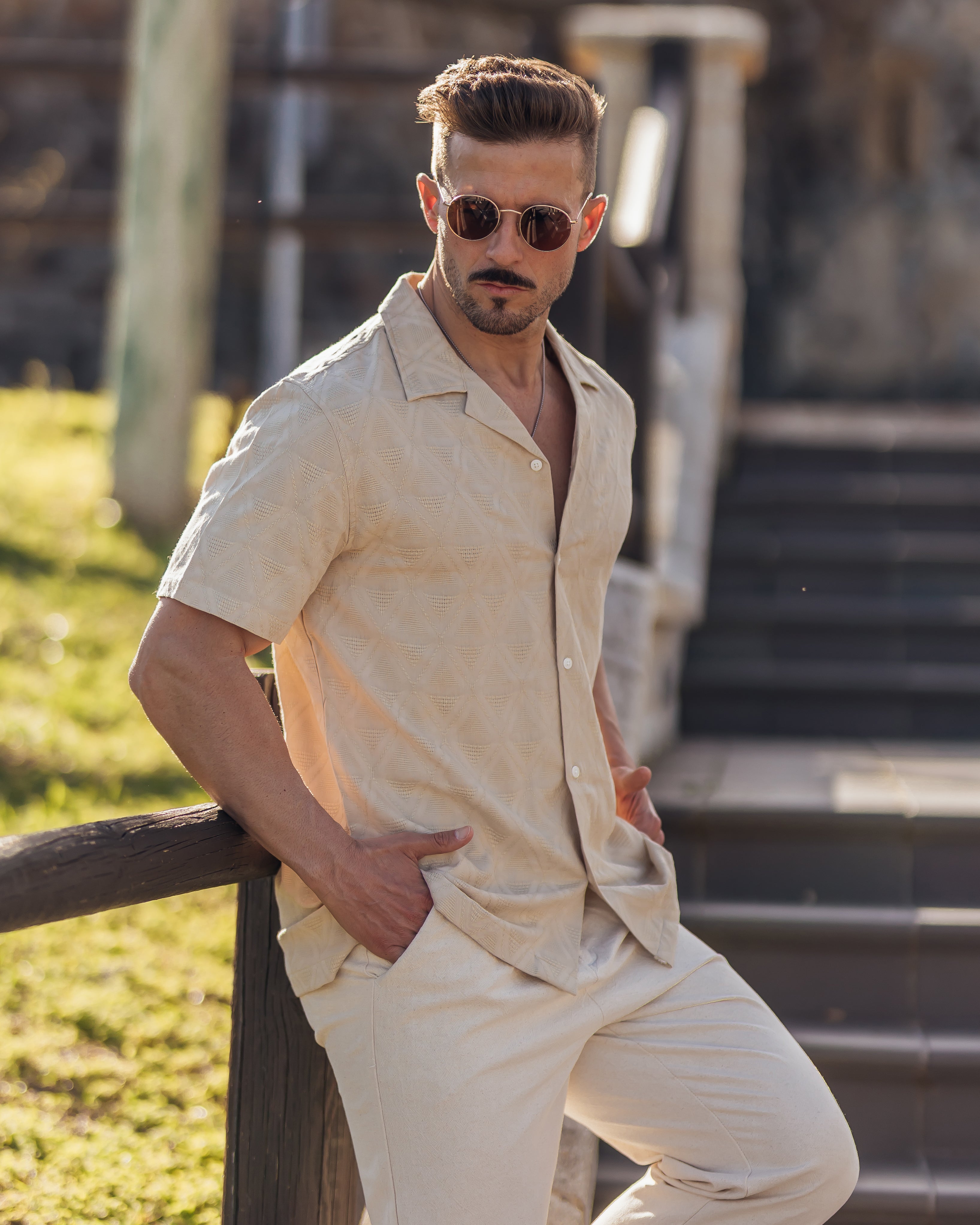 Diseñada para una escapada fresca al Mediterráneo, esta camisa estilo resort de estilo habanero combina un 60 % de algodón y un 40 % de rayón para una sensación ligera y transpirable. Las mangas cortas y la textura jacquard en forma de diamante aportan un toque de sobria elegancia, ideal para relajarse en verano. Con un estilo sencillo, combina a la perfección con looks casuales y vacacionales.