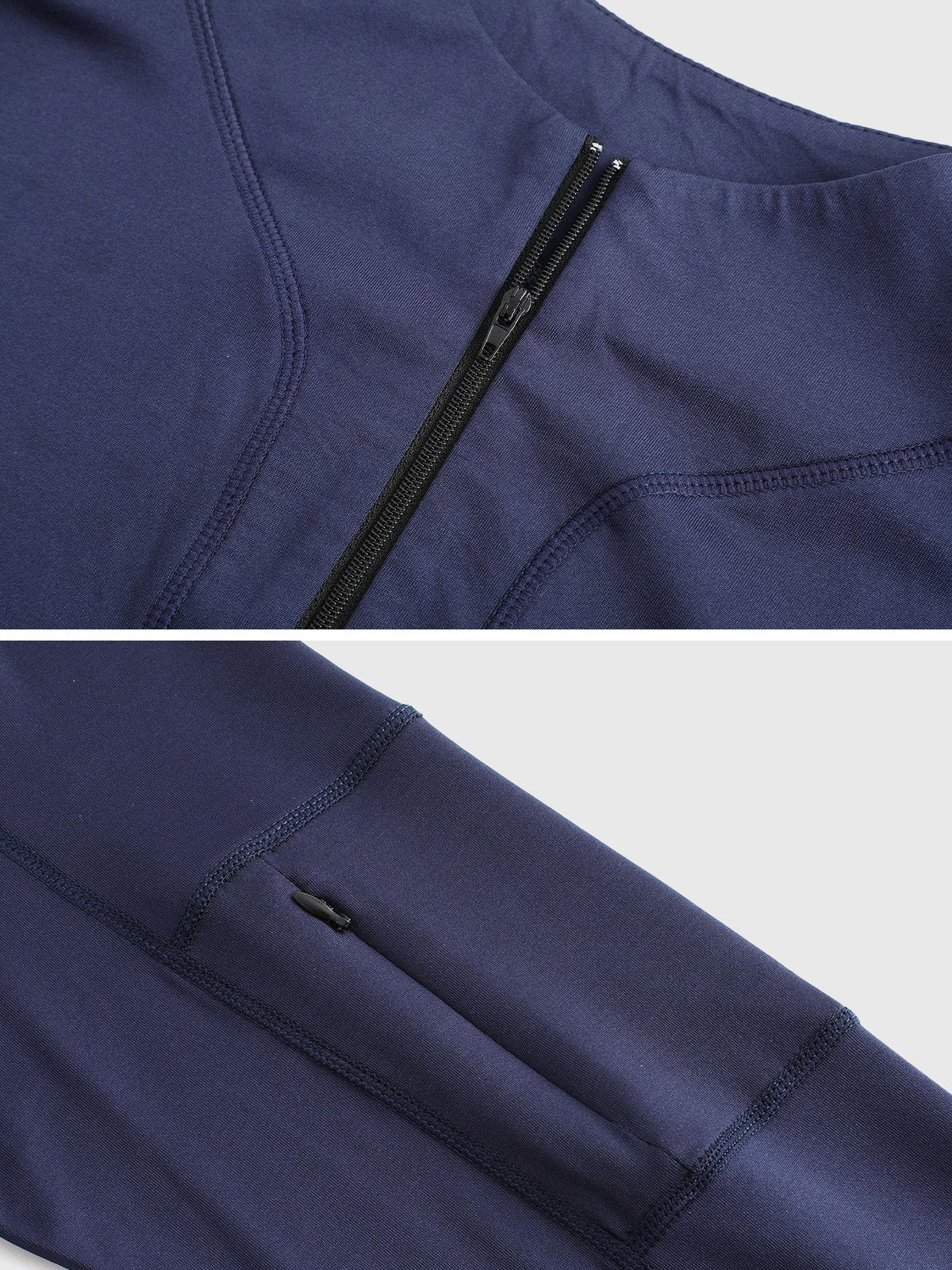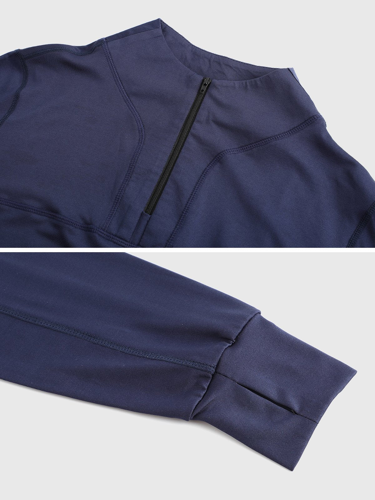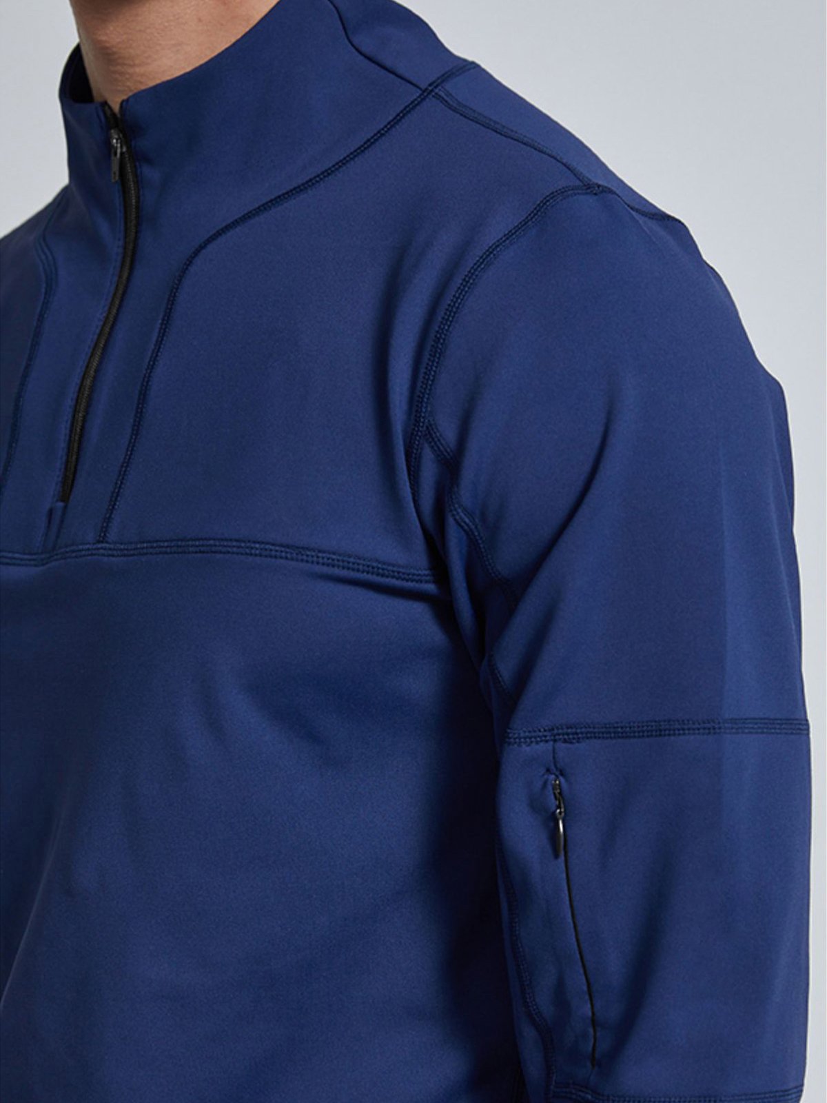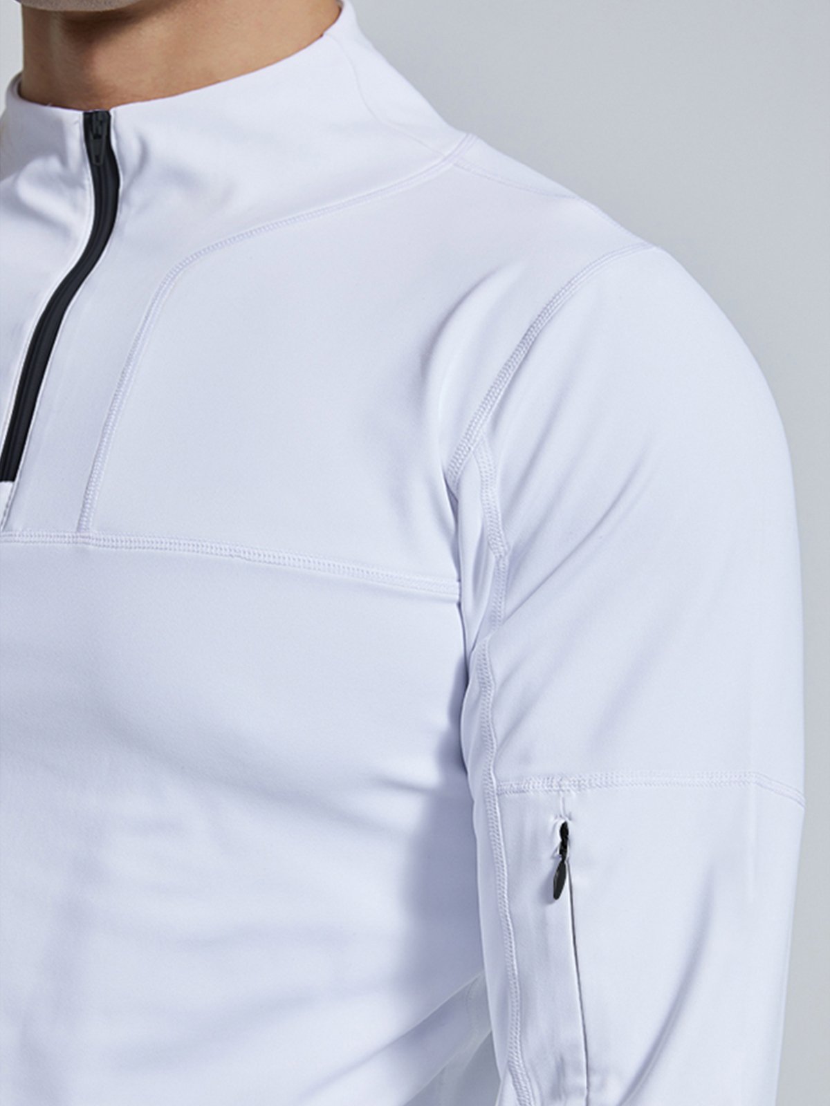 - Cremallera frontal de 1/4 con cuello que se puede usar fácilmente hacia arriba o hacia abajo