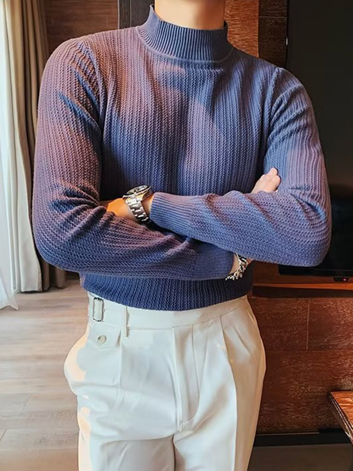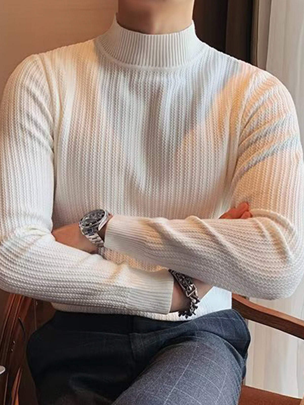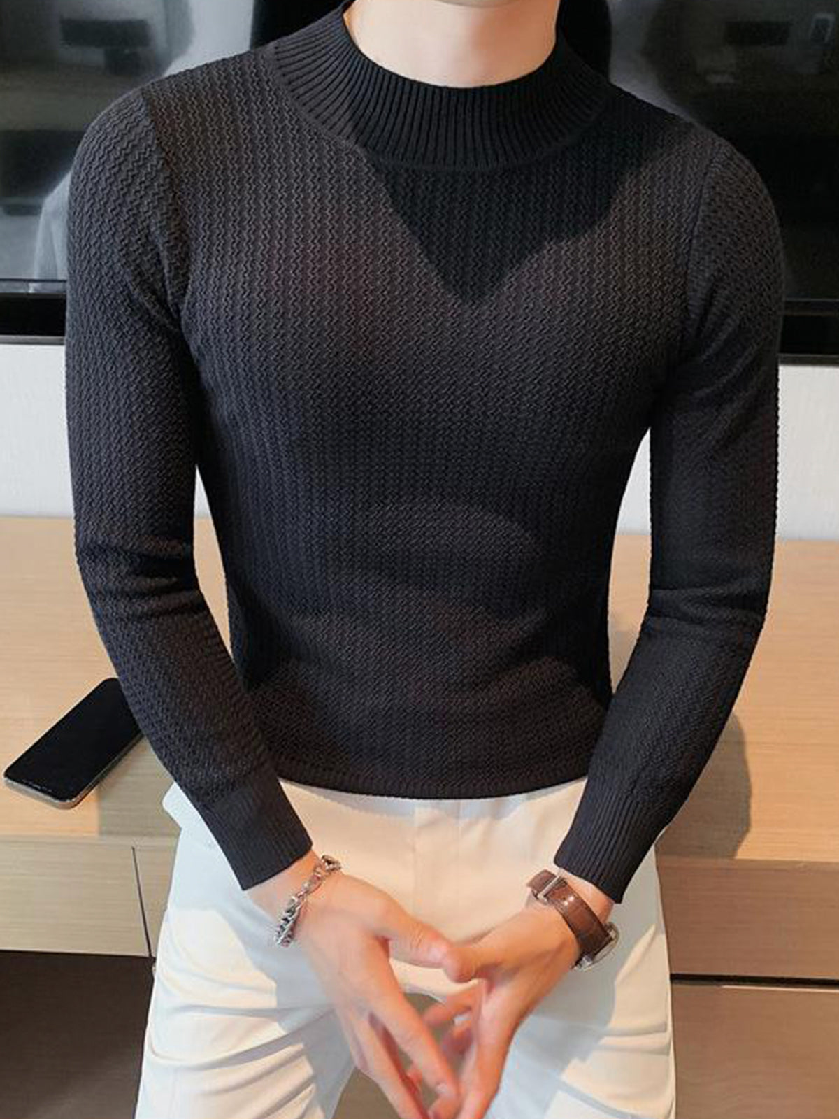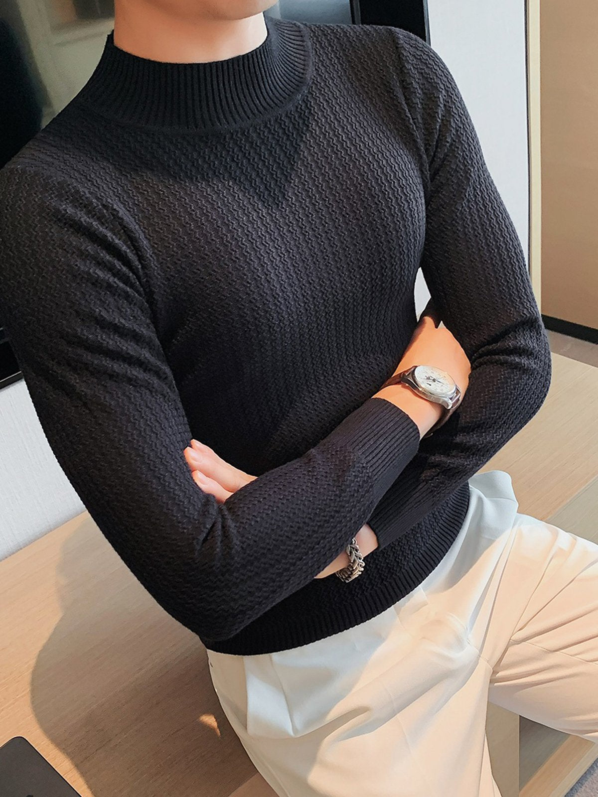 Este es un suéter interior de textura con cuello alto y ajuste regular. Está confeccionado con viscosa, poliéster y nailon. Corte estereoscópico de 360°, acorde a la forma del cuerpo masculino, cómodo y elegante en uno.