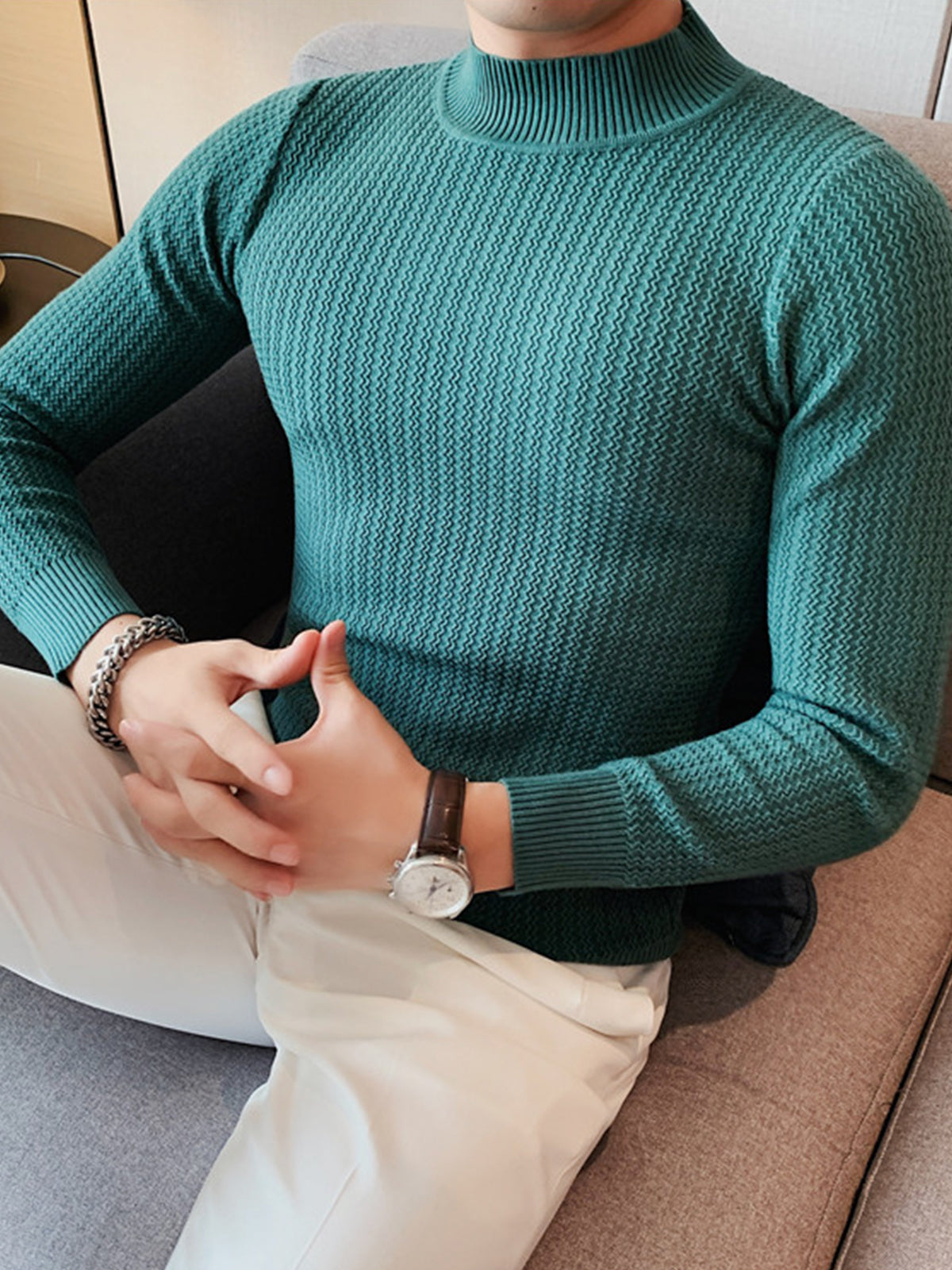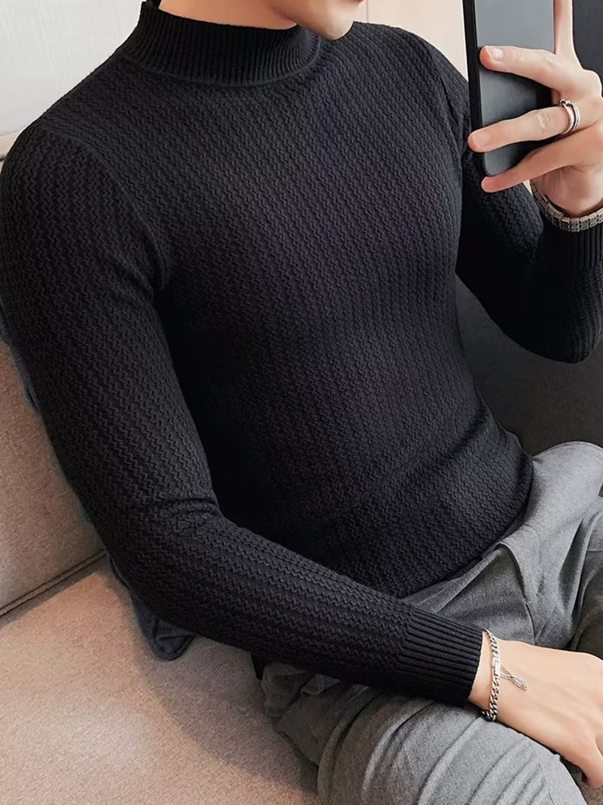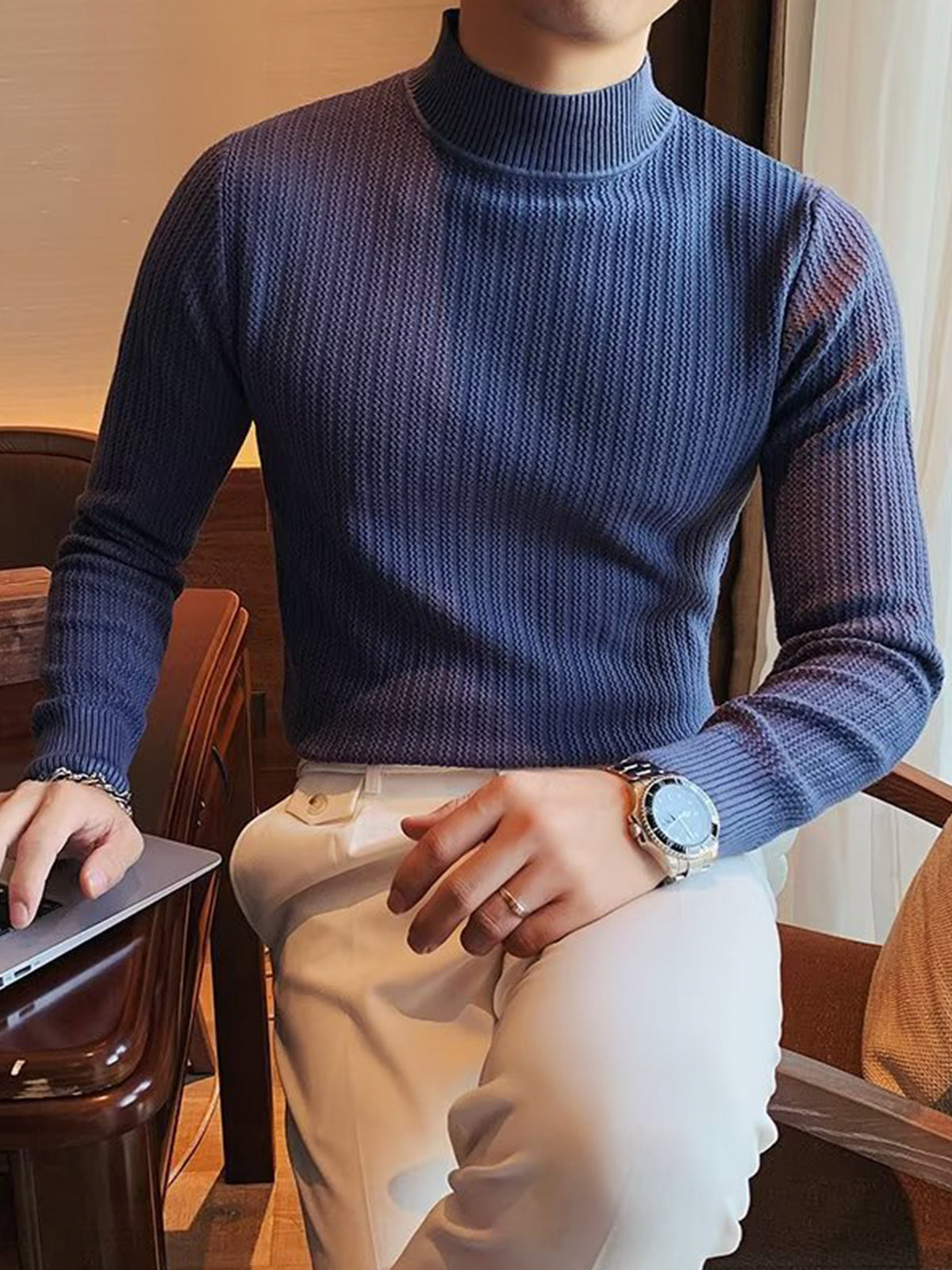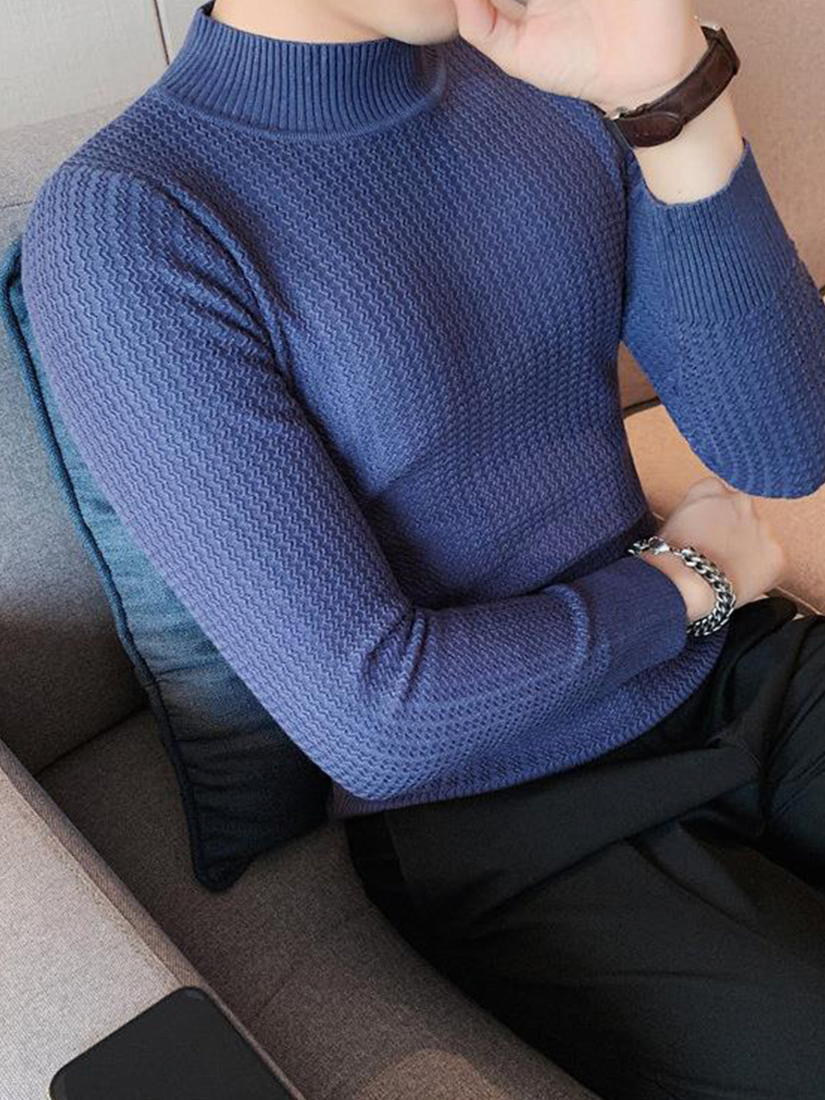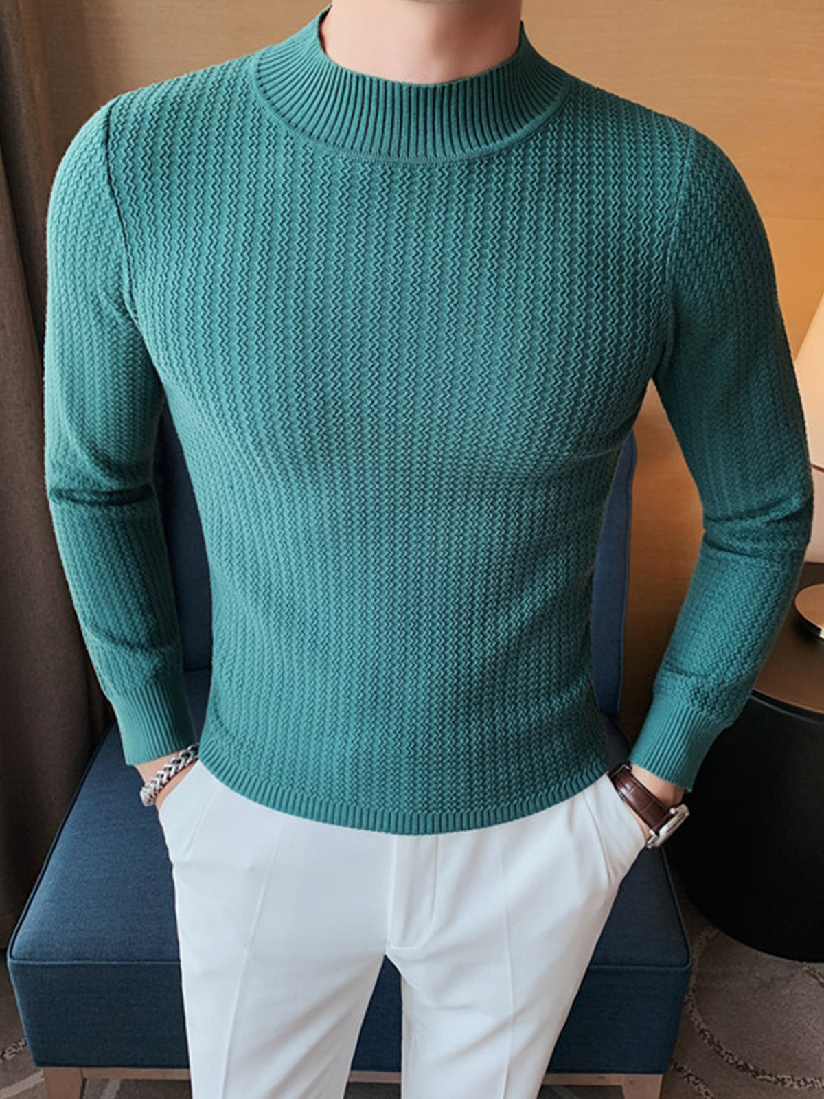 Este es un suéter interior de textura con cuello alto y ajuste regular. Está confeccionado con viscosa, poliéster y nailon. Corte estereoscópico de 360°, acorde a la forma del cuerpo masculino, cómodo y elegante en uno.
