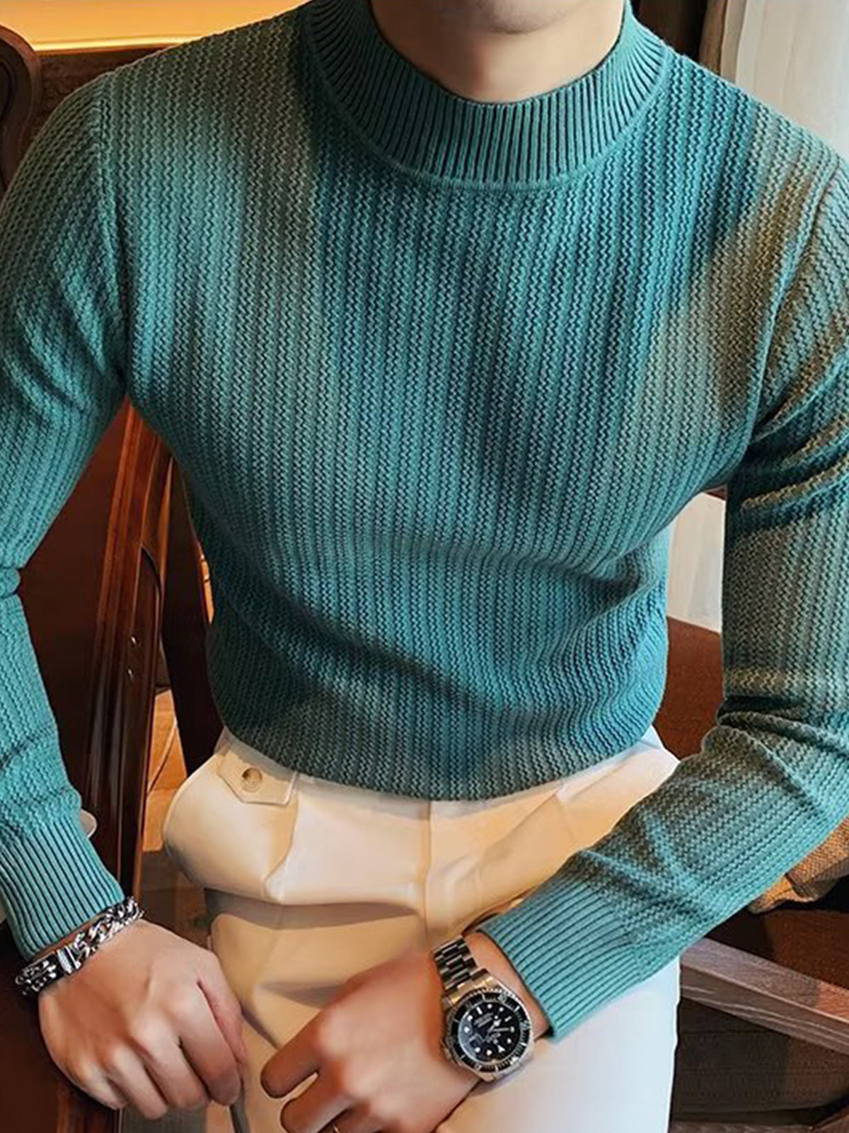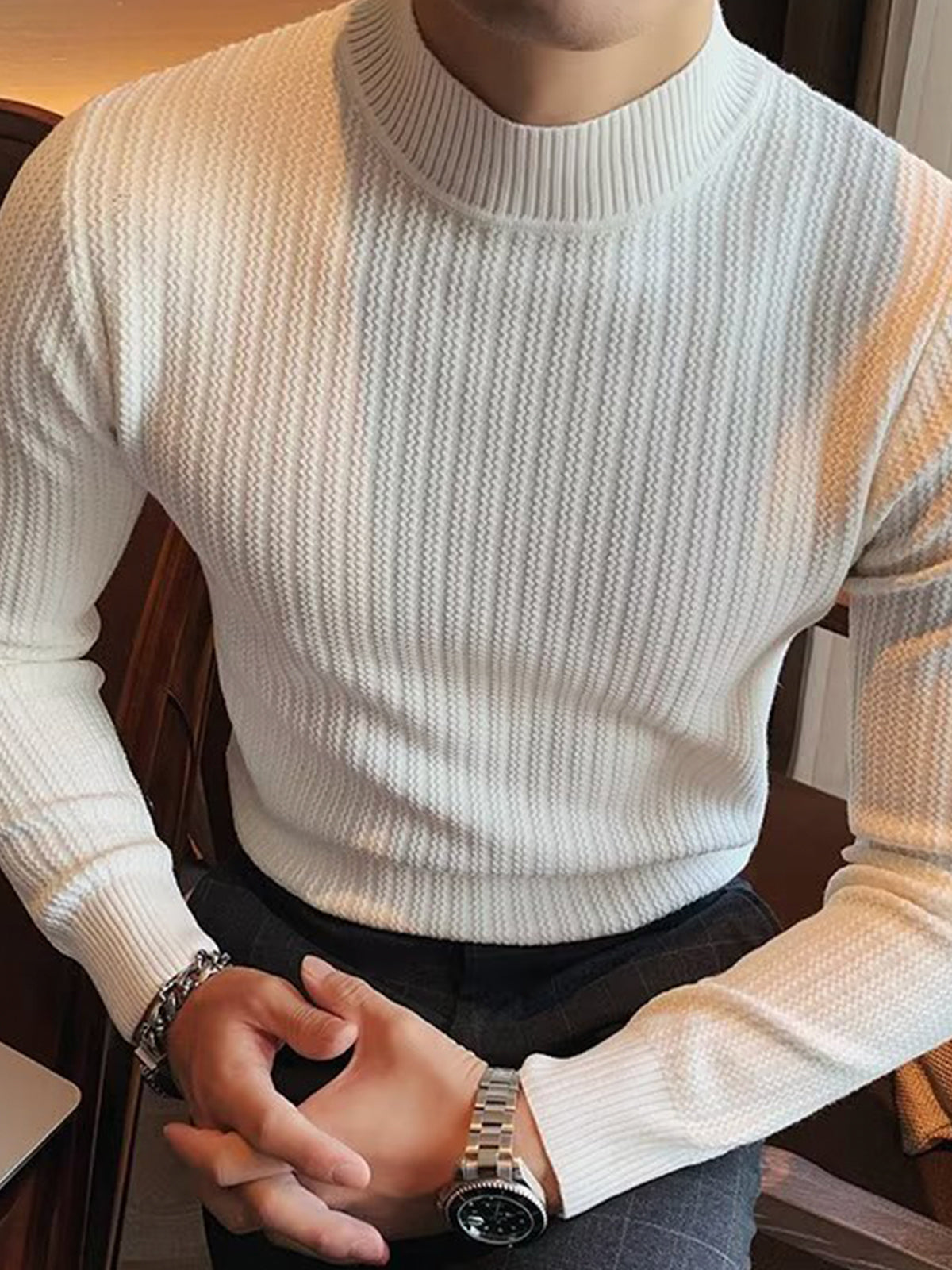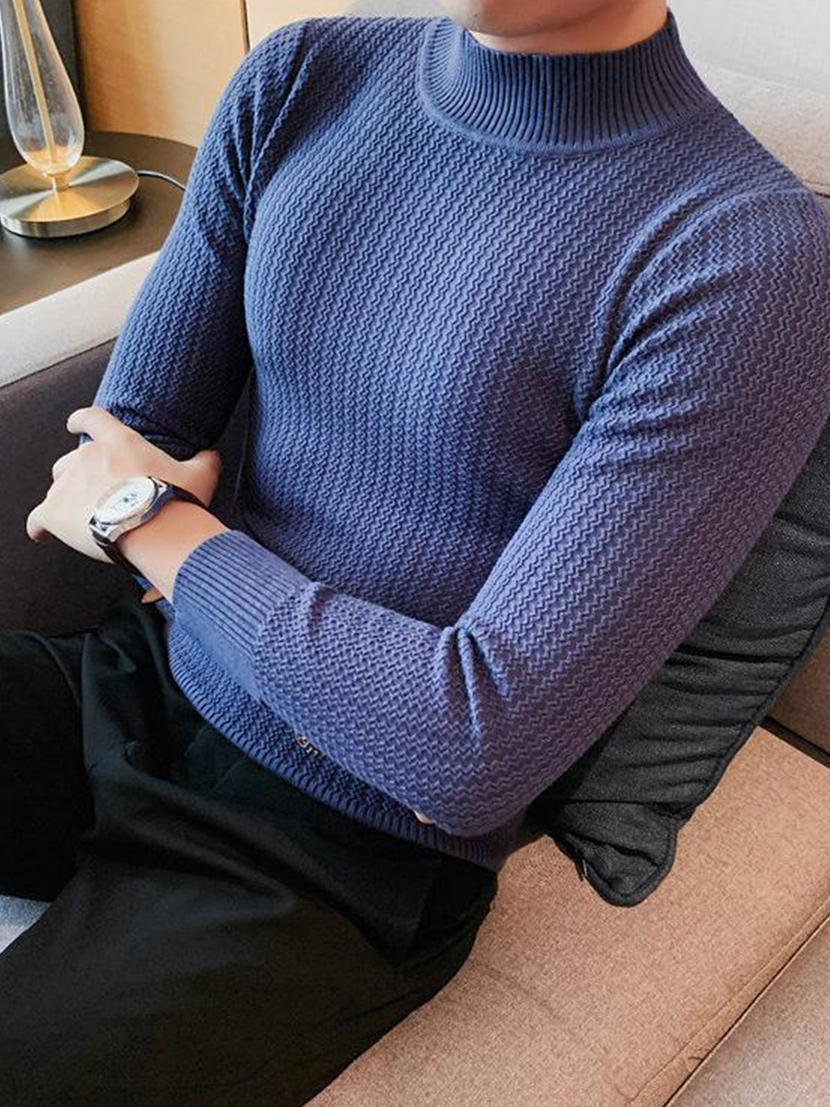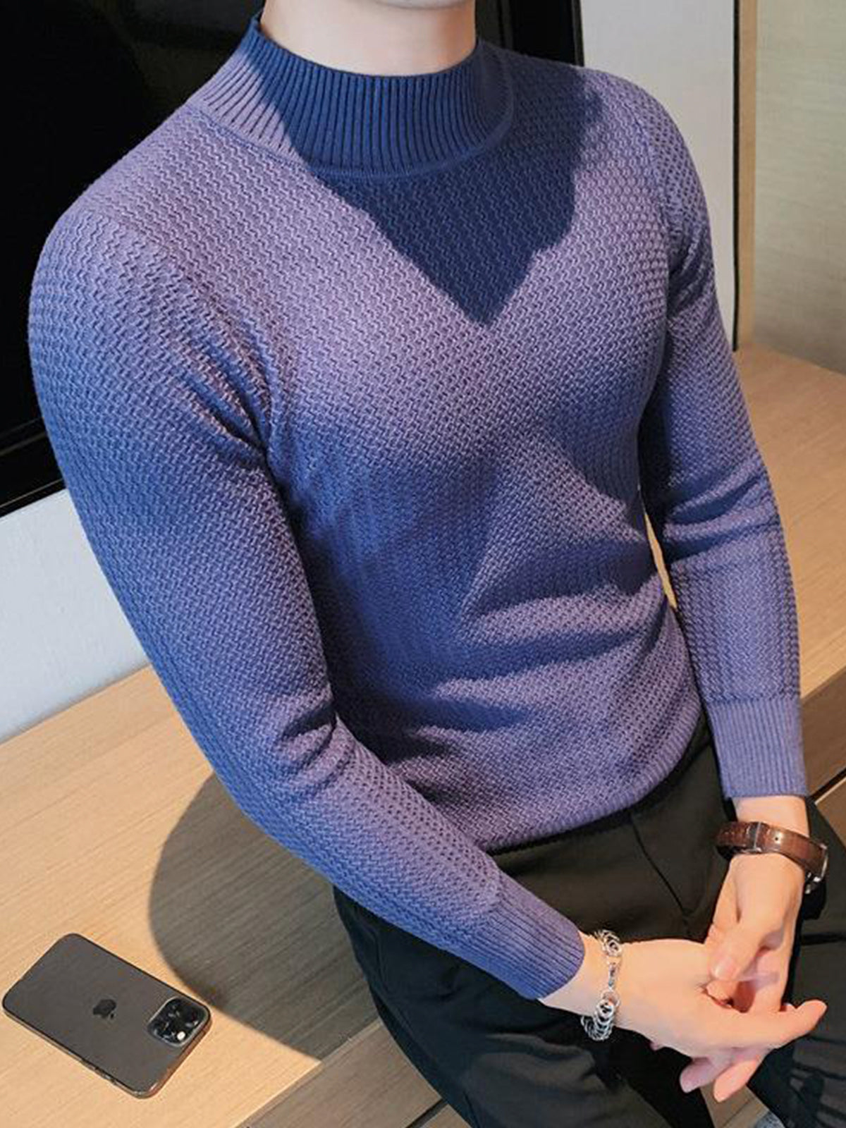 Este es un suéter interior de textura con cuello alto y ajuste regular. Está confeccionado con viscosa, poliéster y nailon. Corte estereoscópico de 360°, acorde a la forma del cuerpo masculino, cómodo y elegante en uno.