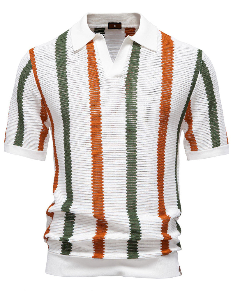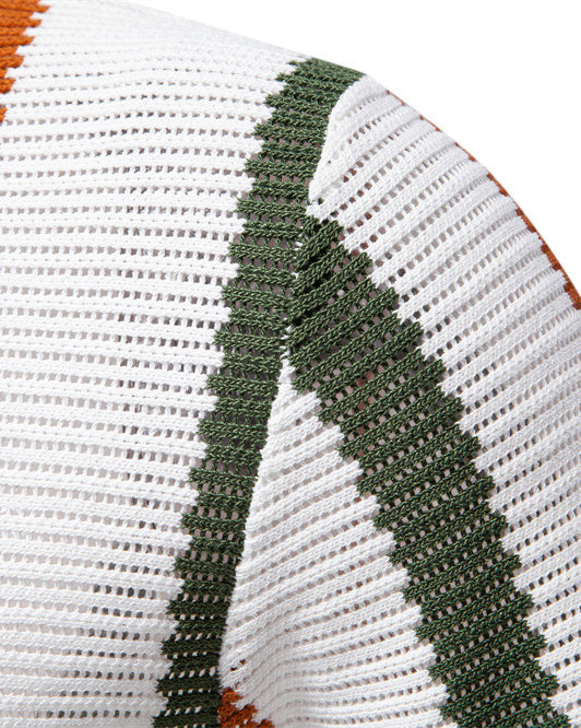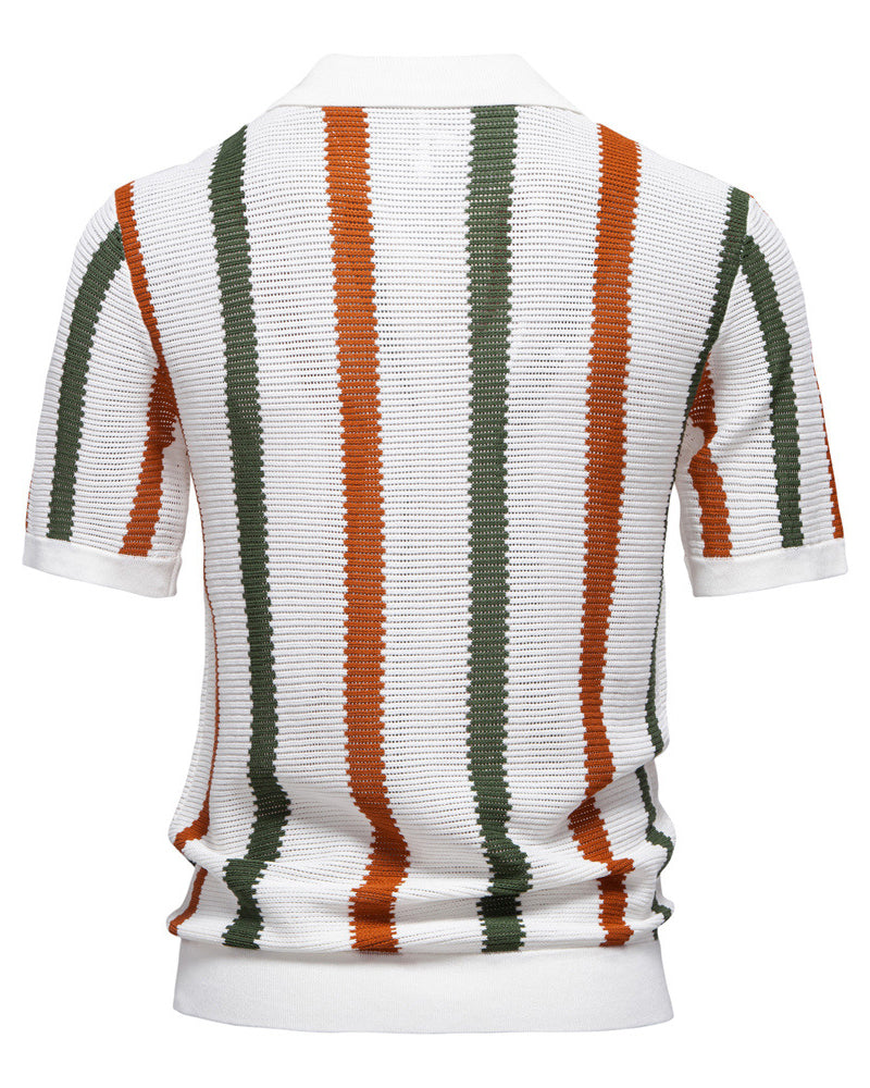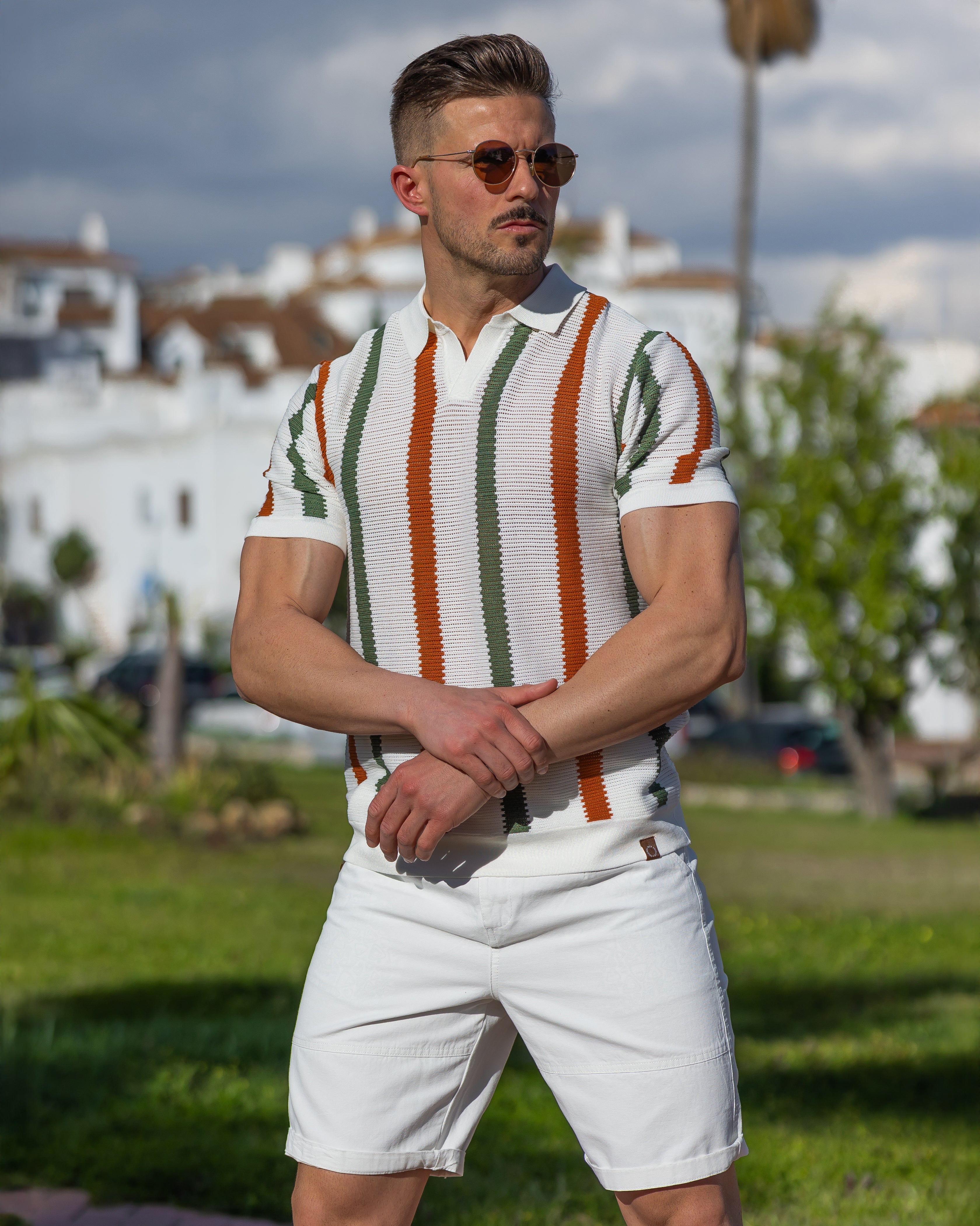 This resort-style polo knit shirt is crafted from a soft and breathable 66.7% viscose and 33.3% polyester blend, offering a smooth and lightweight feel. Featuring wide, vibrant stripes, it brings a bold yet relaxed aesthetic perfect for vacations and casual outings. The short sleeves and knit texture add a modern twist to this effortless summer staple.