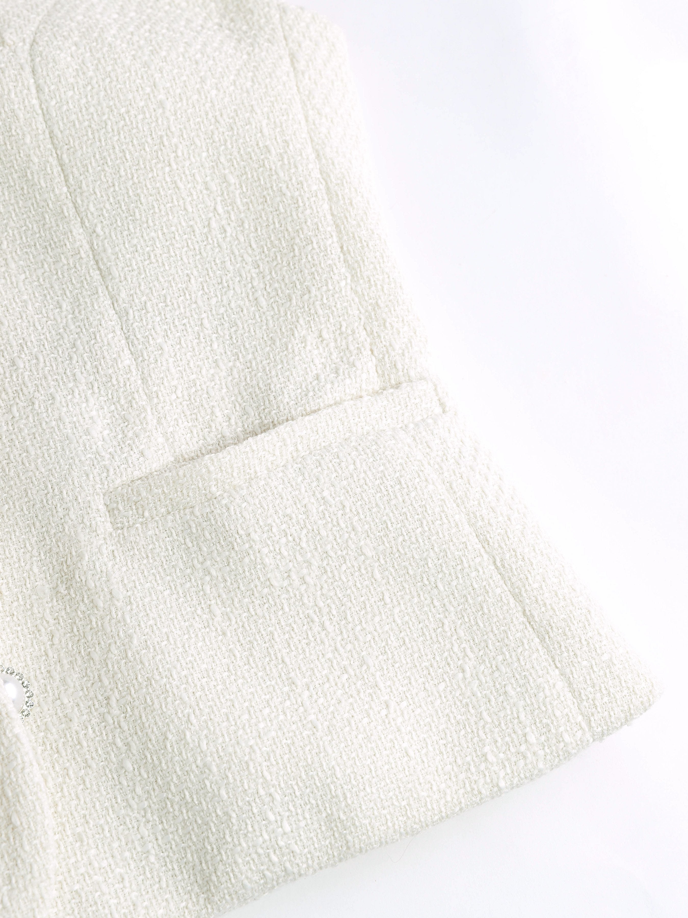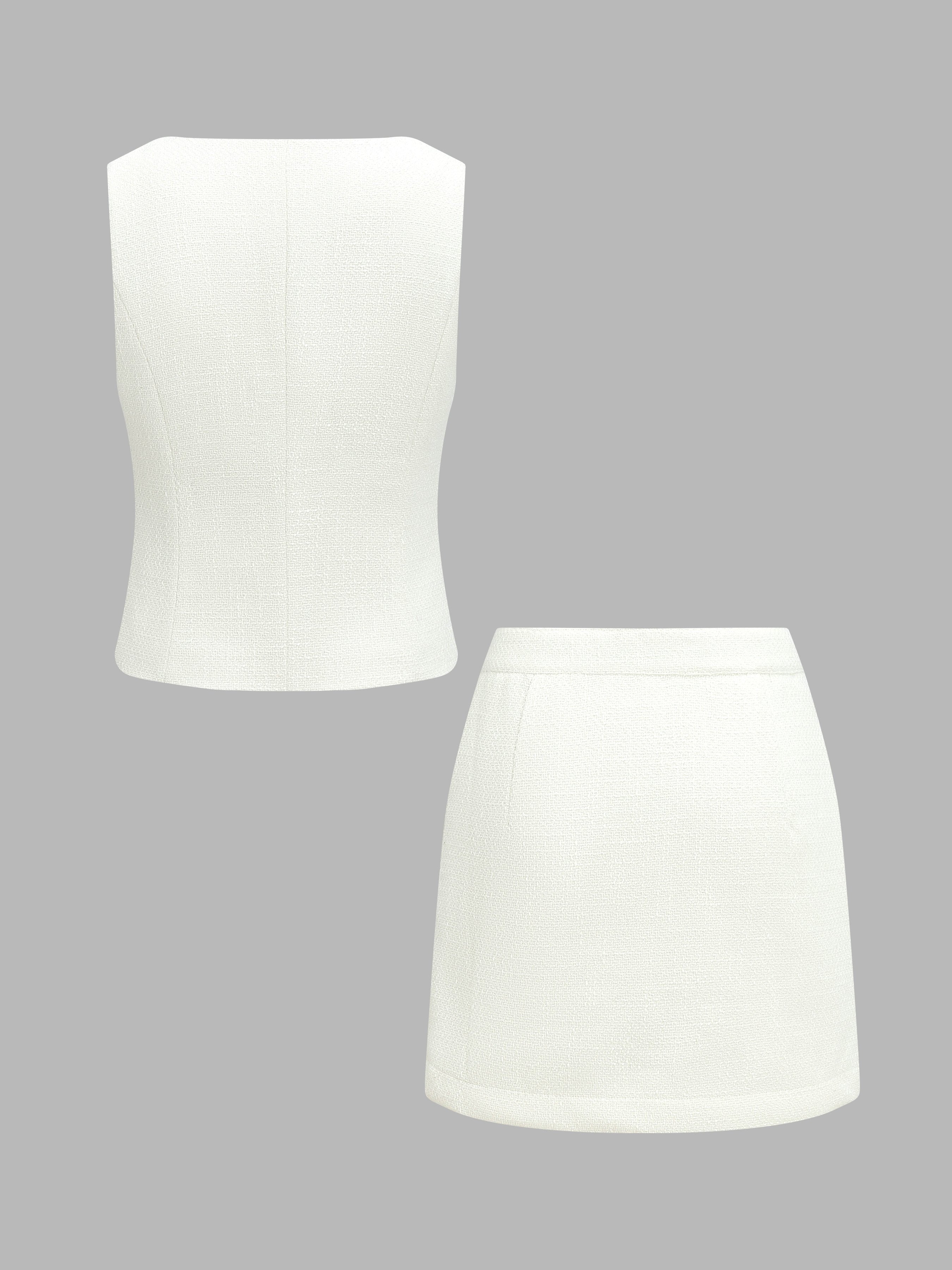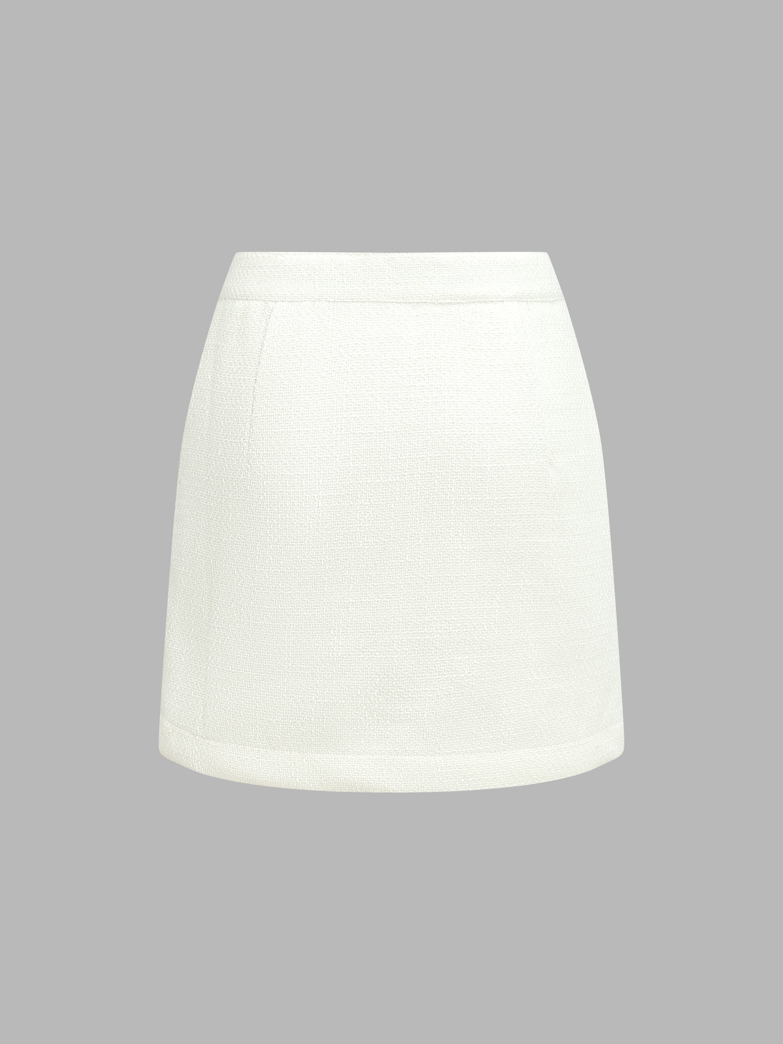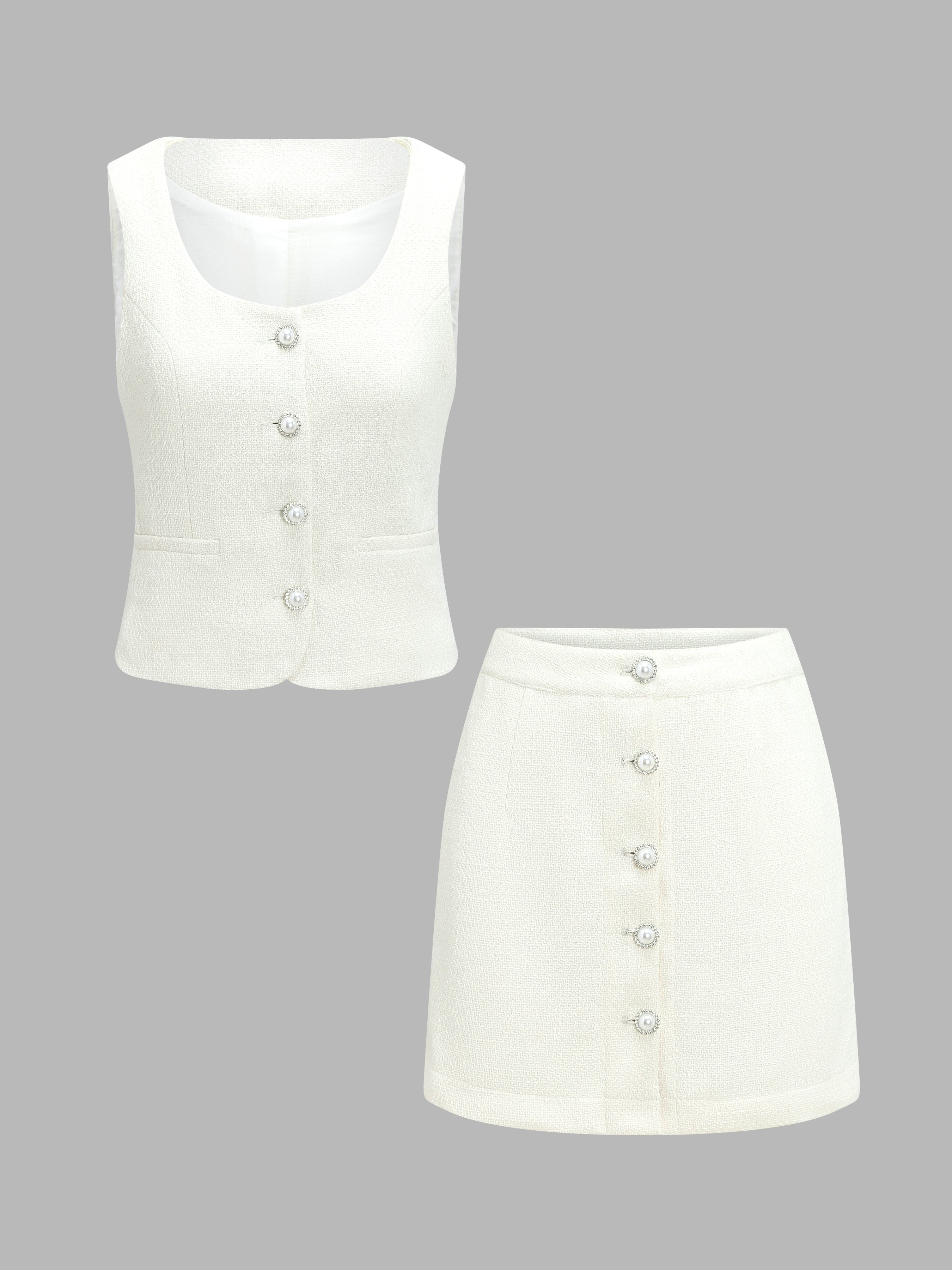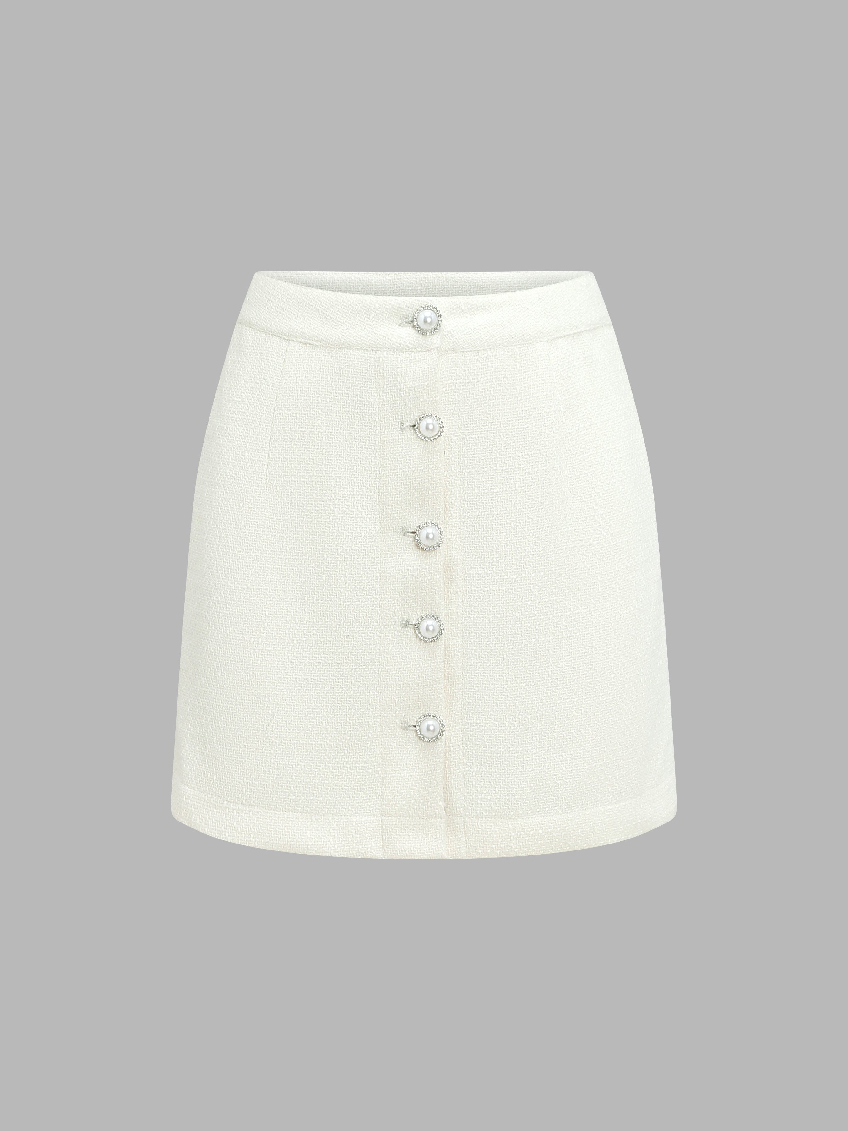 - The mini skirt offers a youthful and modern silhouette, while the elegant pearl buttons elevate the look.