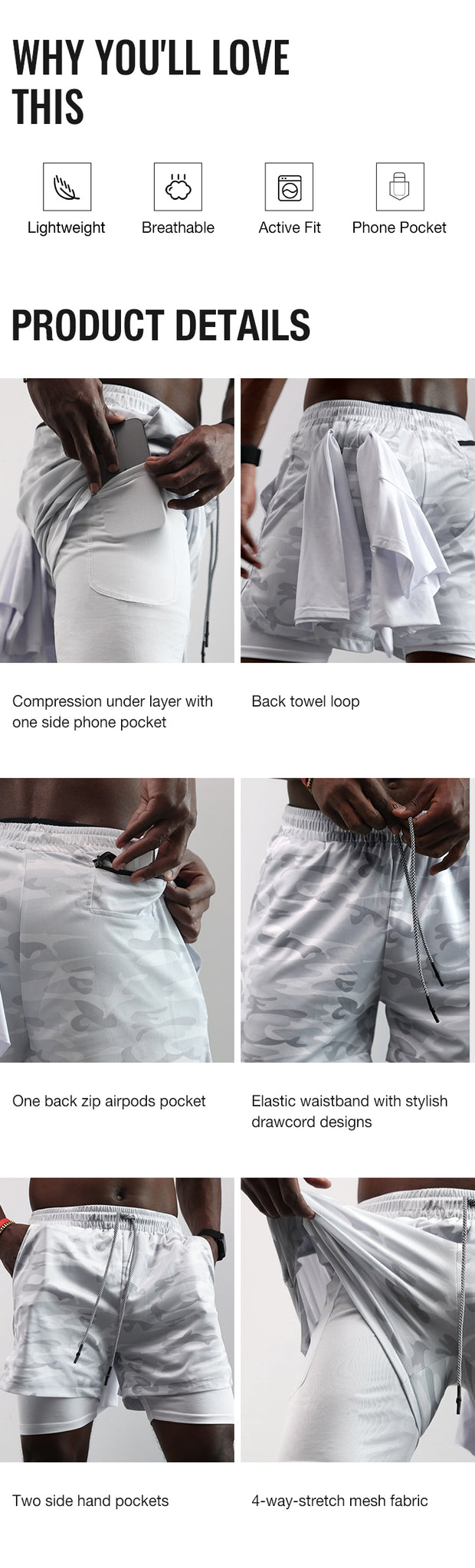 Take the studio by storm in these mens camo gym shorts perfect for high intensity training. With their lightweight fabric and 7 inch inseam, you’ll perform cardio, weights, and more with ease. The inner brief provides secure support during demanding exercises for comfort and confidence.