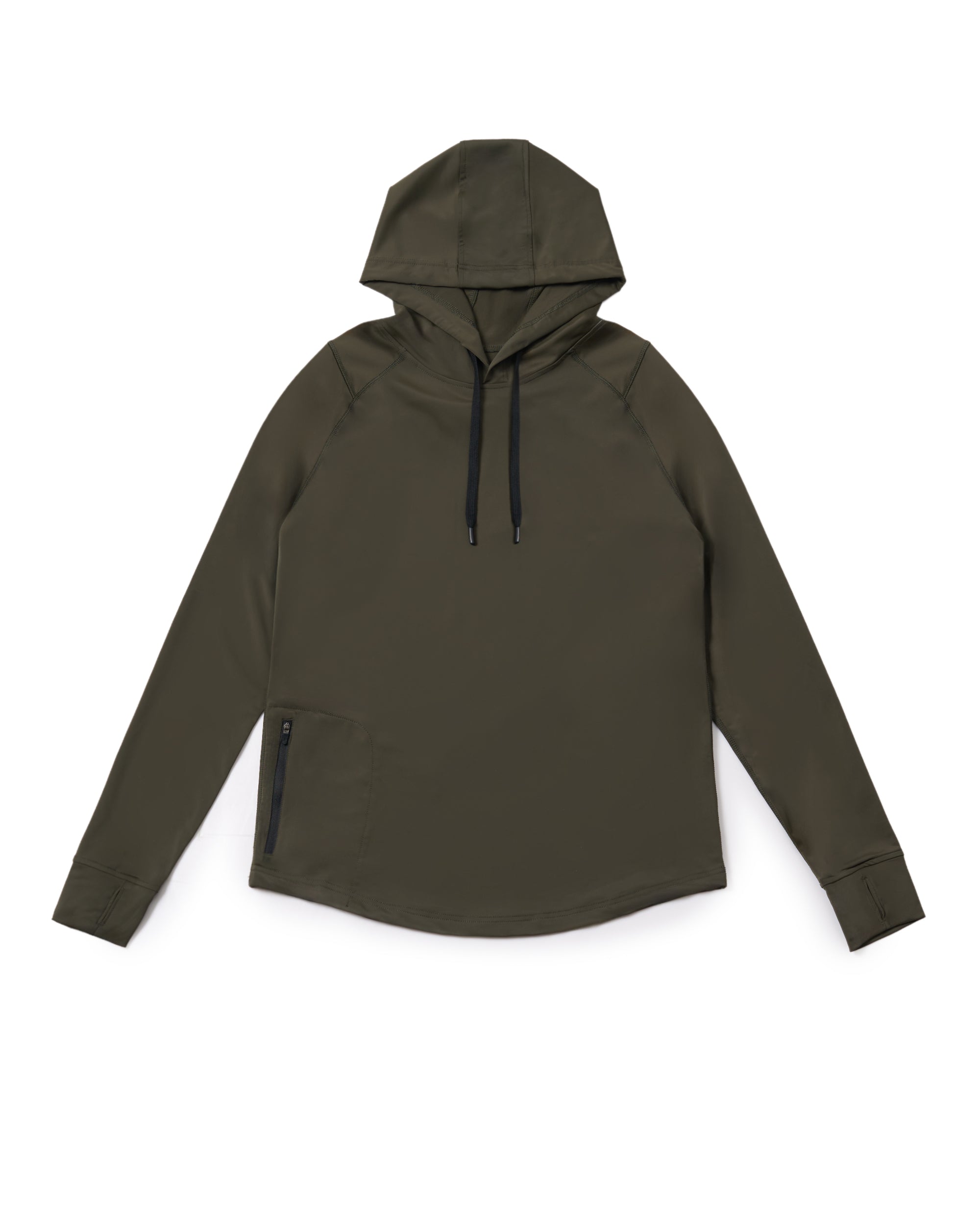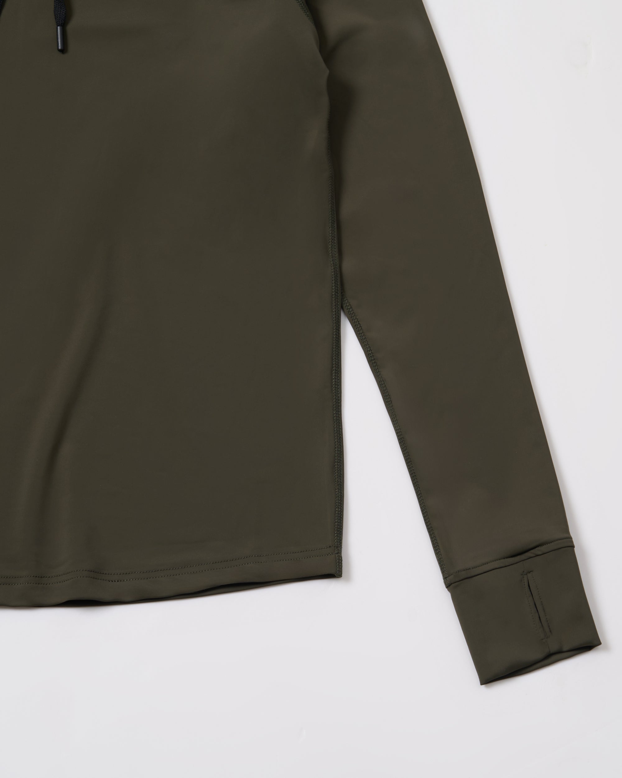 Functional details like thumbhole cuffs for stability and a hidden zip pocket at the hem provide convenience without disrupting the streamlined look. The double-stitched hem keeps the garment structured while the smooth fabric resists pilling for long-lasting wear.