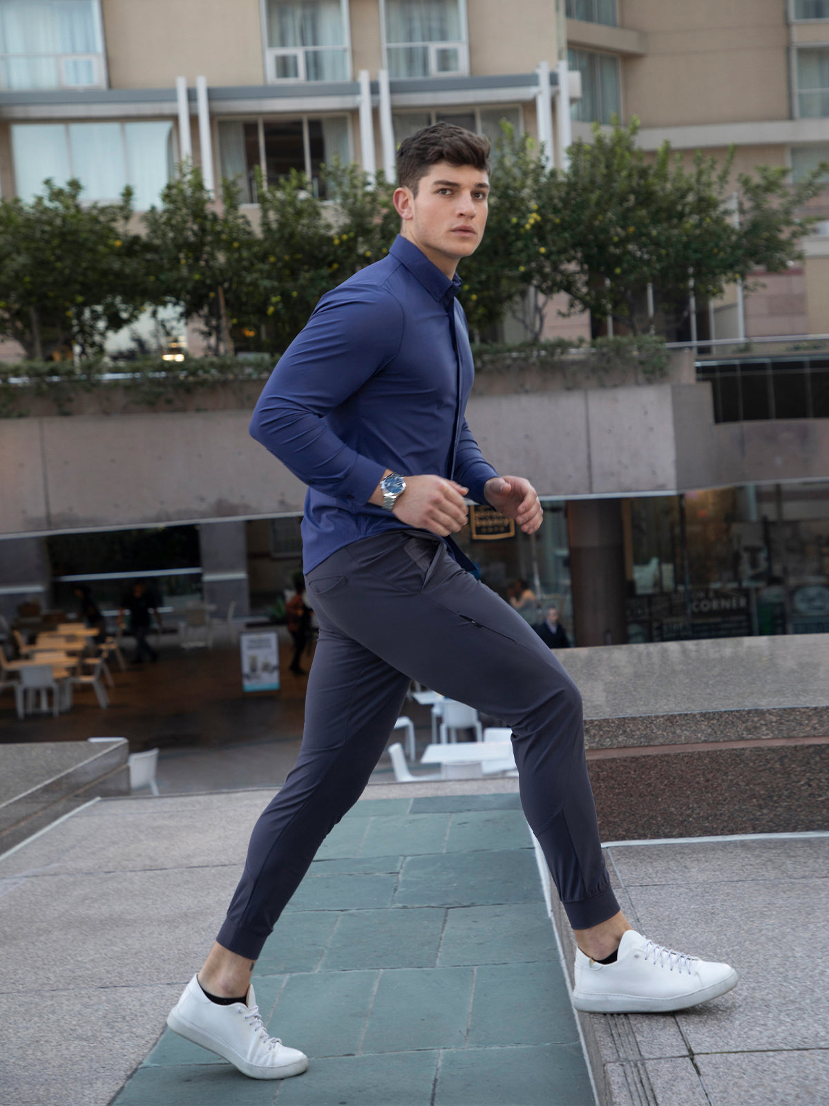 Our model normally wears a medium for a relaxed jogger fit. But for a sharper, muscle-hugging look in this outfit, he sized down to a small.
