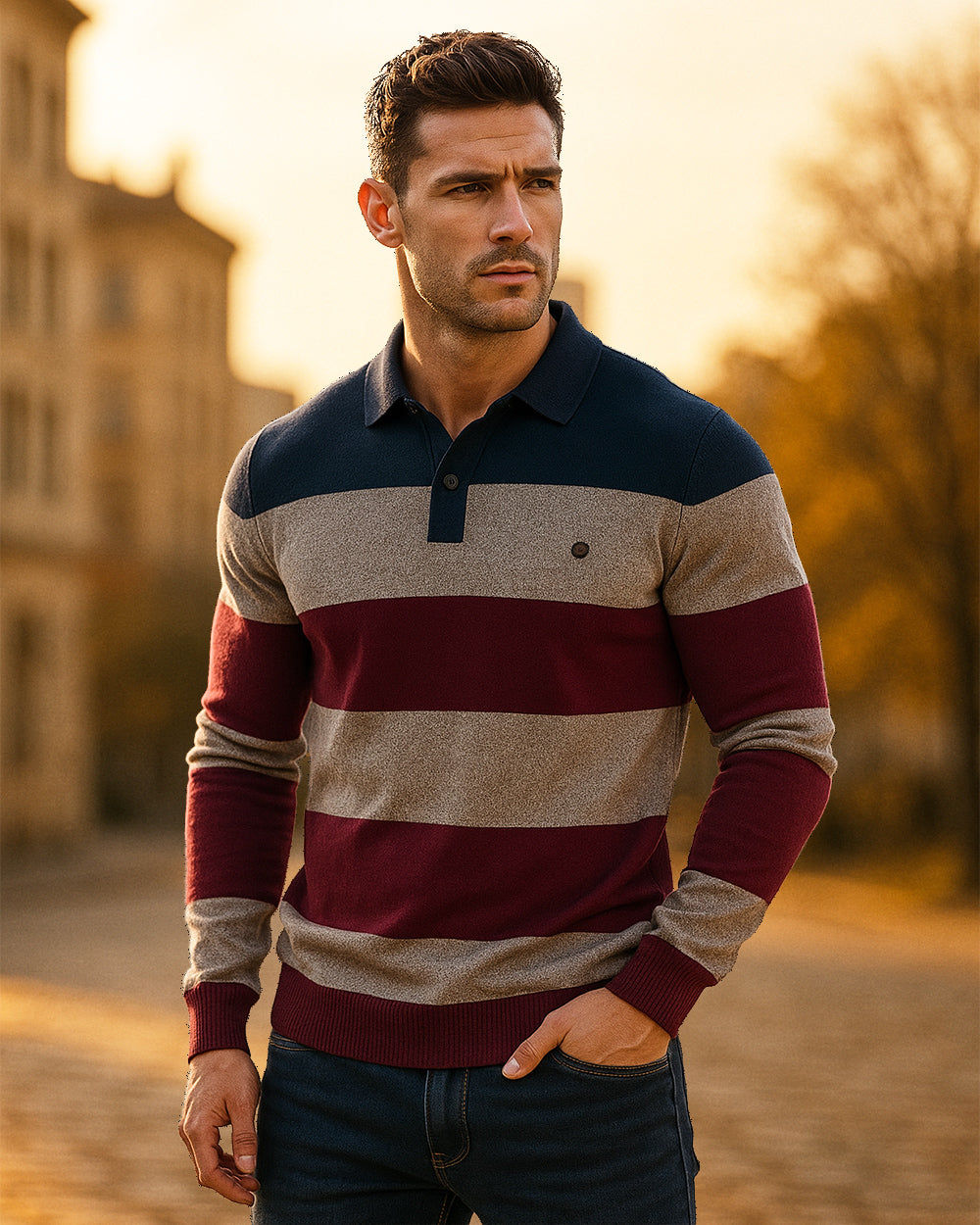 Una rivisitazione raffinata del comfort casual, questo maglione polo a maniche lunghe a righe colorblock unisce design classico e elasticità moderna per un comfort tutto il giorno. Caratterizzato da audaci strisce orizzontali nei toni navy, grigio e bordeaux, offre un look senza tempo ma contemporaneo, perfetto sia per uscite nel weekend che per ambienti smart-casual. Il tessuto morbido a maglia garantisce una sensazione liscia e una forma duratura, lavaggio dopo lavaggio.