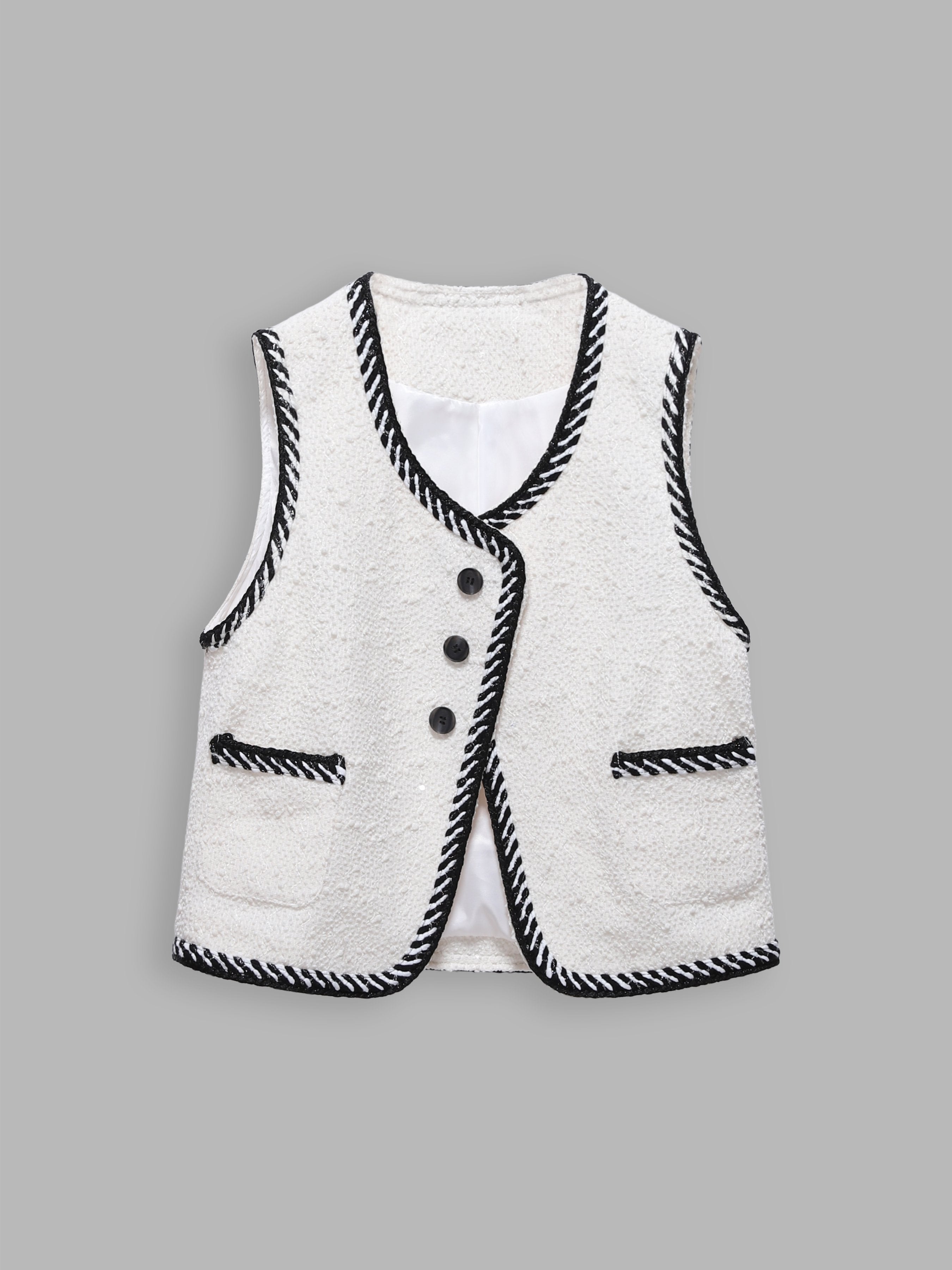 - Contrasting colors enhance the visual appeal of the vest, creating a chic and modern aesthetic.