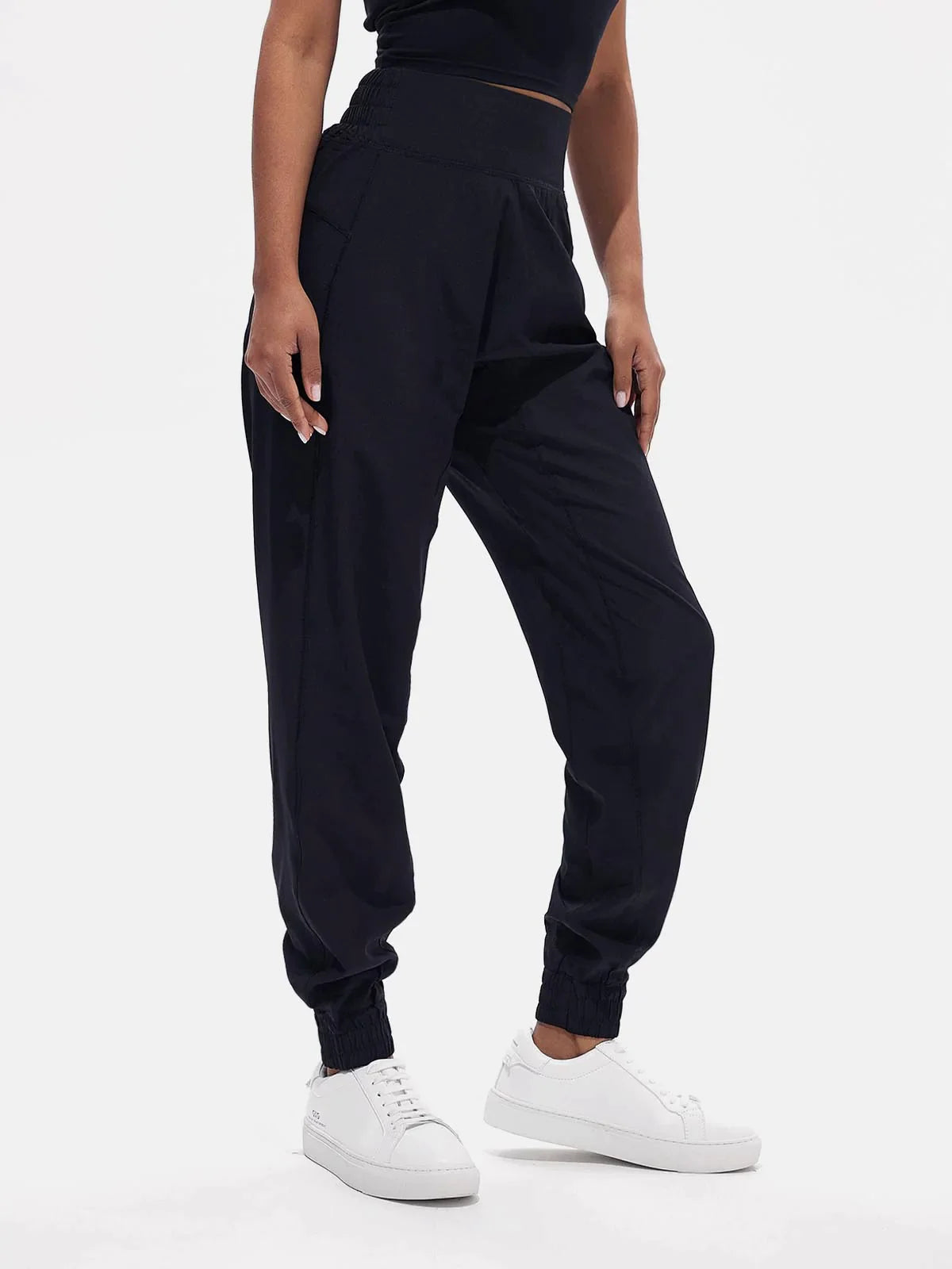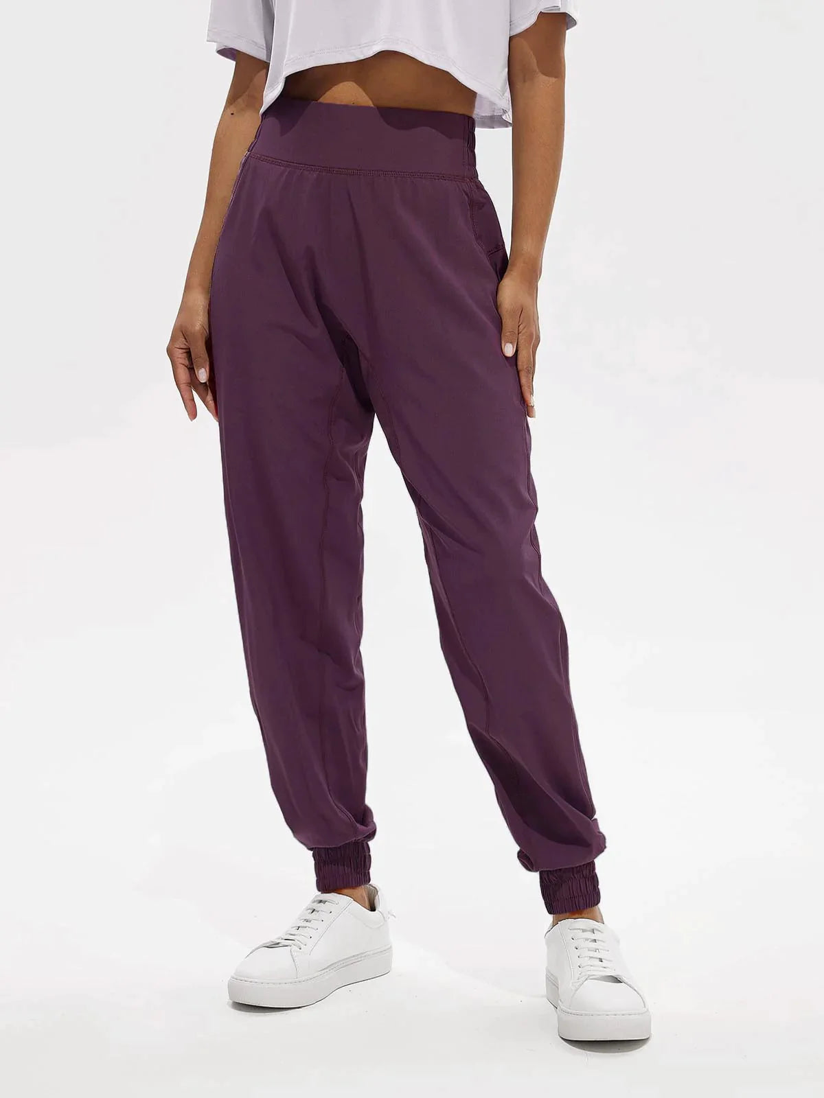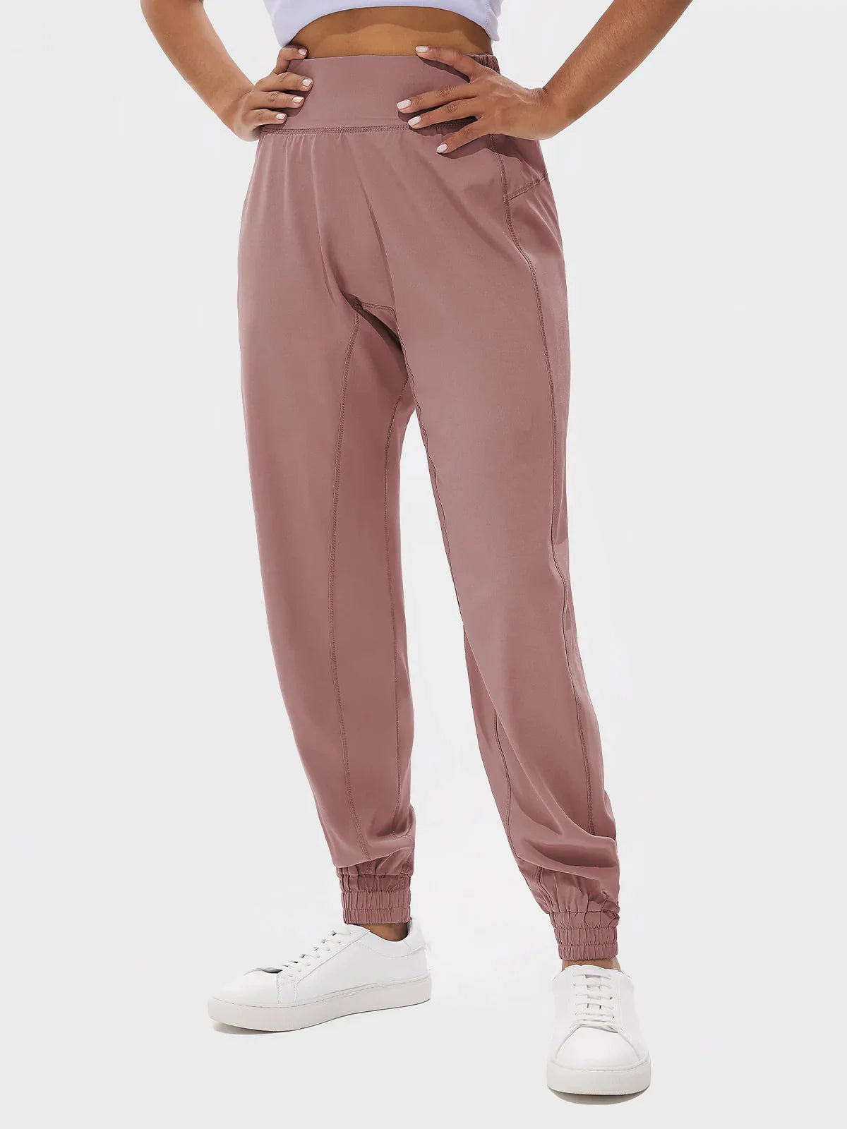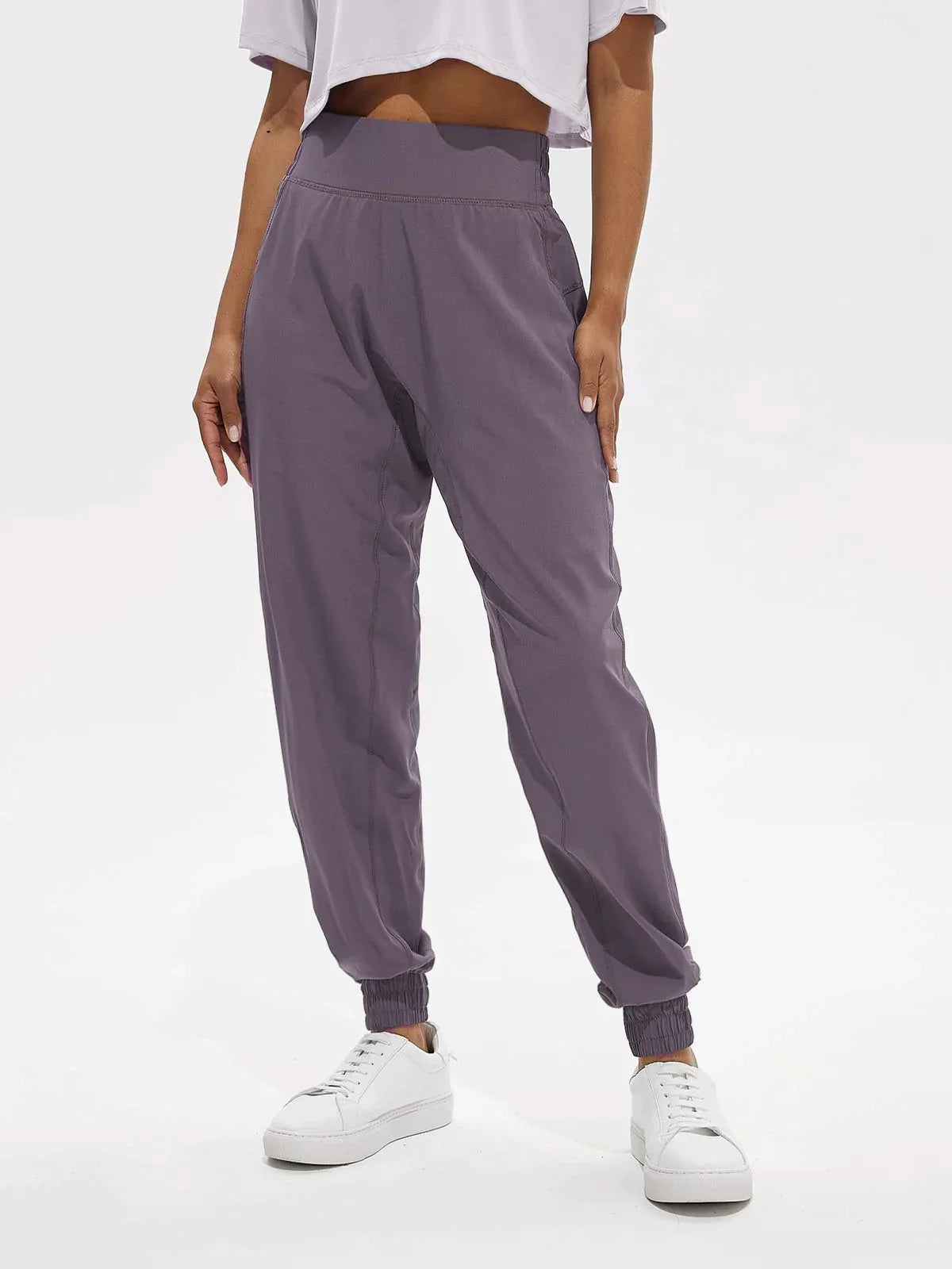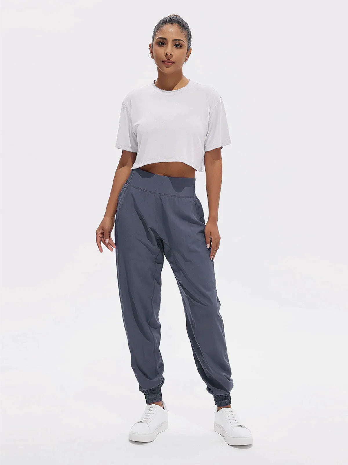 Questi sono jogger a vita alta a asciugatura rapida con una fascia elastica. Sono realizzati con un tessuto elastico e traspirante. Assicurati di sentirti comodo durante tutto l'allenamento e per tutta la giornata.