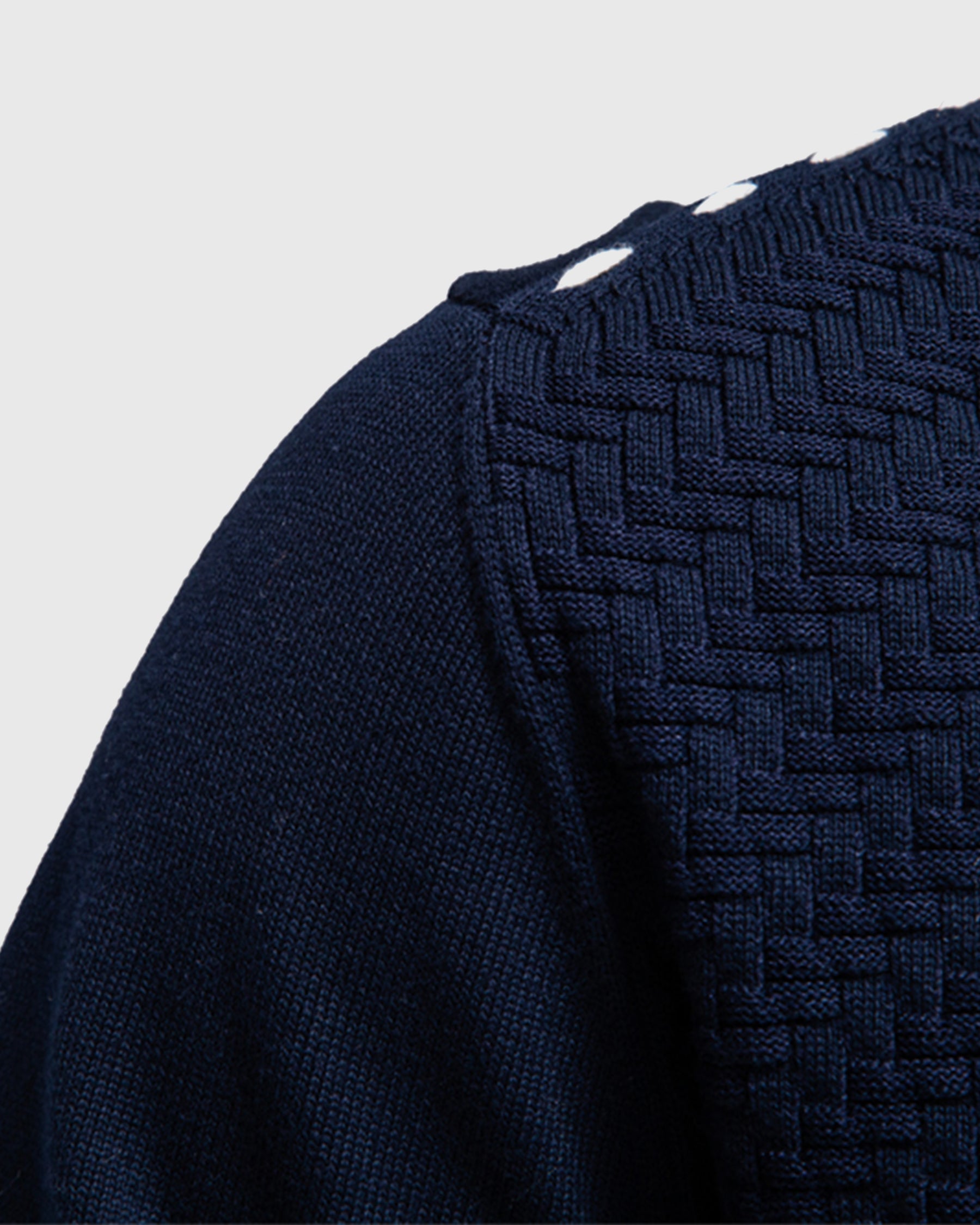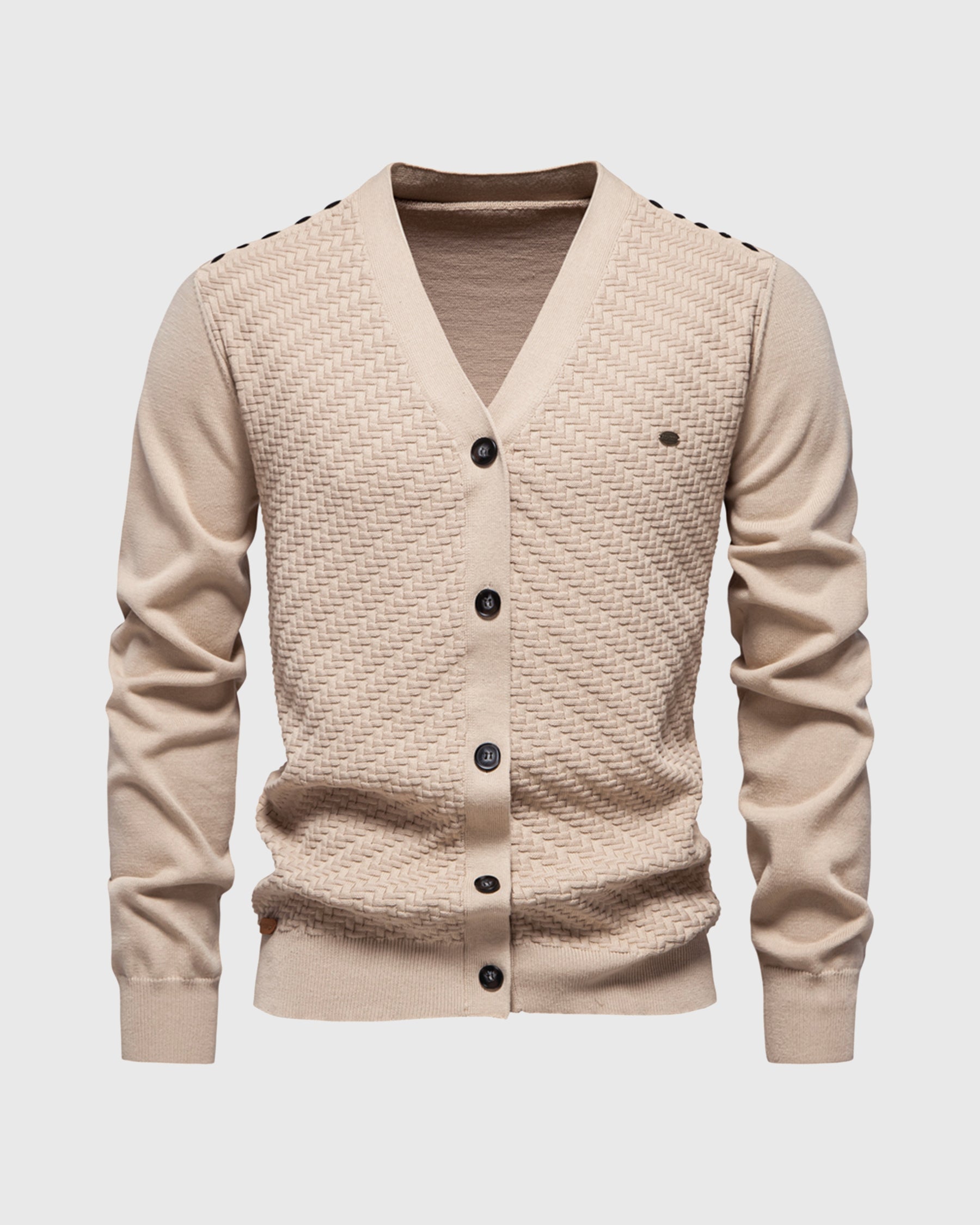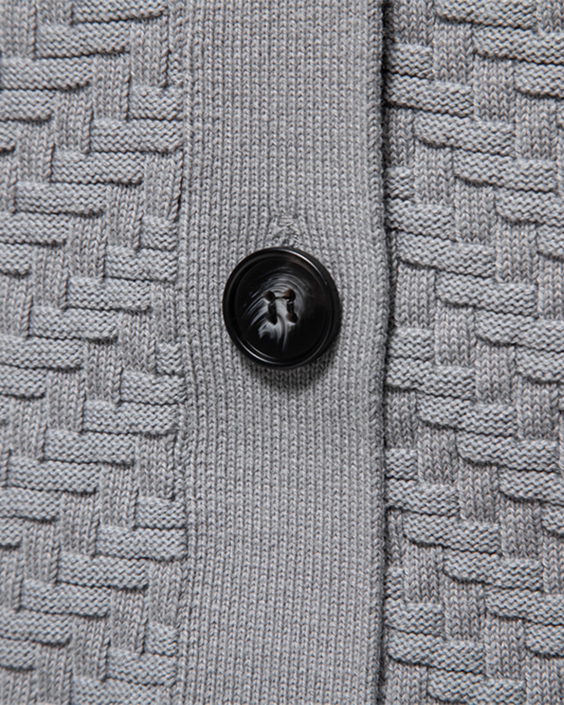 Crafted from a premium soft-touch fabric, this cardigan promises both warmth and breathability. Its unique weave pattern on the front elevates it from a basic sweater to a statement piece, while the solid sleeves maintain a clean, streamlined silhouette. The attention to detail is evident in every aspect, from the quality of the knit to the carefully chosen buttons, ans tasteful knit work on both shoulders for contrast. This cardigan is designed to withstand the test of time, both in style and durability.