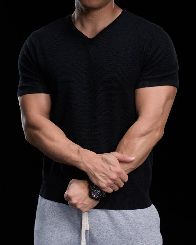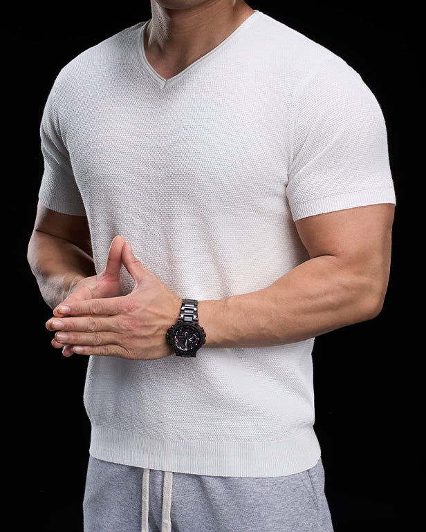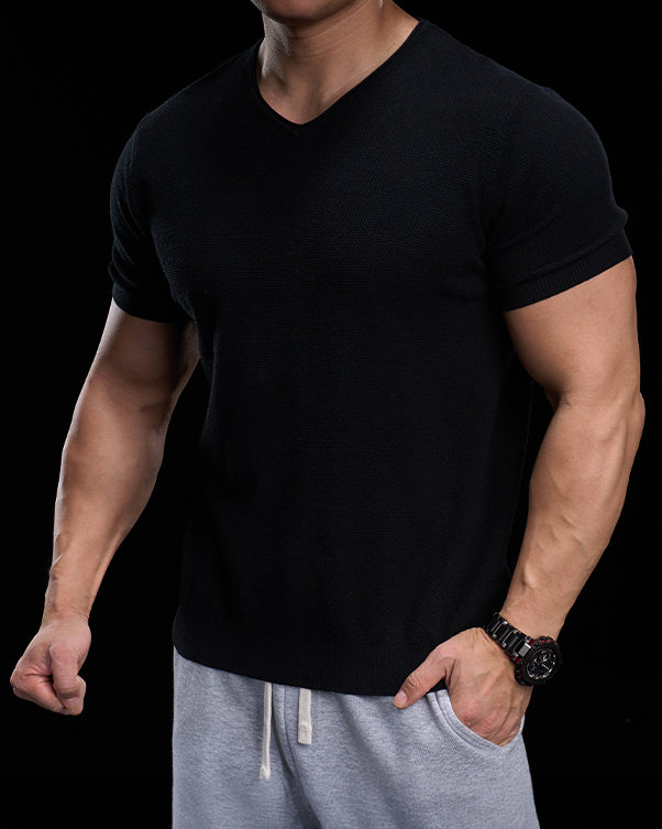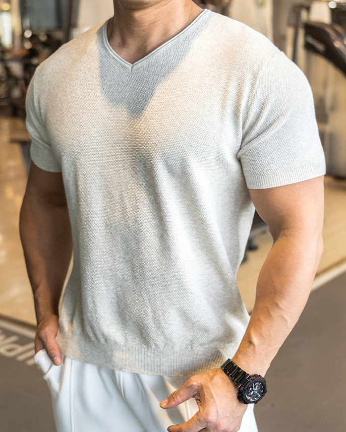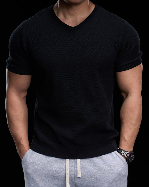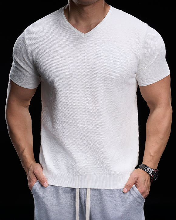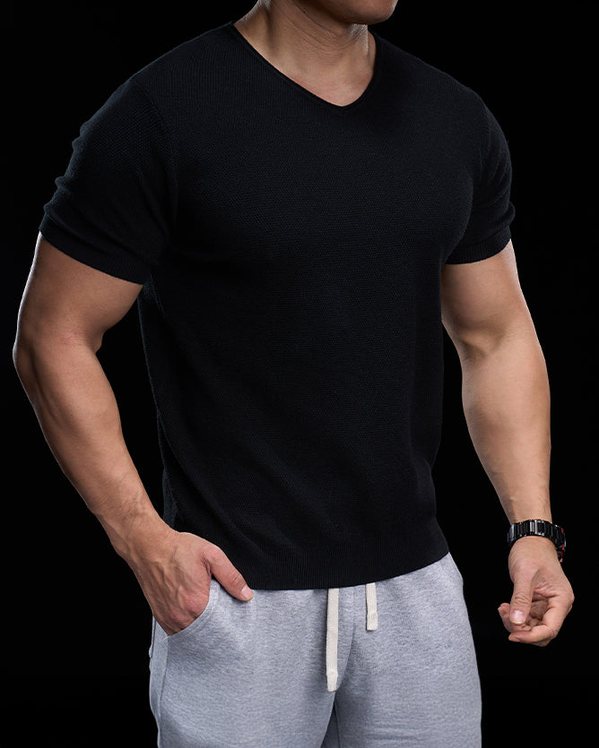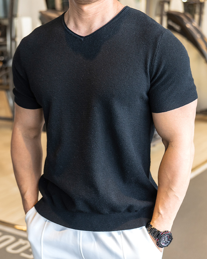 The ultimate high stretch tee that boosts your sophistication, hugs around your body, and flatters your physique! Vertical ribbed knit texture enables a even higher stretch and visual interest. The classic v-neck design makes it suitable for wearing alone and layering. It is the perfect piece for a light workout and any casual daily activities, even some smart-formal events. Its moist absorbing and quick dry fabrics ensure all-day comfort.