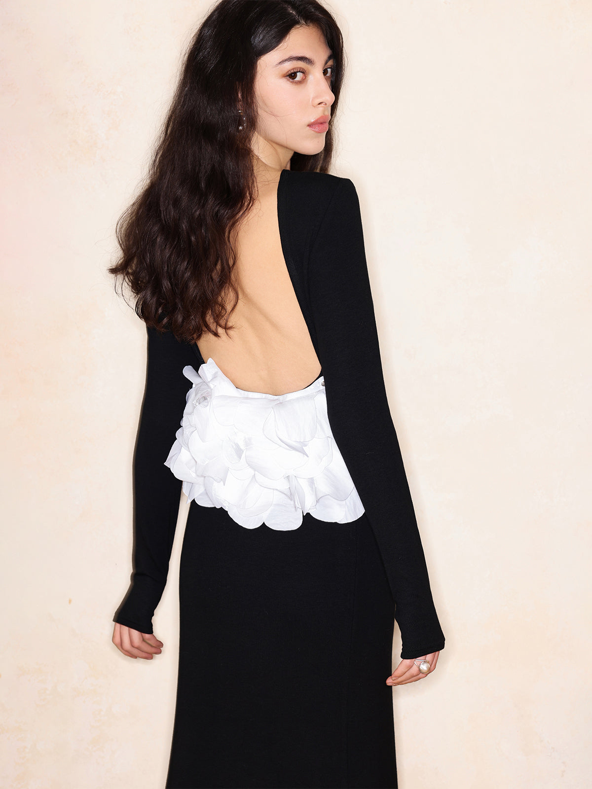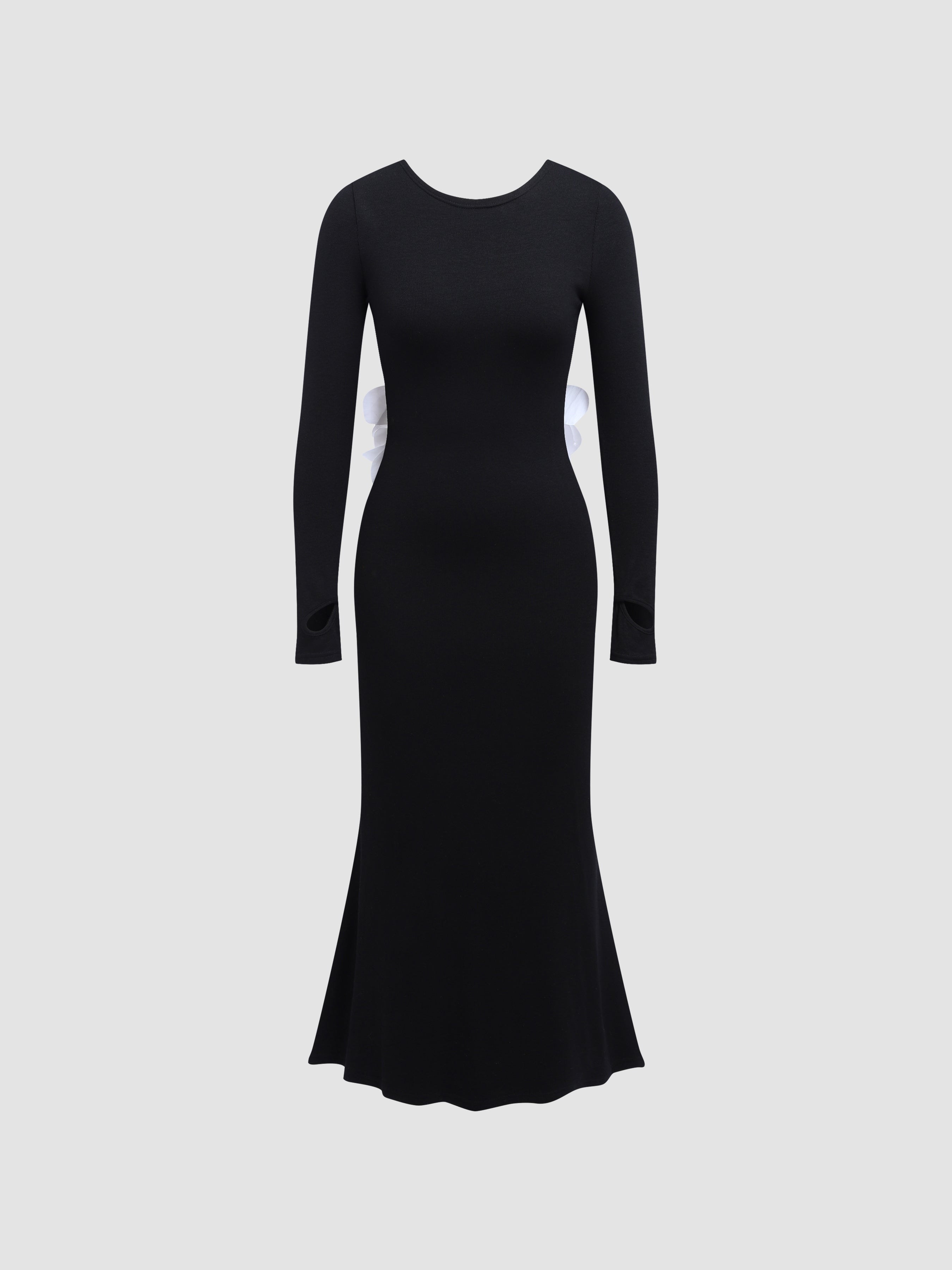 Flower-Embellished Backless Fine Ribbed Knit Dress