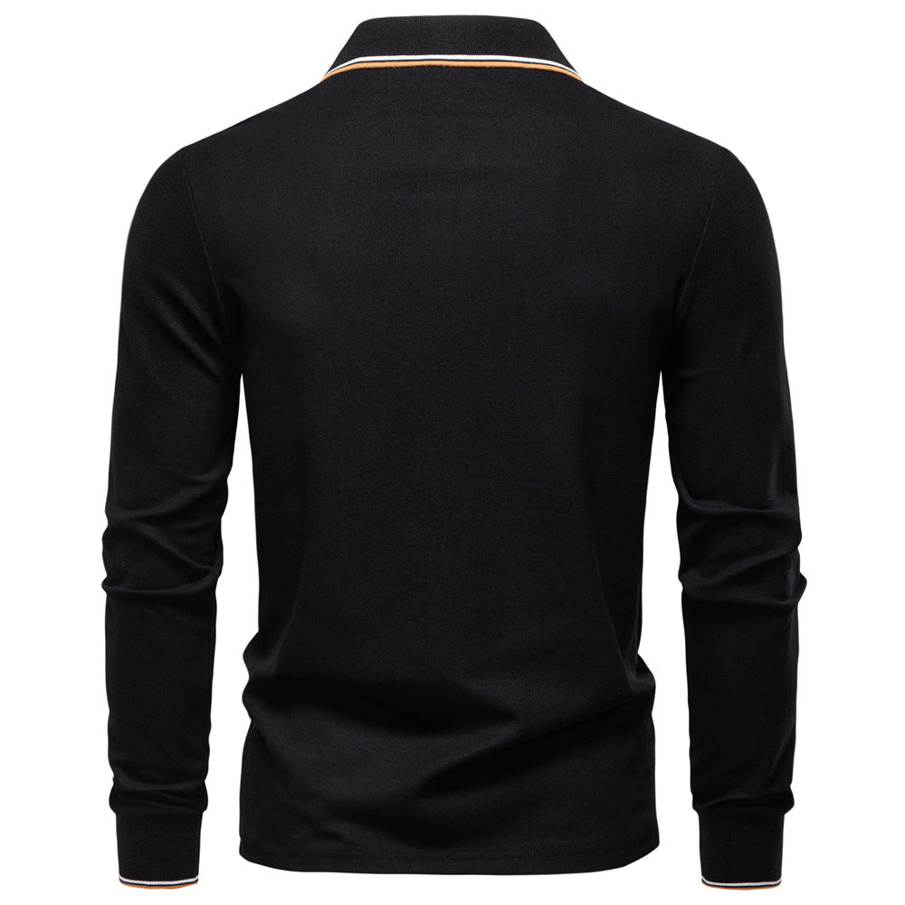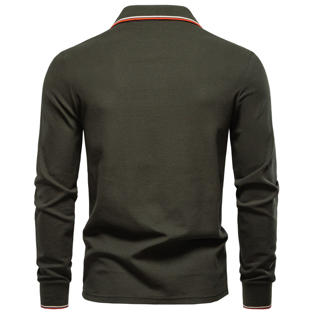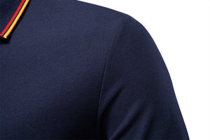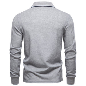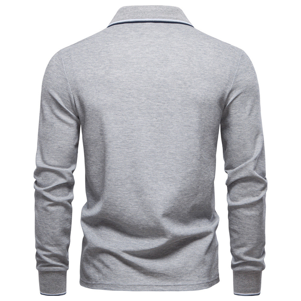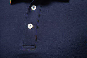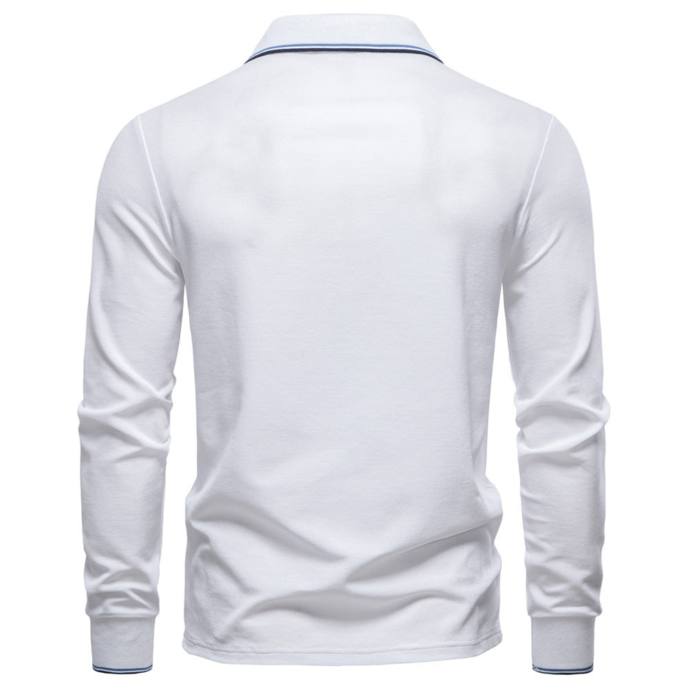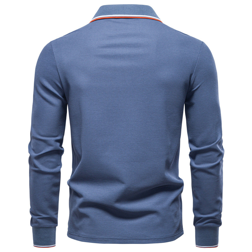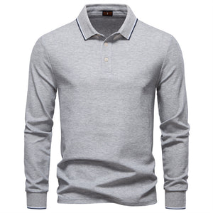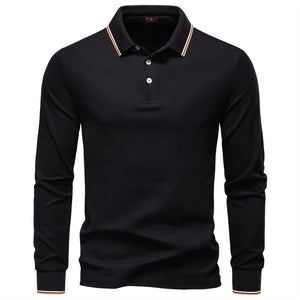 Bring sporty sophistication and everyday comfort to your wardrobe with this cotton-blend long sleeve polo. Crafted from a soft and breathable cotton-polyester fabric, it combines the natural comfort of cotton with the durability and easy care of polyester. The stripe-trimmed collar and cuffs add a subtle pop of color, elevating this timeless design with a modern touch. Perfect for work, weekend outings, or casual evenings, this polo offers versatile style for any occasion.