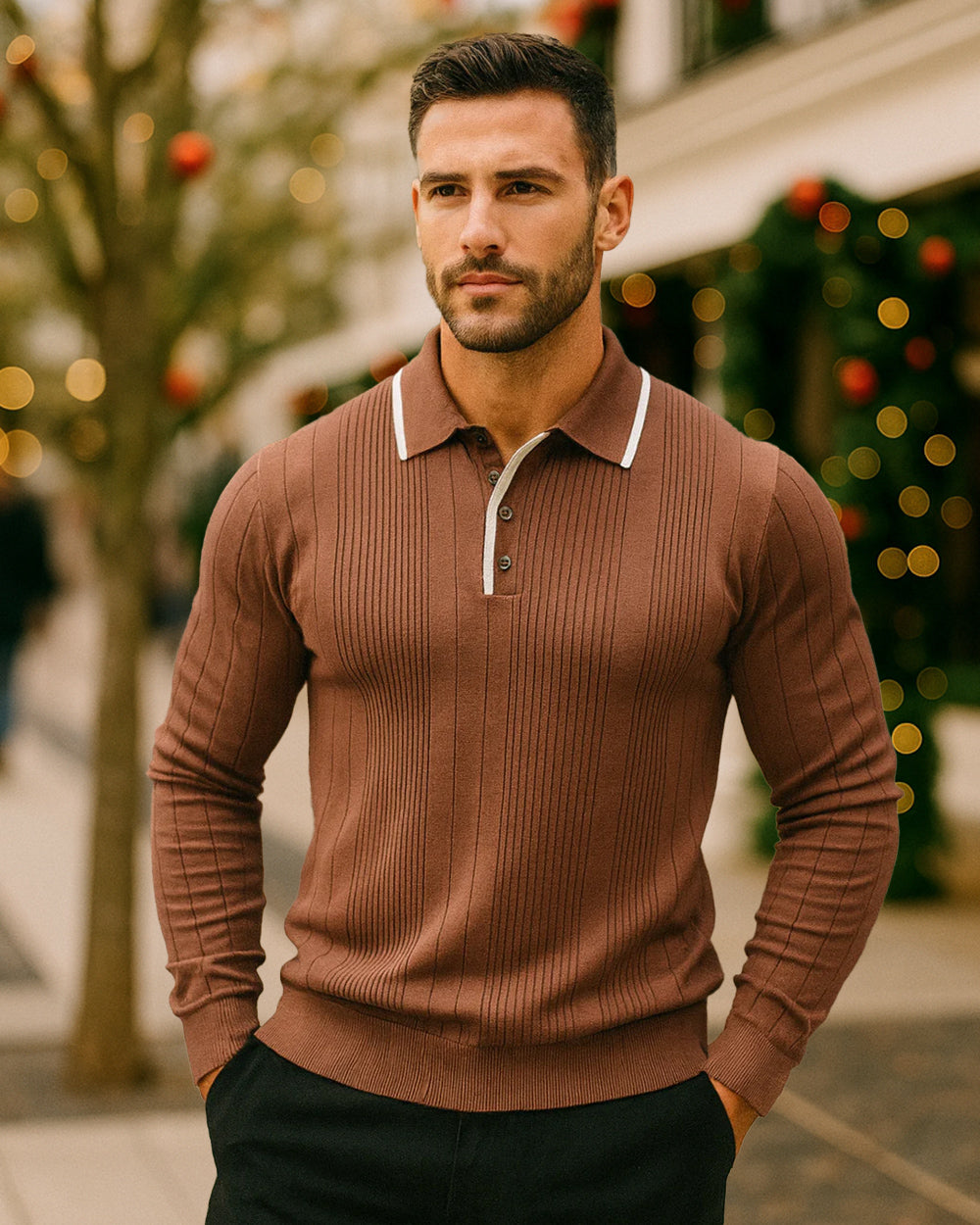 Elevate your everyday style with this ribbed knit polo sweater, designed for a refined yet comfortable look. Featuring a classic button-down polo collar and vertical rib texture, it combines timeless sophistication with modern comfort. Perfect for layering or wearing on its own, this piece transitions effortlessly from work to weekend.